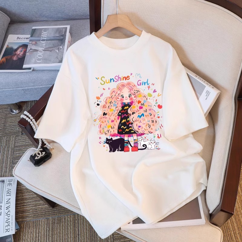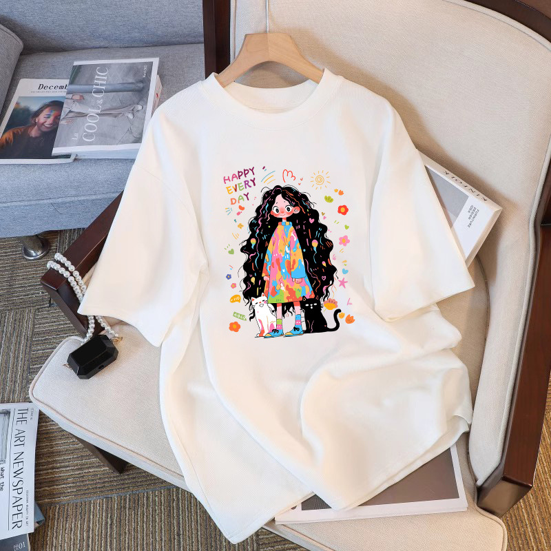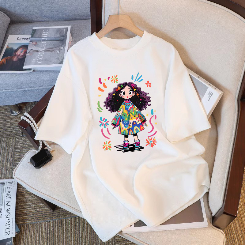딸 아동복 화이트 퓨어 코튼 반팔 티셔츠 여름 느슨한 스타일러스 프린트 반소매 탑 큰 아이와 아기 학생스토어 가기