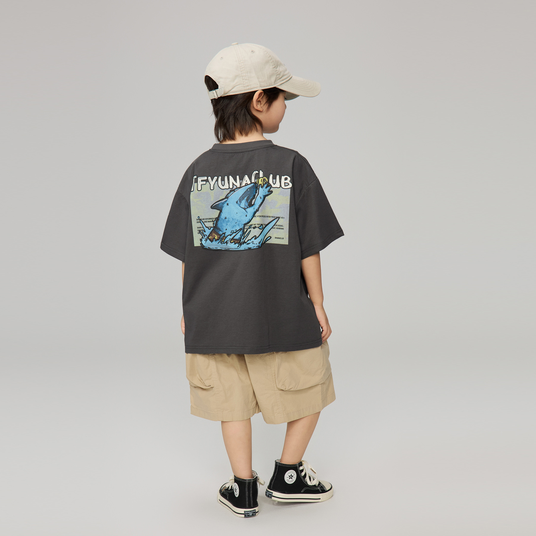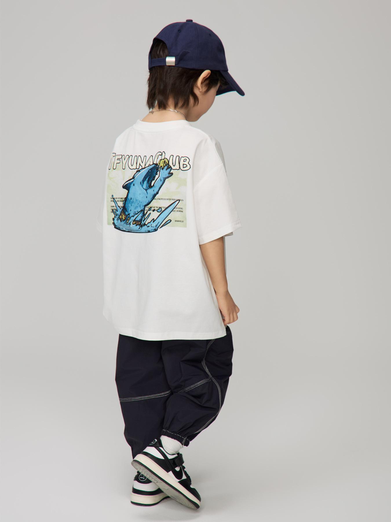 2025 년 여름 아동복 새로운 어린이 재미 상어 인쇄 반팔 남성 중 큰 어린이 느슨한 캐주얼 라운드 넥 티셔츠스토어 가기