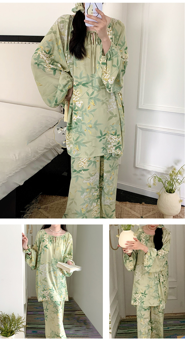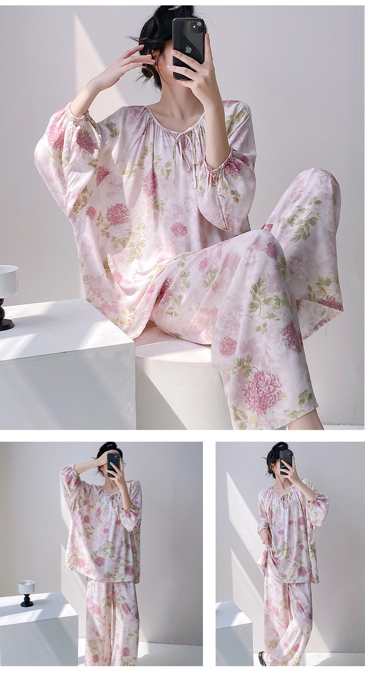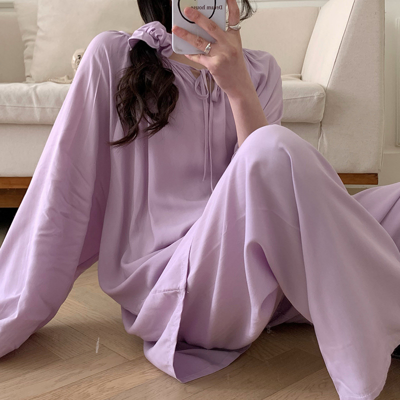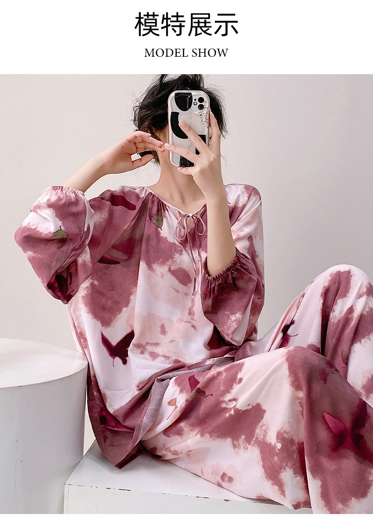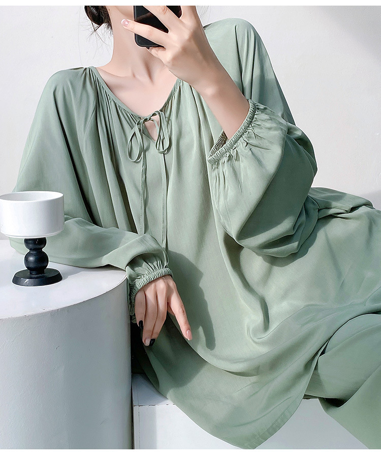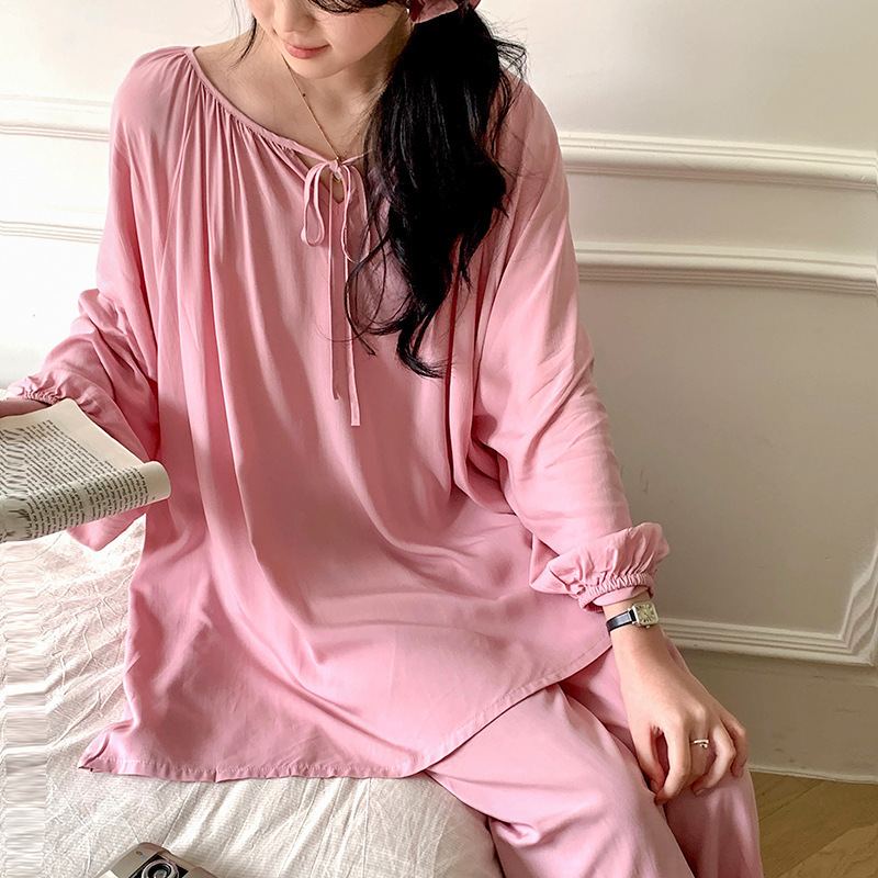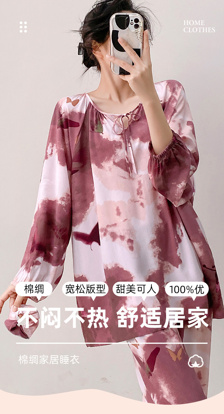 25 개의 새로운 잠옷 여성의 봄과 가을 면화 실크 긴 소매 단색 느슨한 200 진 홈웨어 여름 얇은 아우터 파자마