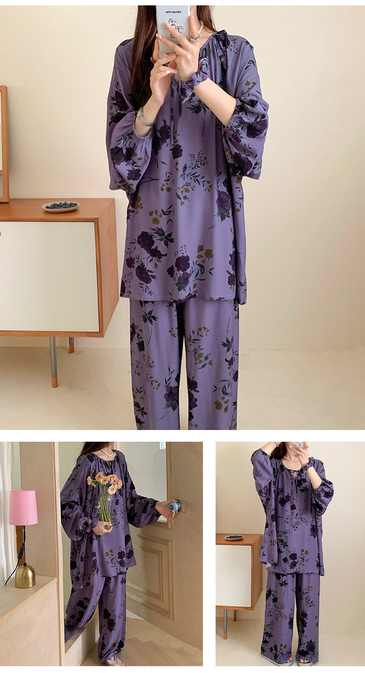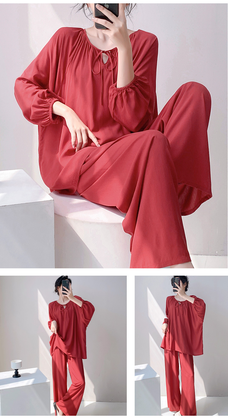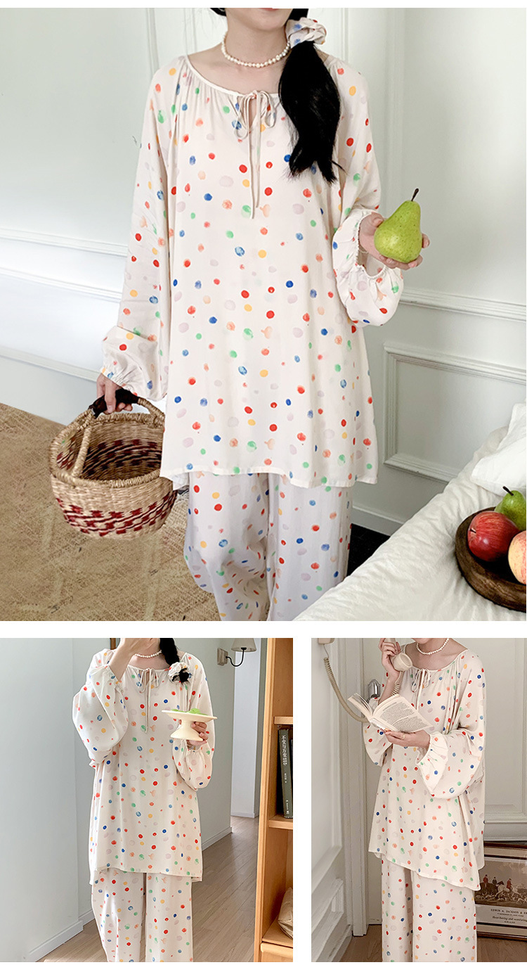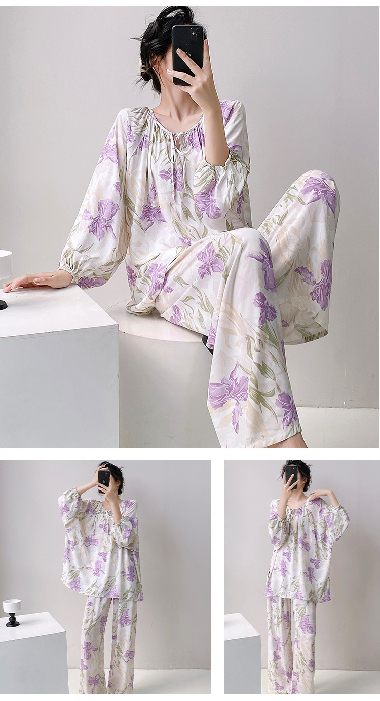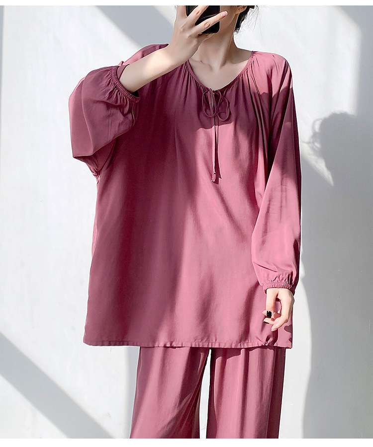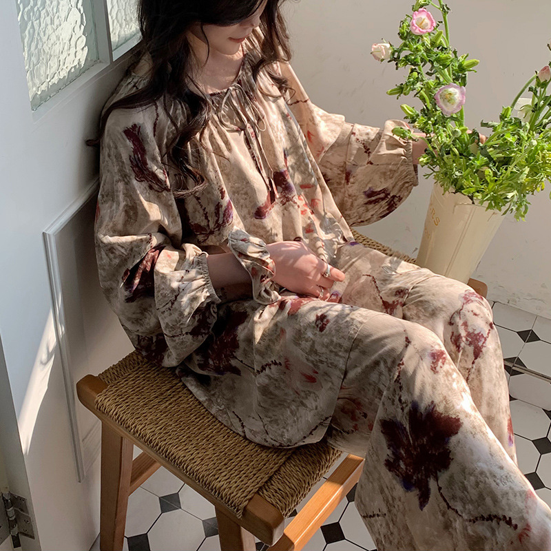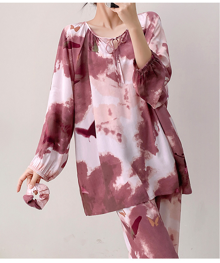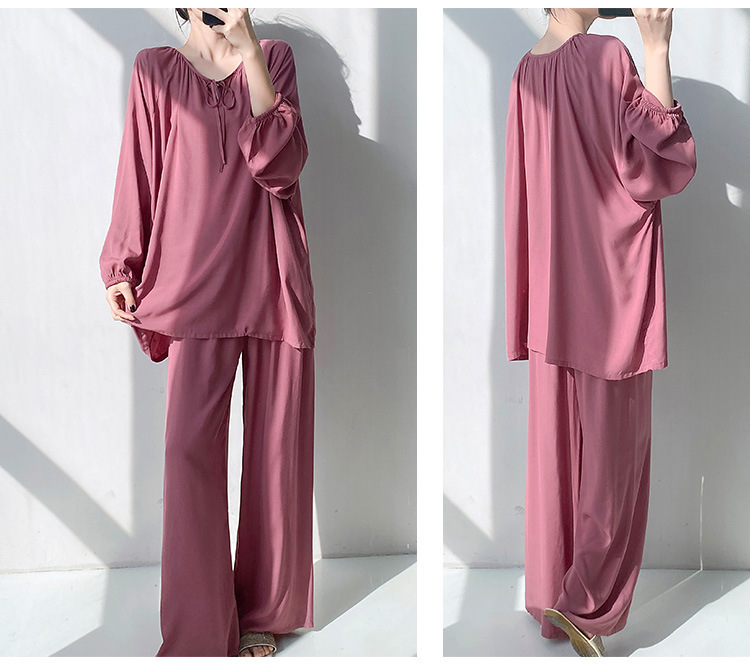 25 개의 새로운 잠옷 여성의 봄과 가을 면화 실크 긴 소매 단색 느슨한 200 진 홈웨어 여름 얇은 아우터 파자마