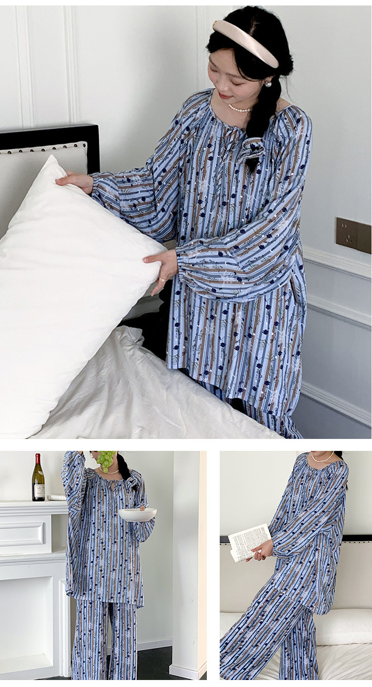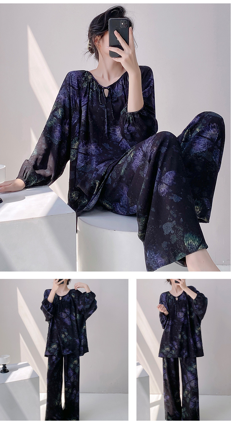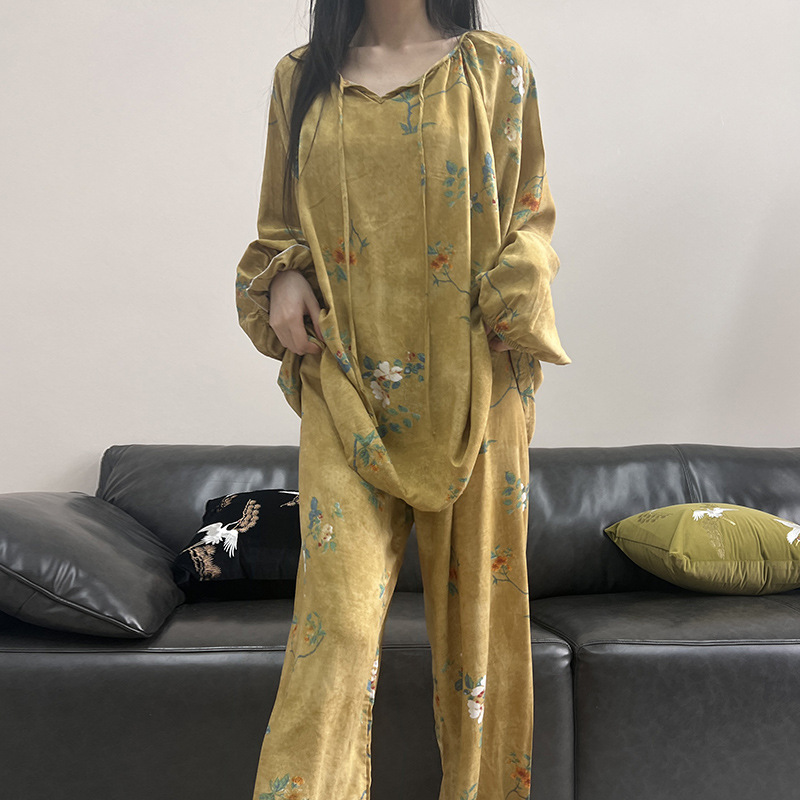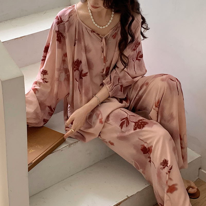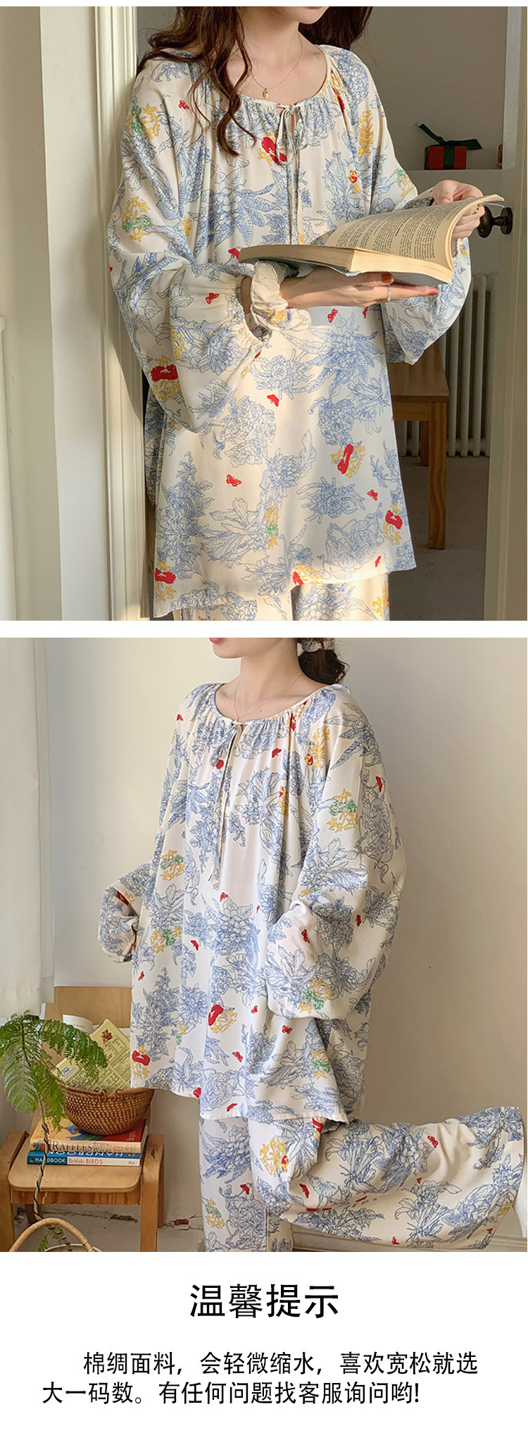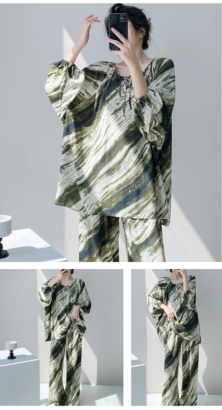 25 개의 새로운 잠옷 여성의 봄과 가을 면화 실크 긴 소매 단색 느슨한 200 진 홈웨어 여름 얇은 아우터 파자마