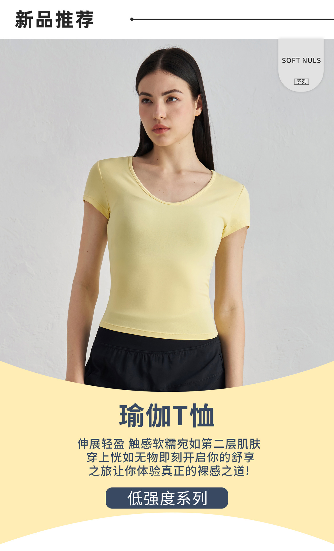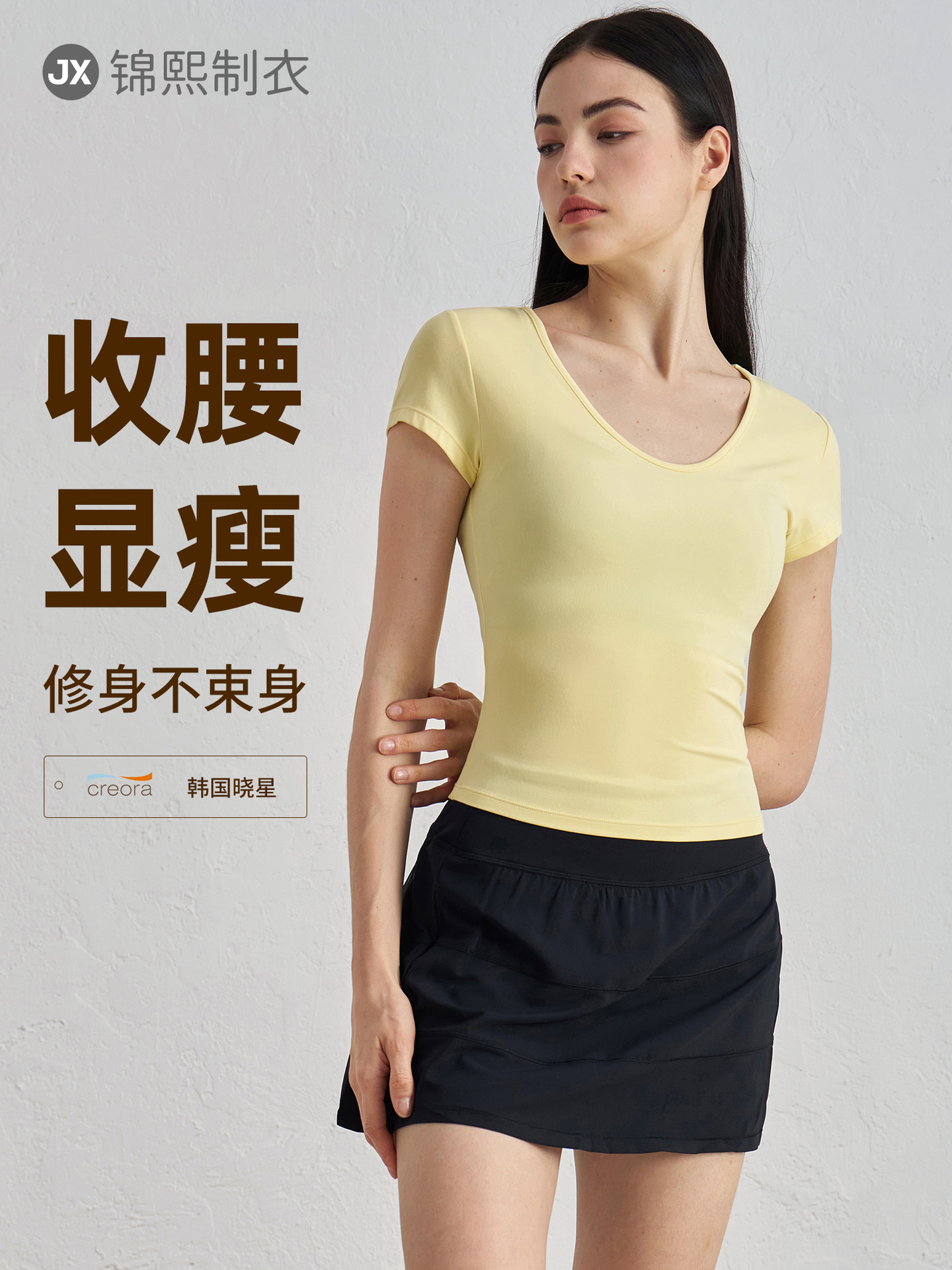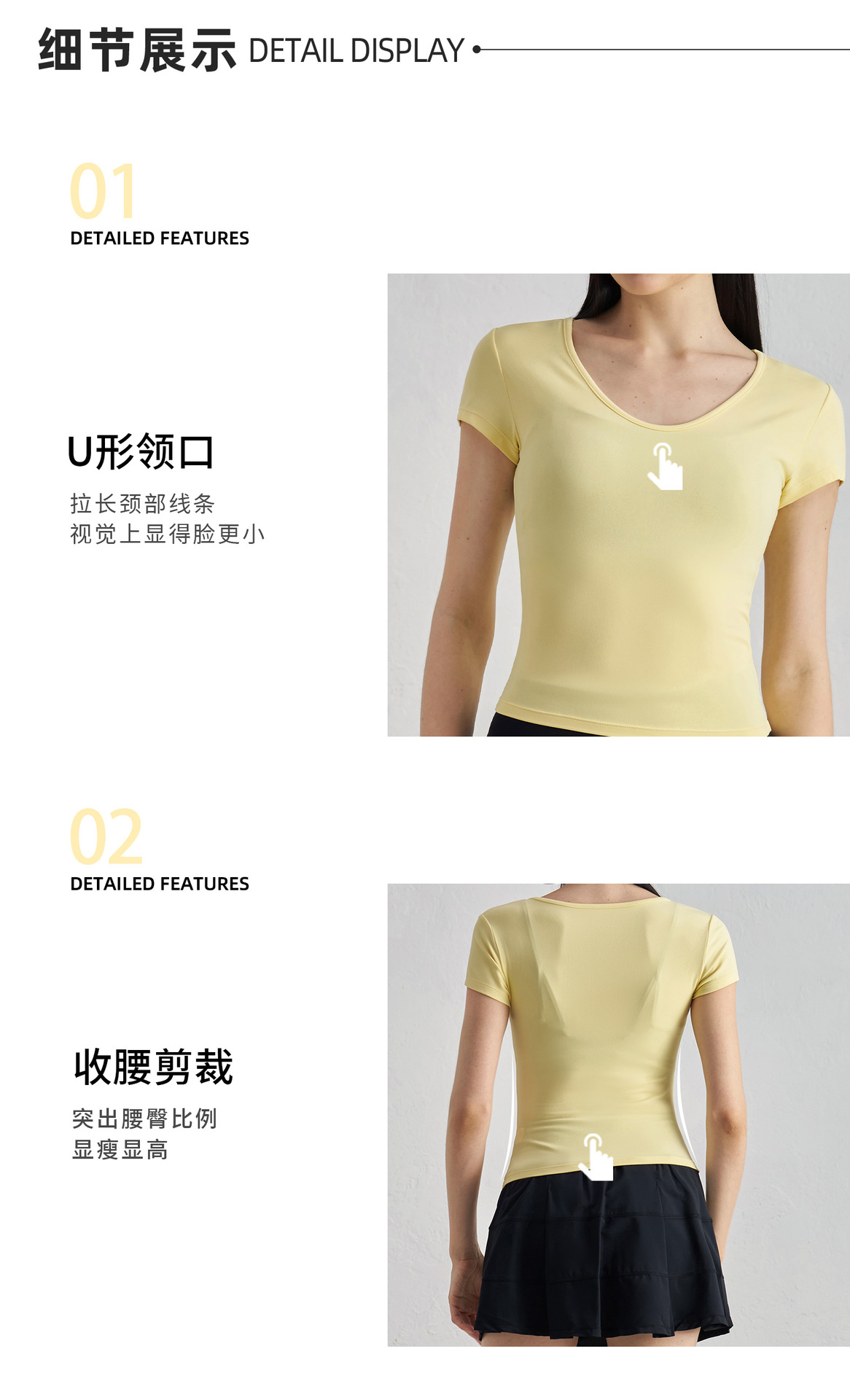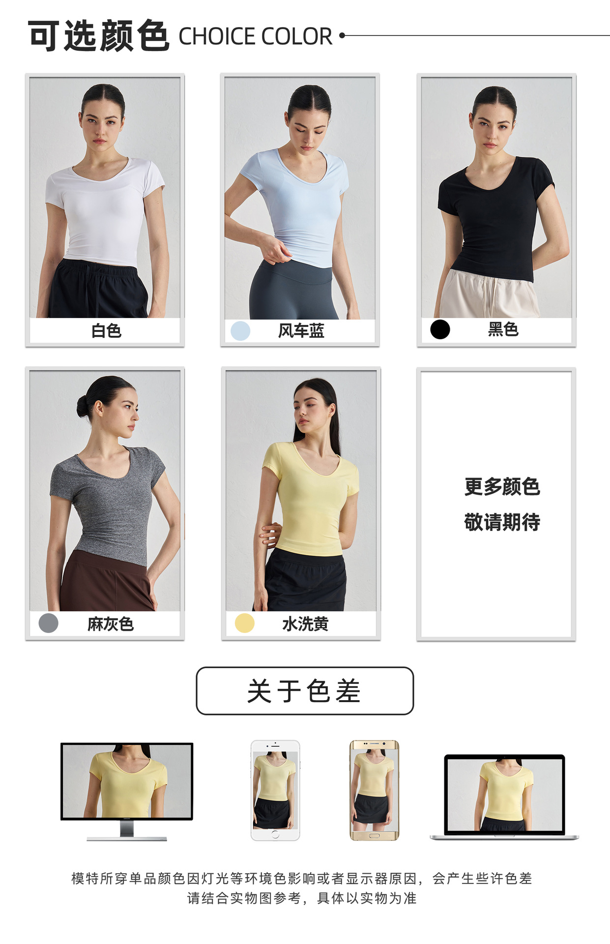 여성을 위한 여름 U넥 편안한 요가복, 허리를 잘록하게 잡아주는 슬림핏 짧은 요가 T, 패셔너블하고 심플하며 고급스러운 반팔 상의스토어 가기