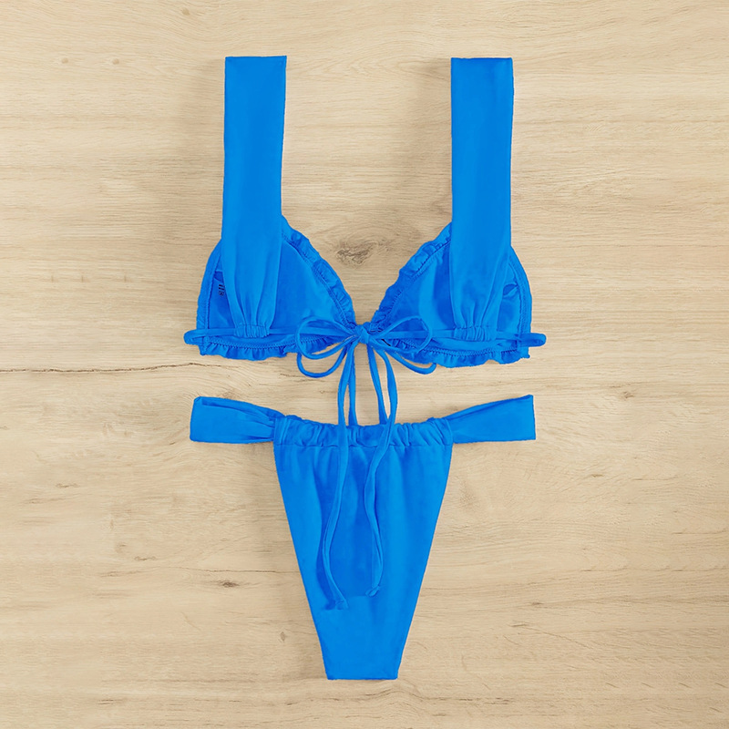 2024新款速卖通欧美纯色分体泳衣女款时尚荷叶边性感比基尼游泳装