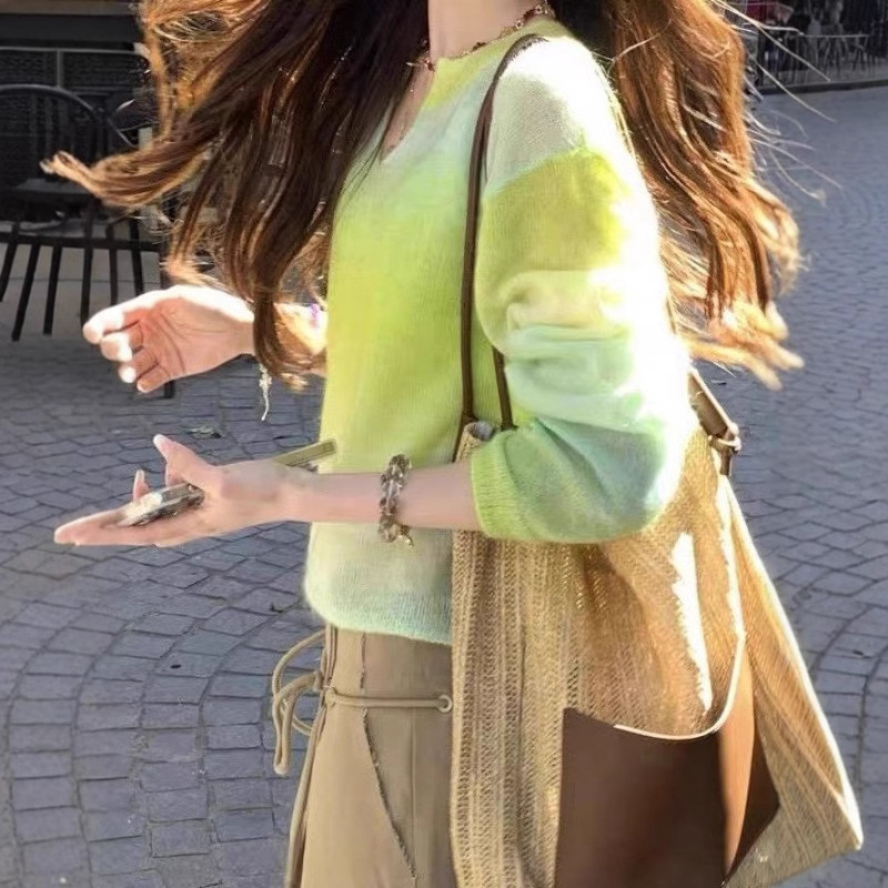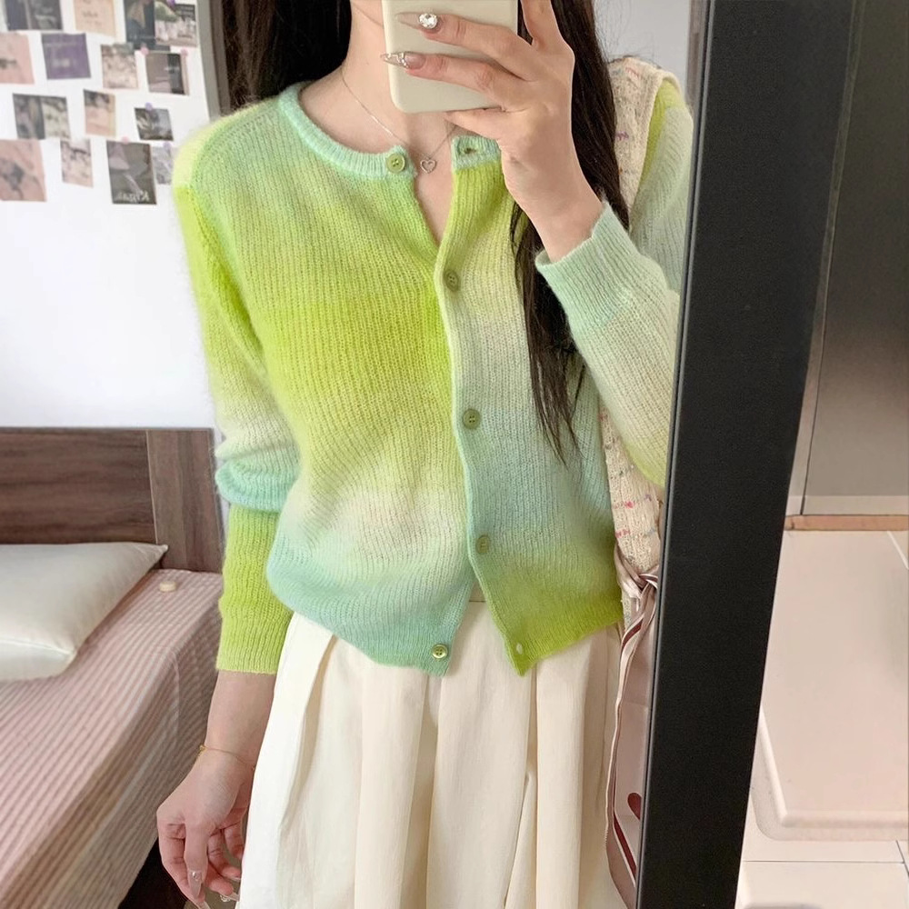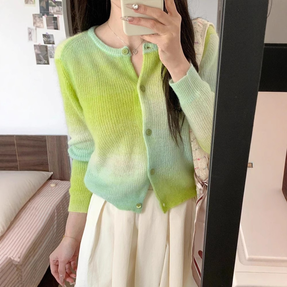 YUNSHU 한국식 그라디언트 대비 얇은 스웨터 여성의 봄과 가을 모헤어 연령 감소 둥근 목 니트 카디건 탑스토어 가기