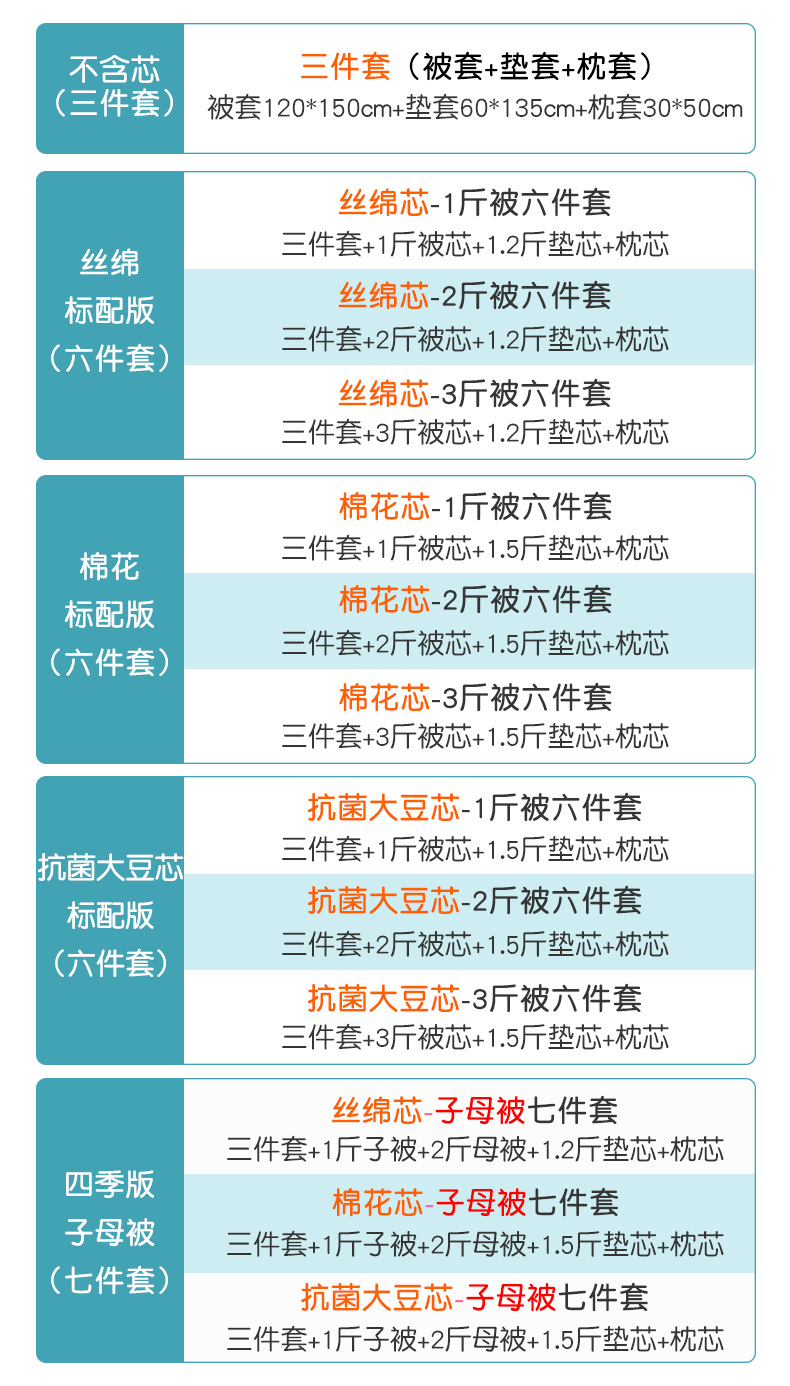 • 6종 세트[ 1.5kg 실크 퀼트 코어]에는 핸드백이 포함되어 있습니다.