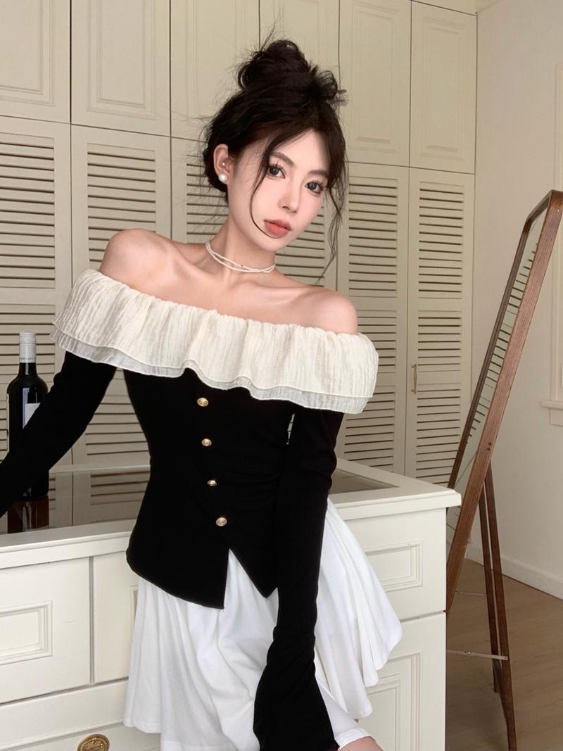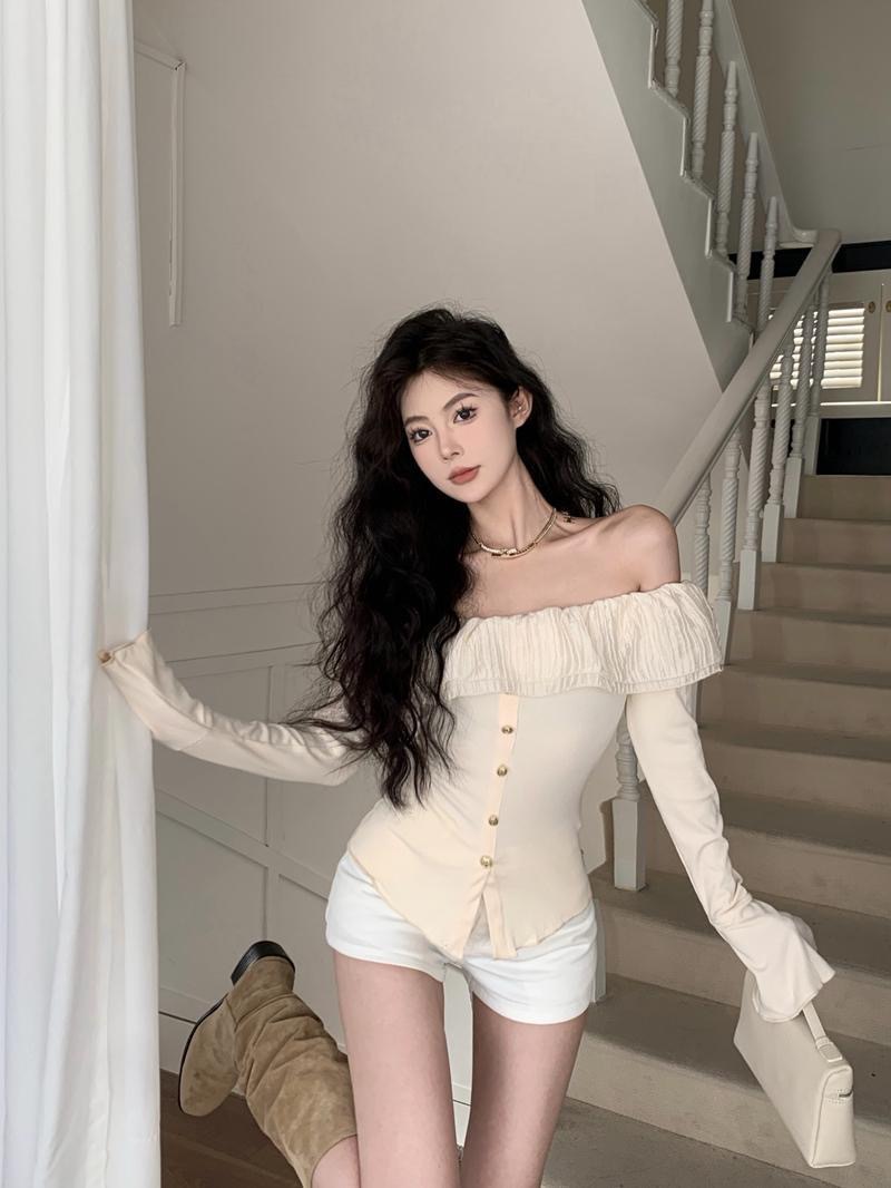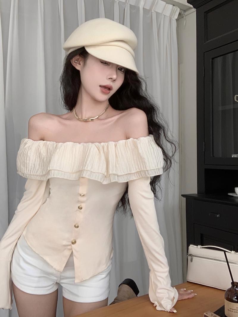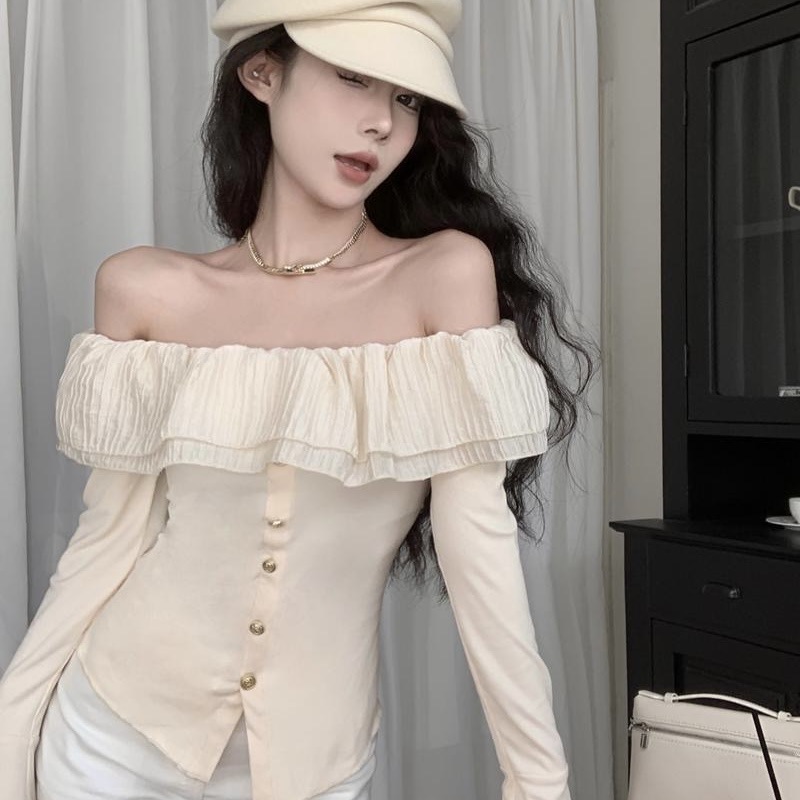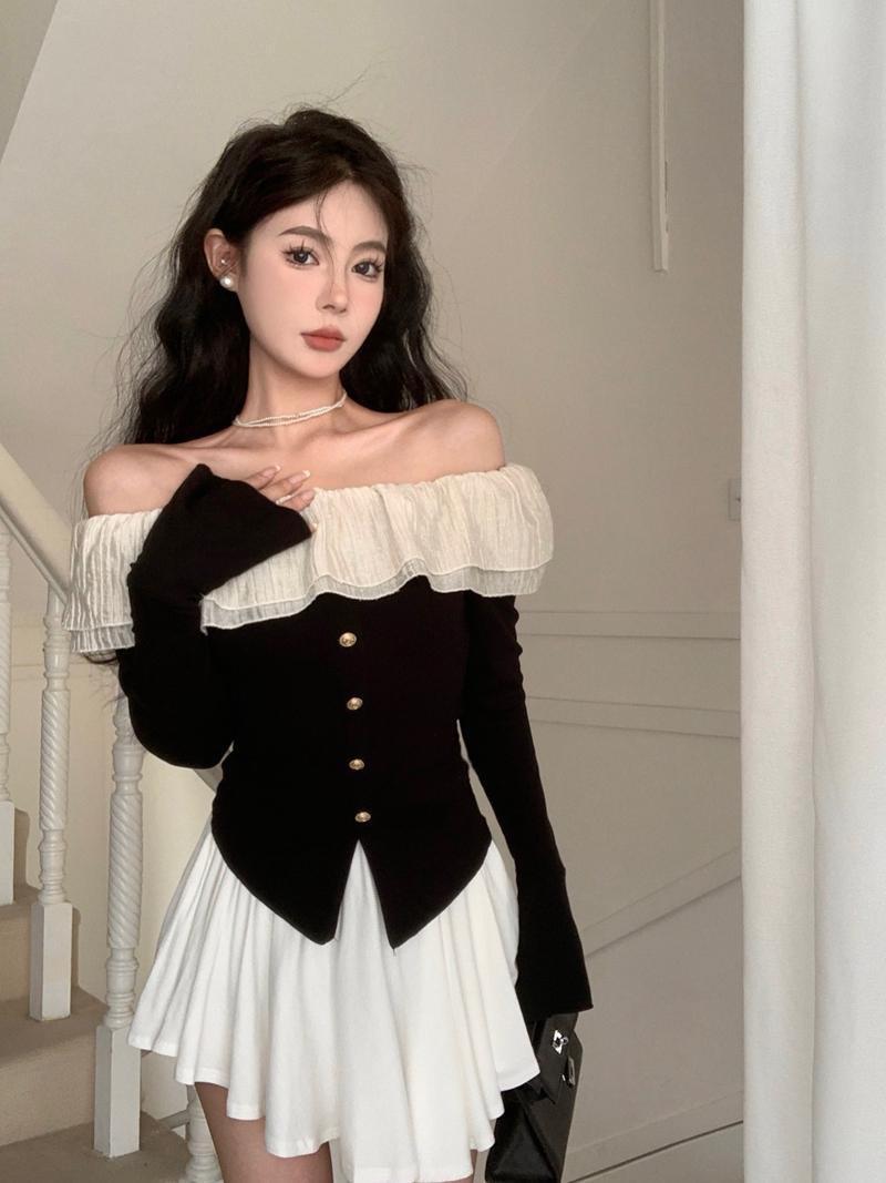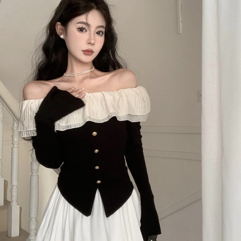 순수한 프랑스 어깨 긴팔 니트 스웨터 여성의 봄과 가을 주름진 디자인 센스 슬림 핏 슬리밍 세련된 탑스토어 가기