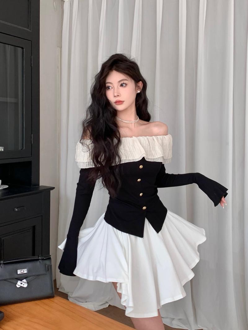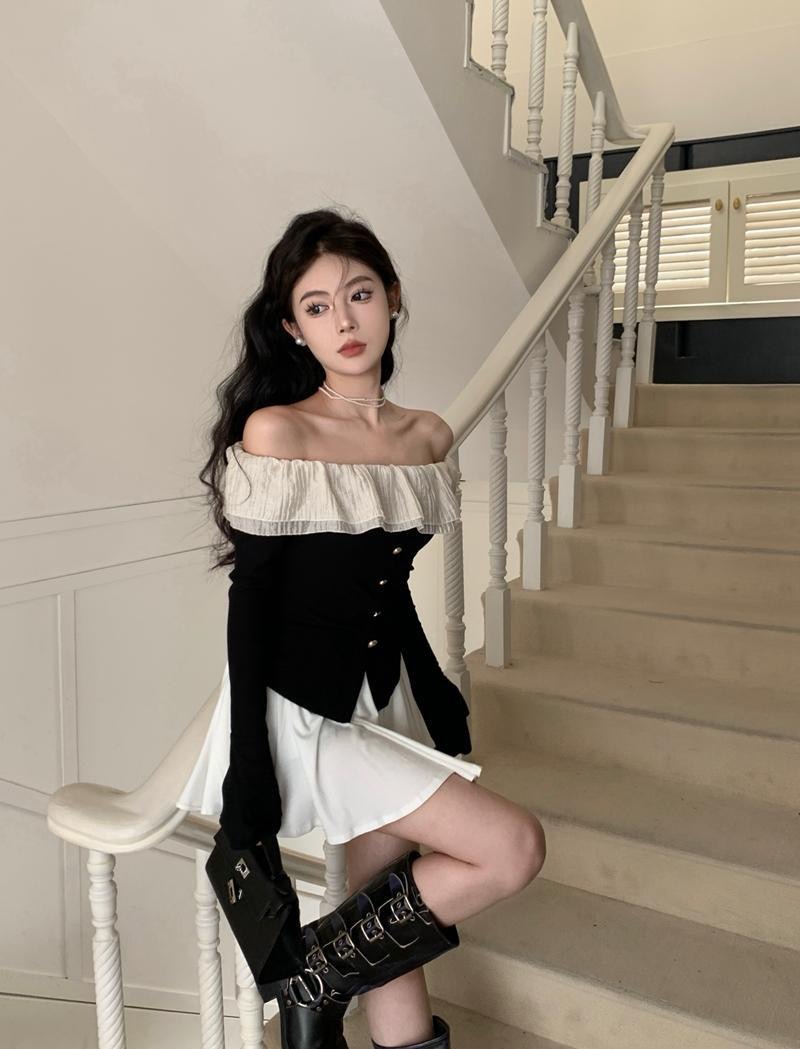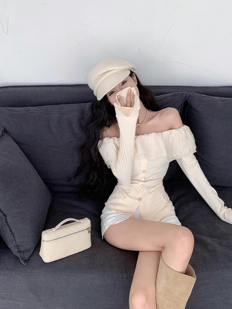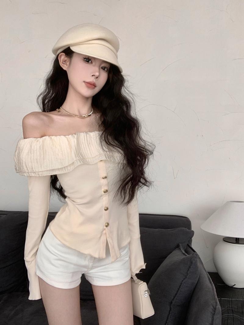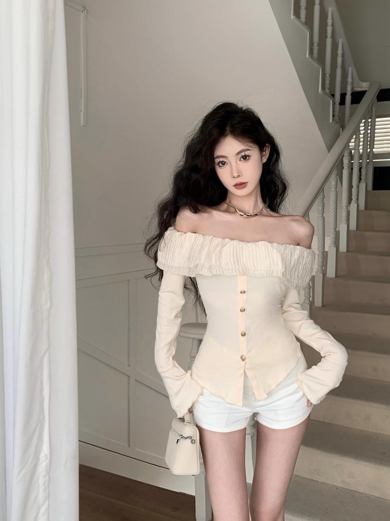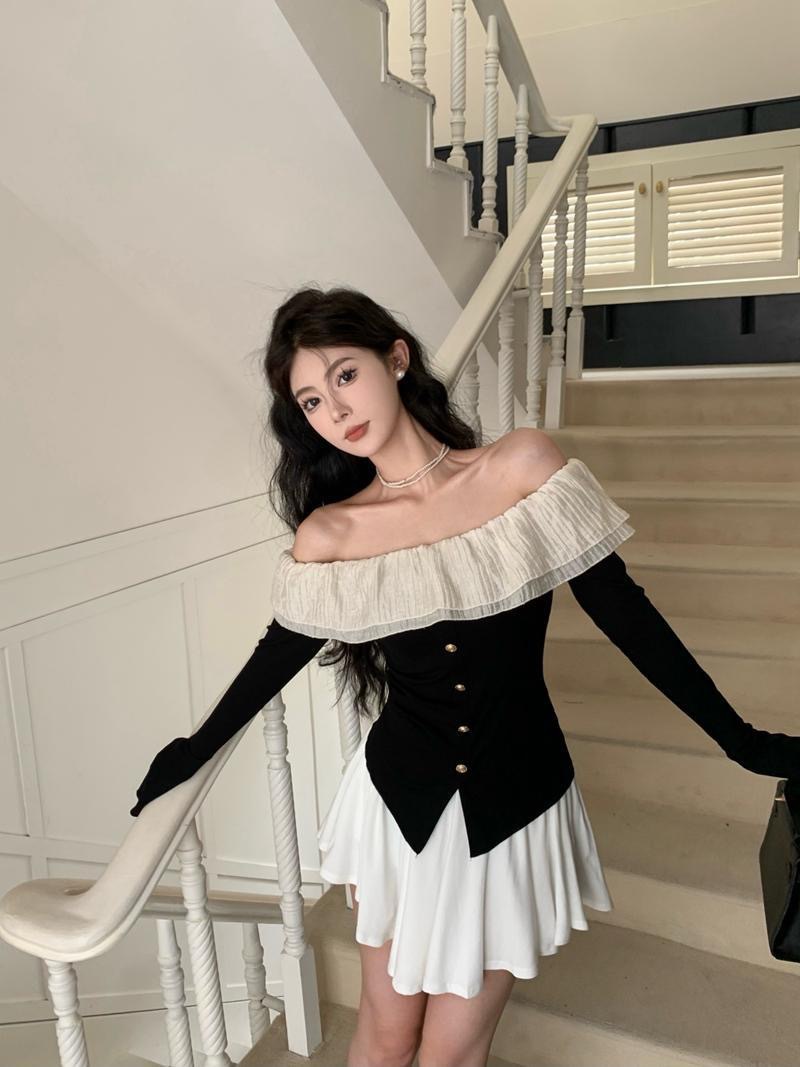 순수한 프랑스 어깨 긴팔 니트 스웨터 여성의 봄과 가을 주름진 디자인 센스 슬림 핏 슬리밍 세련된 탑스토어 가기