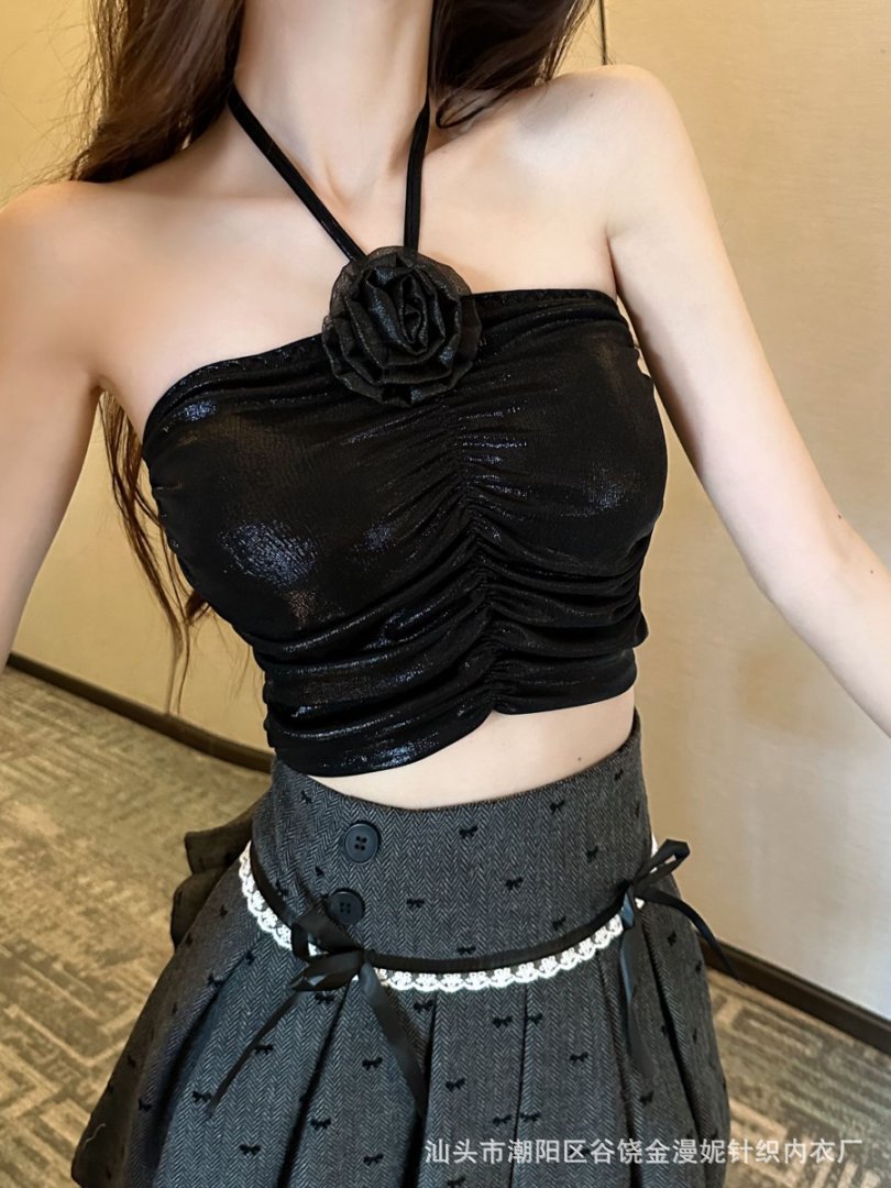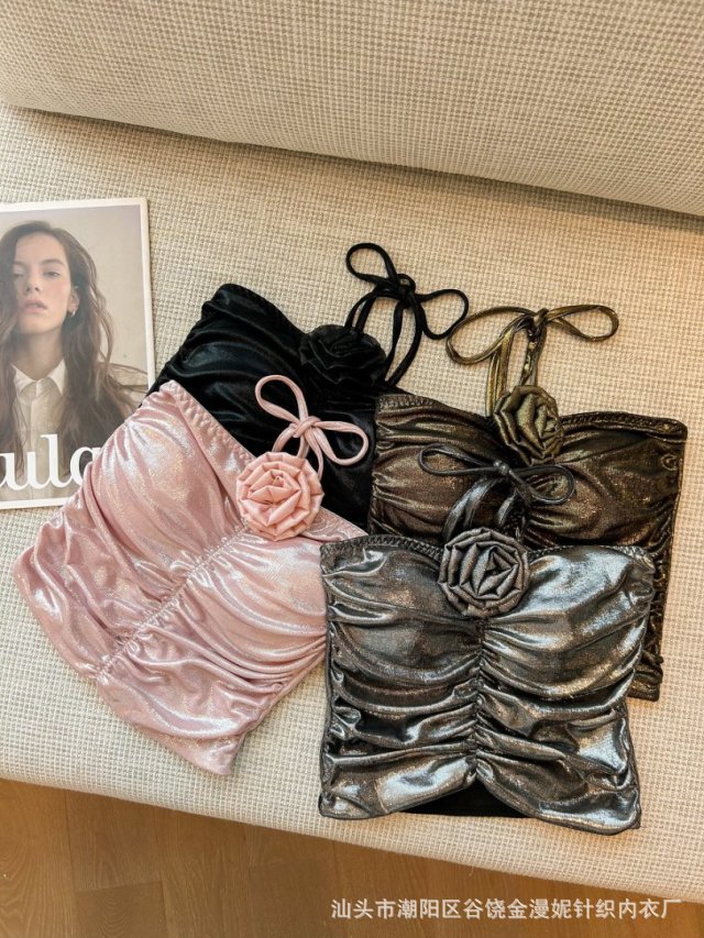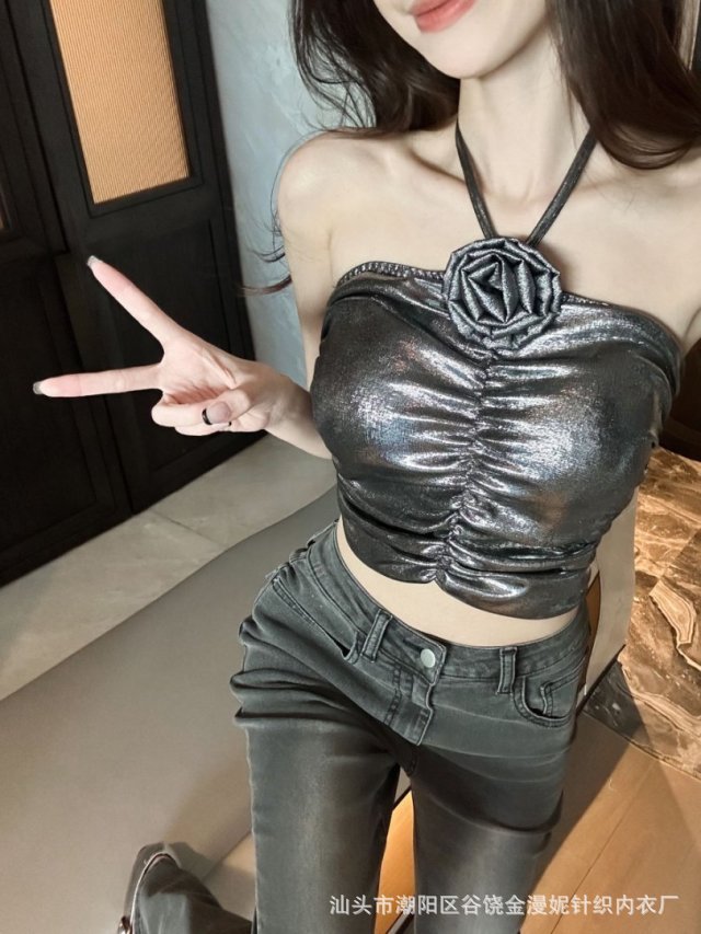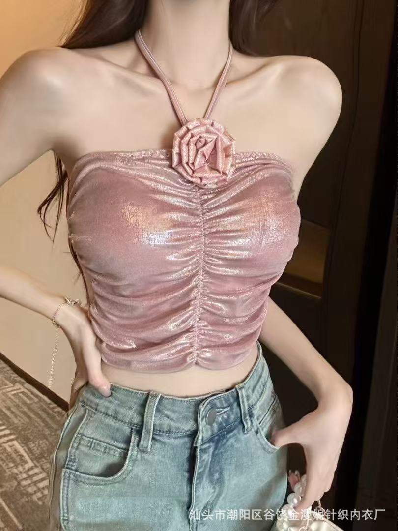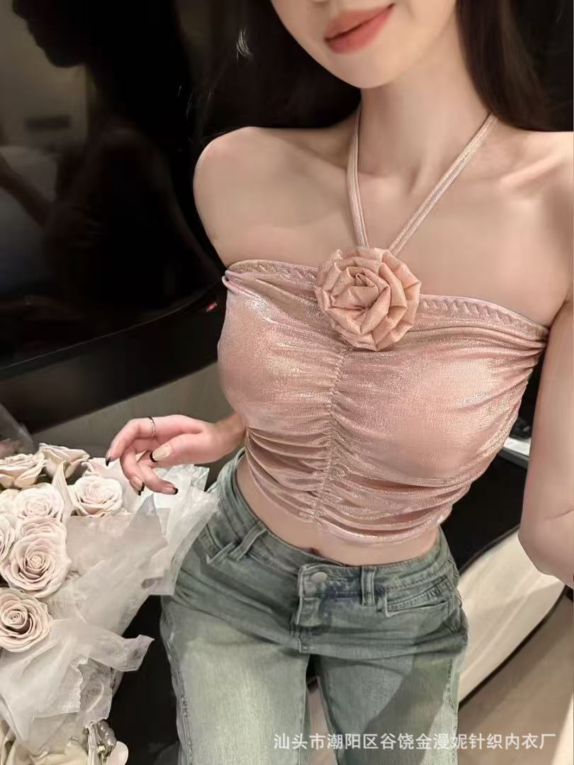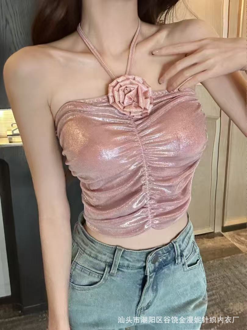 여성을위한 순수한 욕망 스타일 섹시한 광택 주름 꽃 탑 봄, 여름 새로운 유행 스타일 슬림 홀터넥 캐미솔스토어 가기