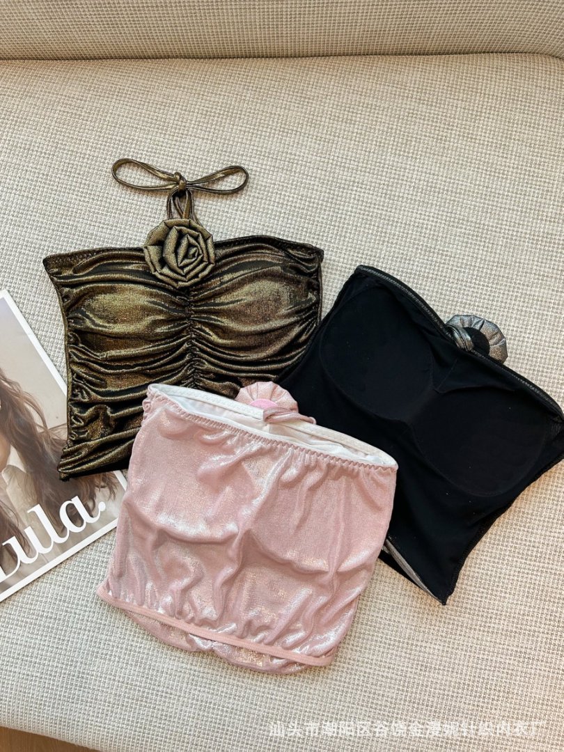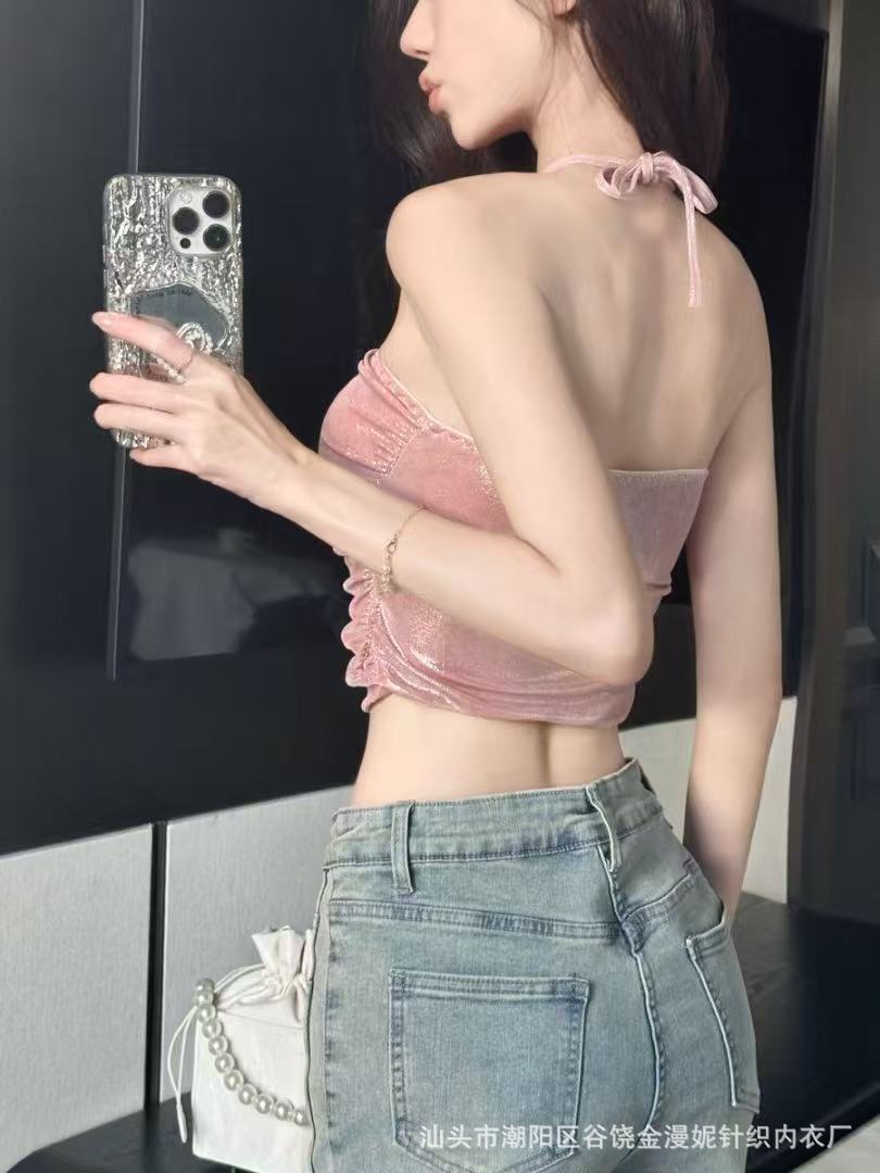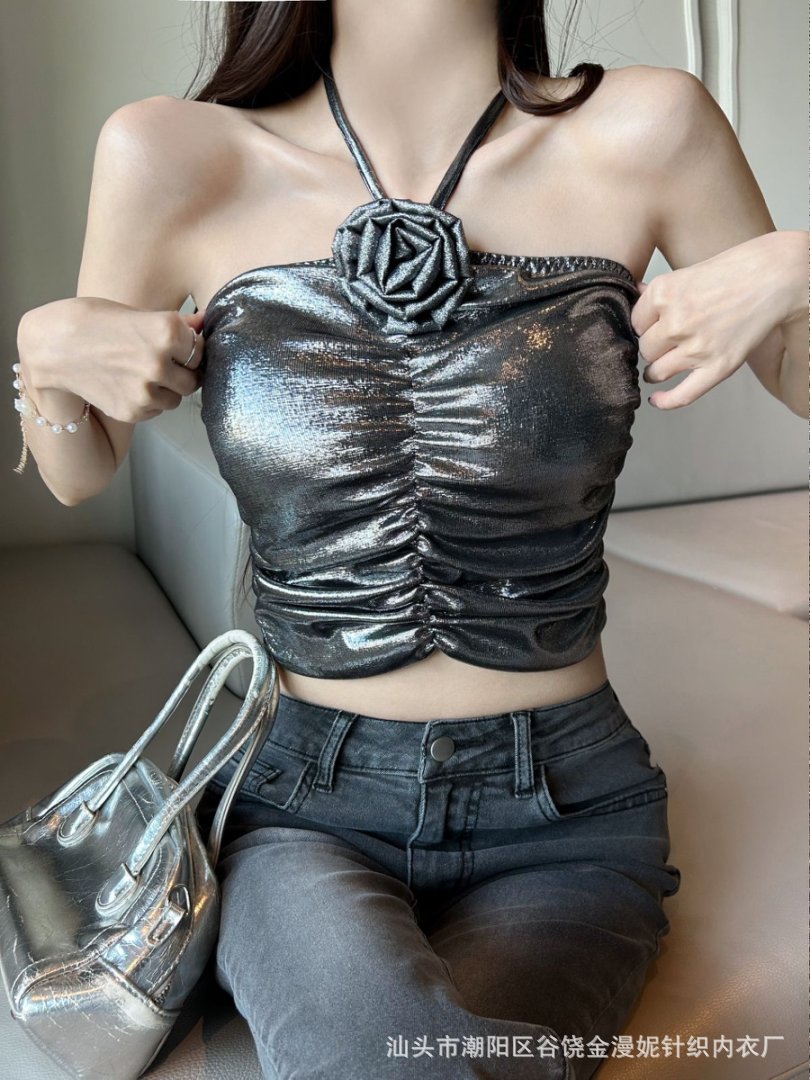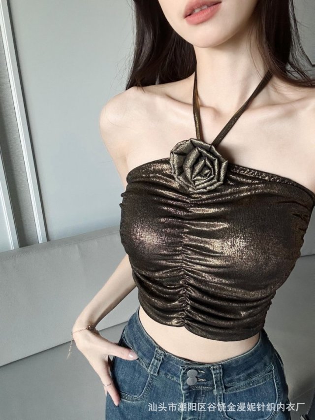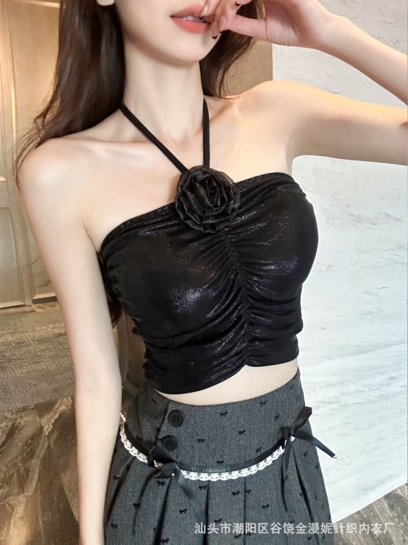여성을위한 순수한 욕망 스타일 섹시한 광택 주름 꽃 탑 봄, 여름 새로운 유행 스타일 슬림 홀터넥 캐미솔스토어 가기