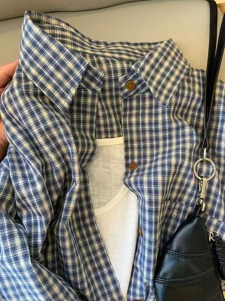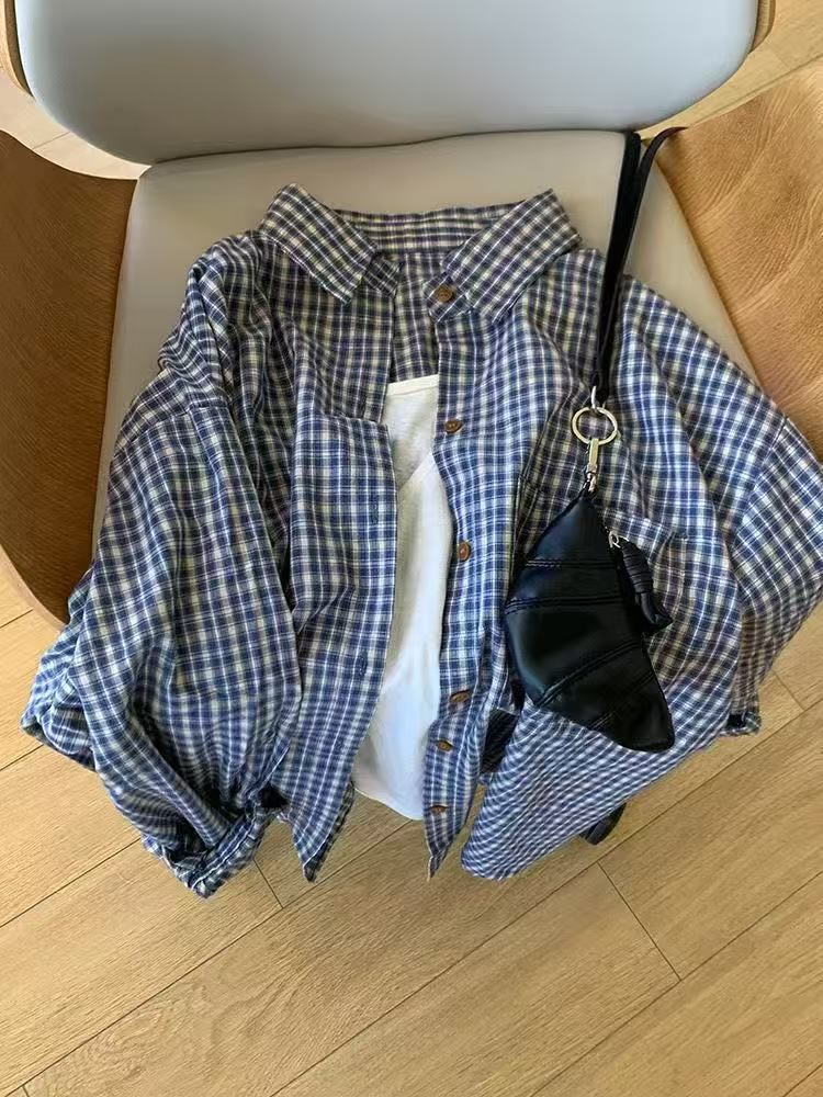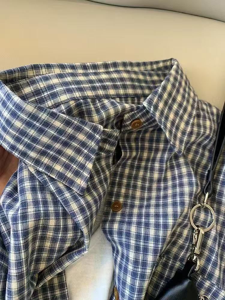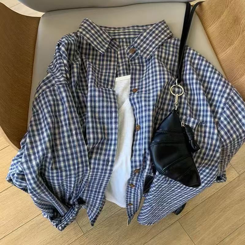 레트로 블루 체크 무늬 긴팔 셔츠 여성 이른 봄 한국식 느슨한 대학 스타일 슬리밍 체크 탑 우아한