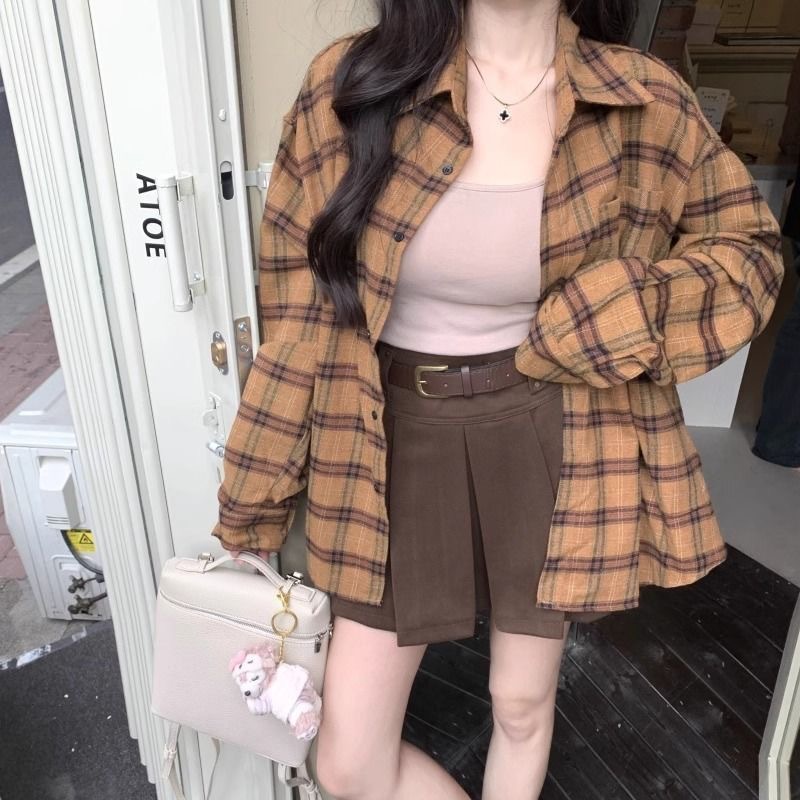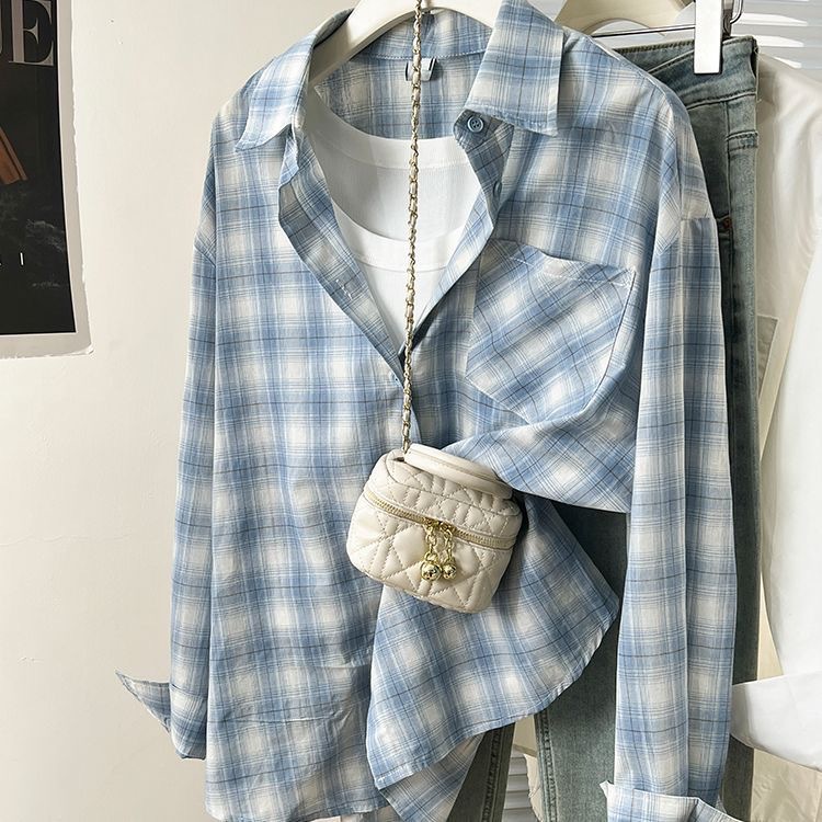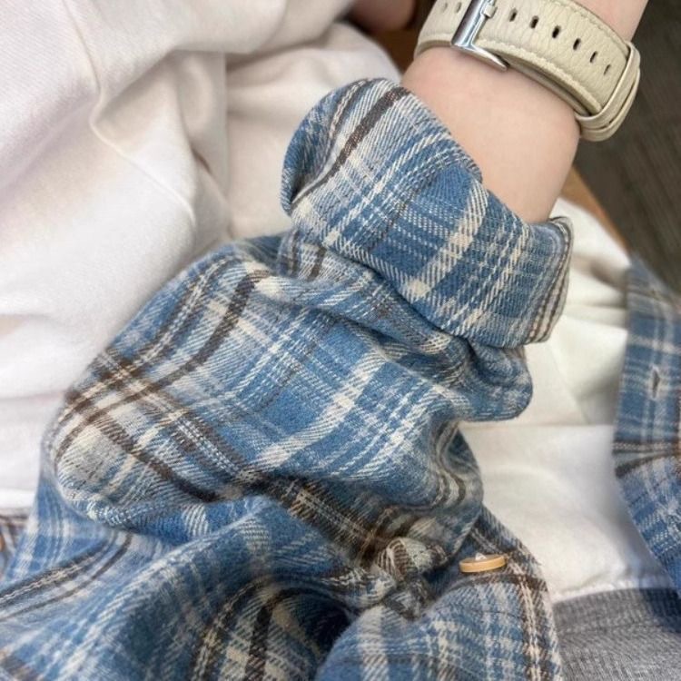 레트로 블루 체크 무늬 긴팔 셔츠 여성 이른 봄 한국식 느슨한 대학 스타일 슬리밍 체크 탑 우아한스토어 가기