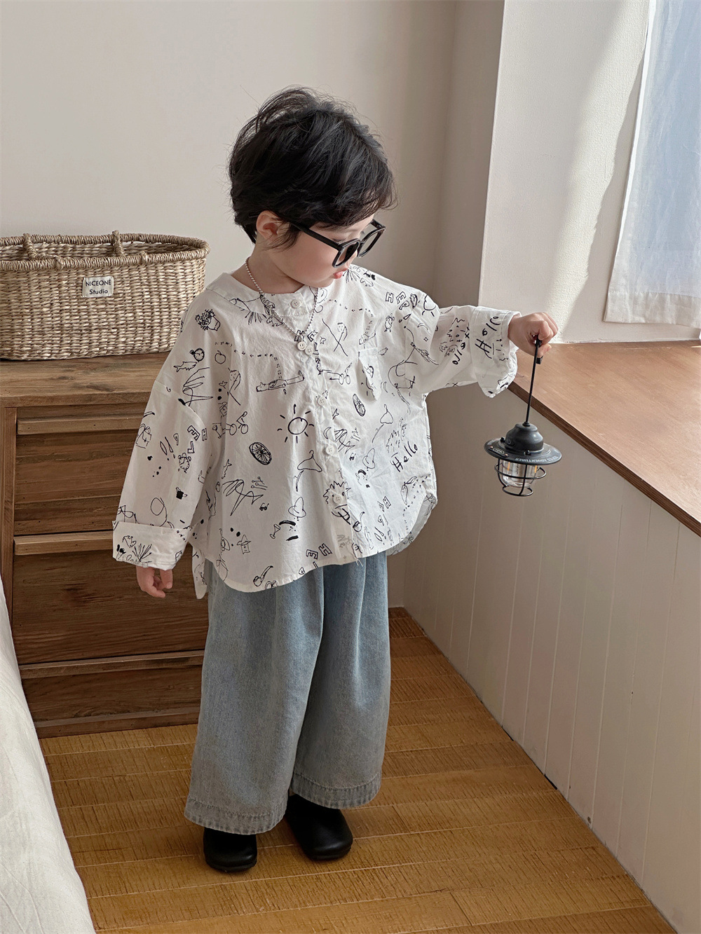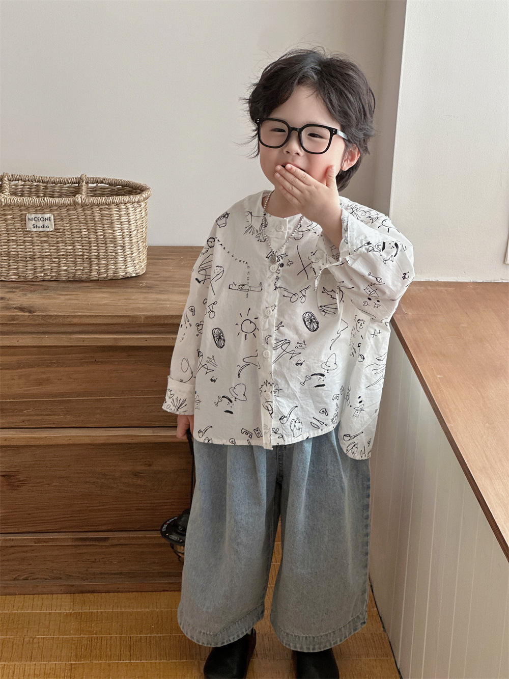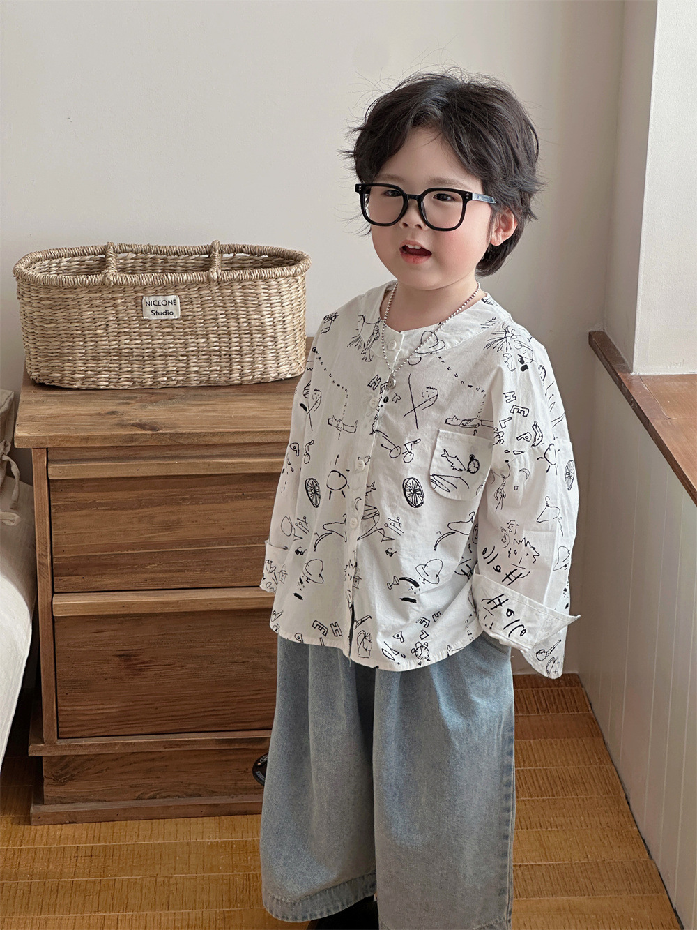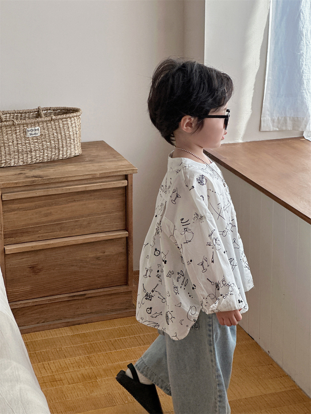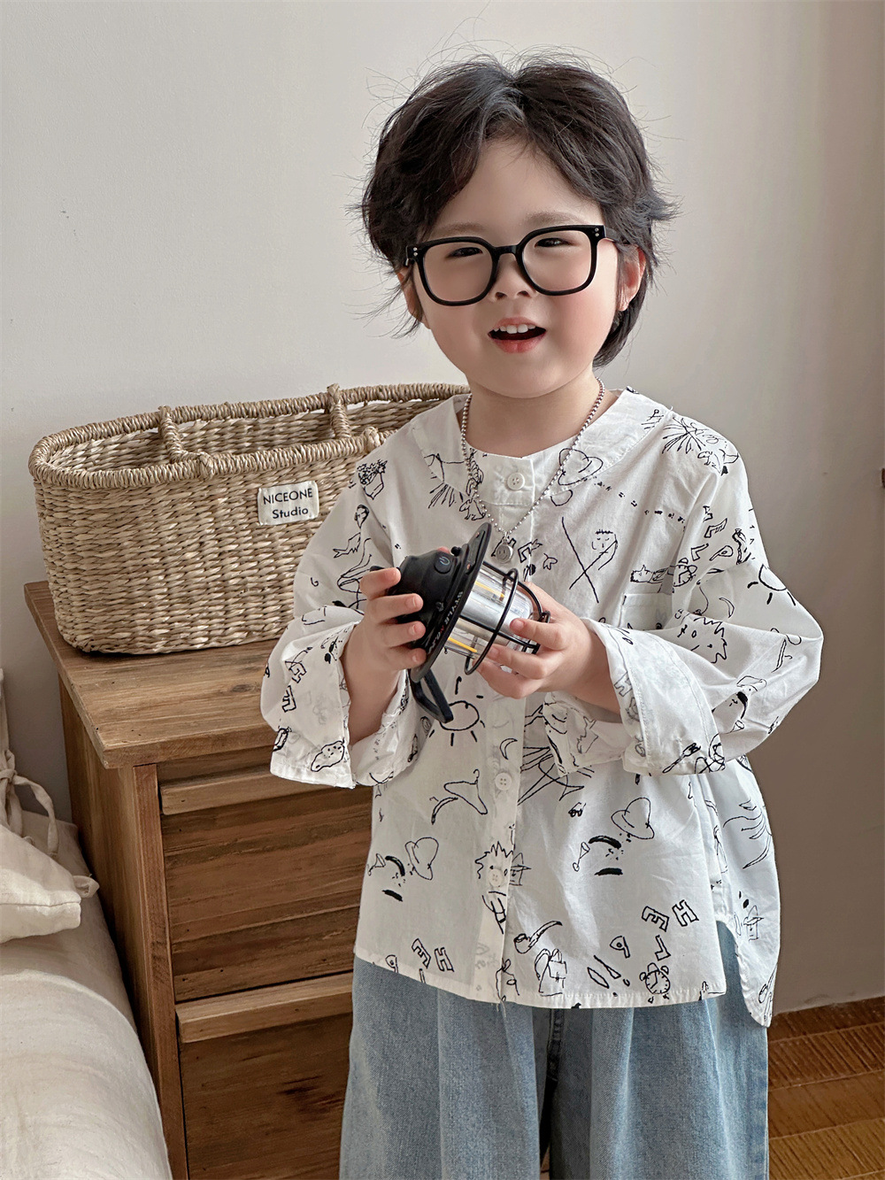 Montaigne Boys의 한국식 낙서 셔츠 2025 새로운 스타일 중소 어린이 캐주얼 탑 스트리트 프라이드 아기의 크루 넥 카디건 트렌디스토어 가기