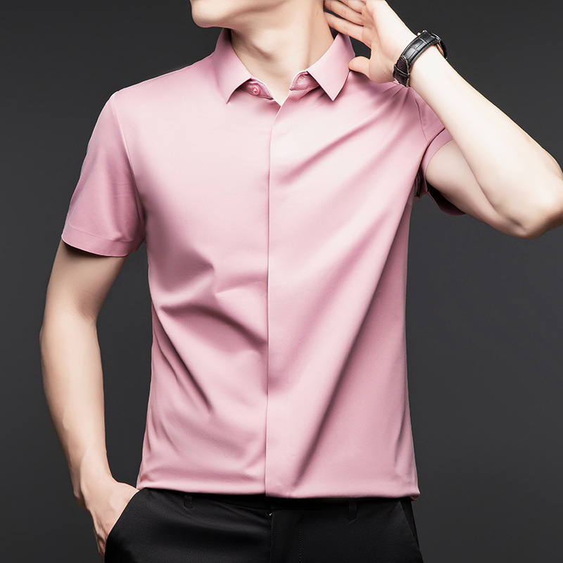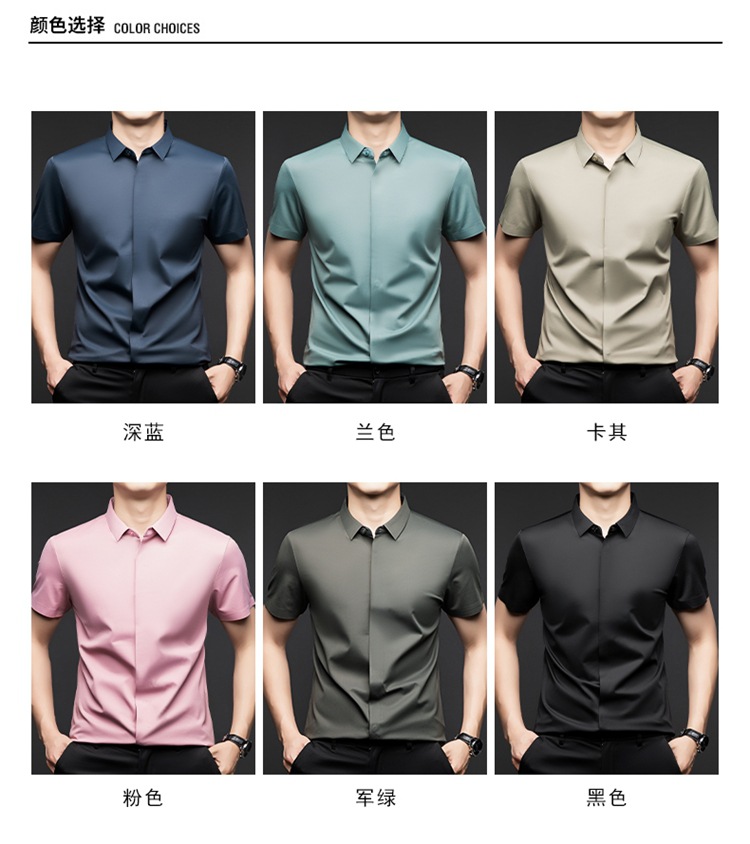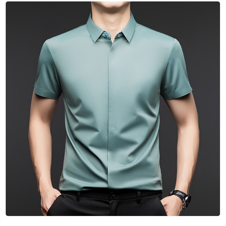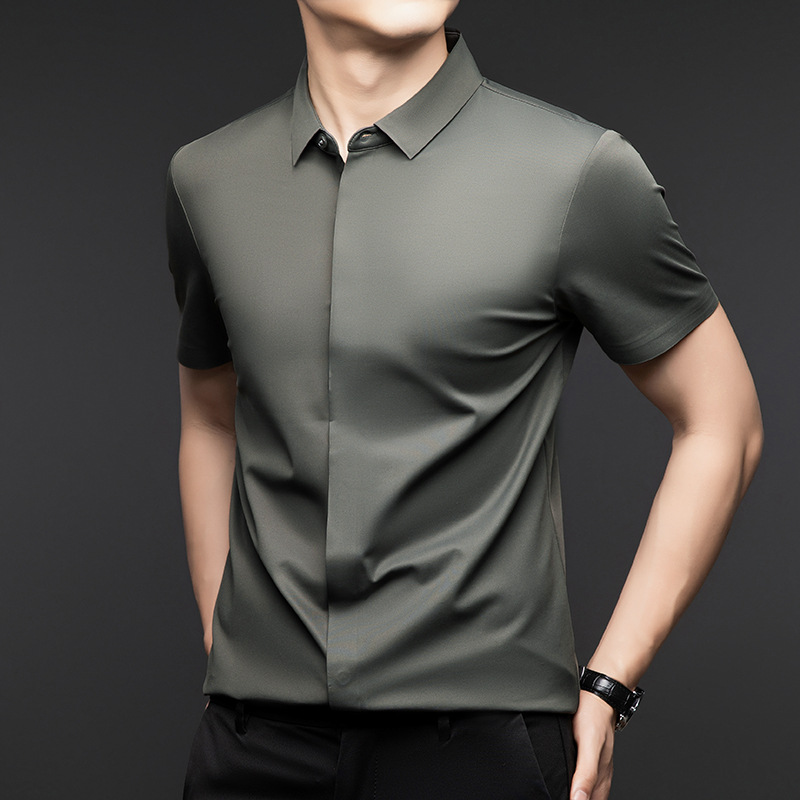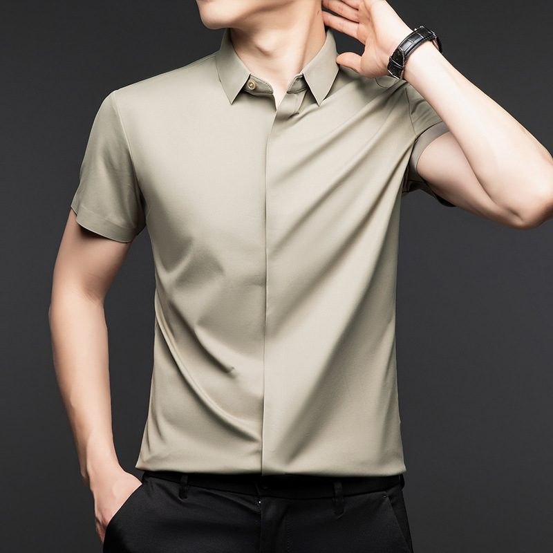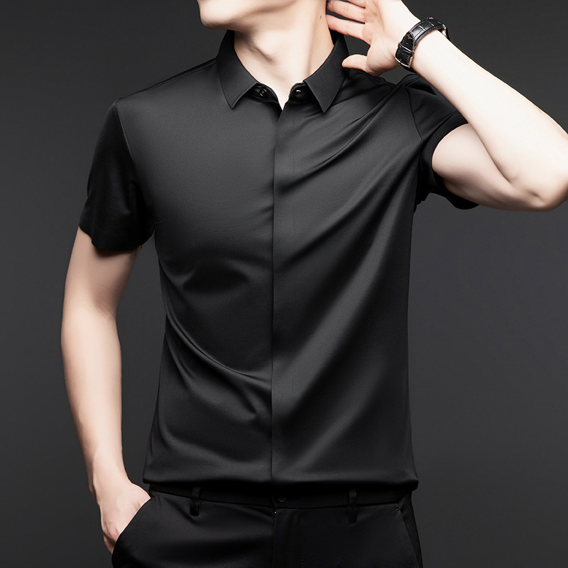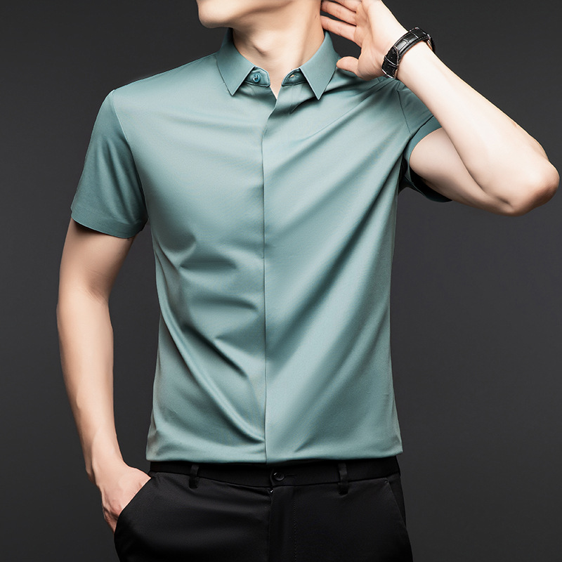 하이 엔드 아이스 실크 뽕나무 실크 반팔 셔츠 남자 여름 플러스 사이즈 추적없는 숨겨진 버튼 캐주얼 비즈니스 올 매치 남자 셔츠스토어 가기
