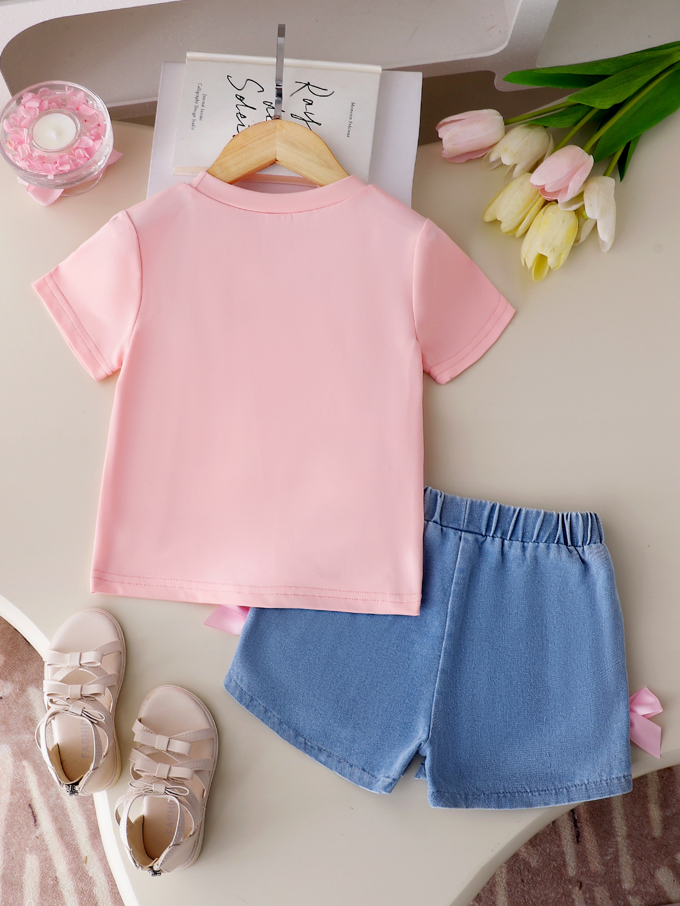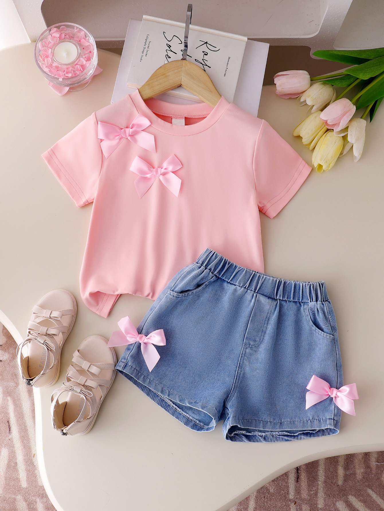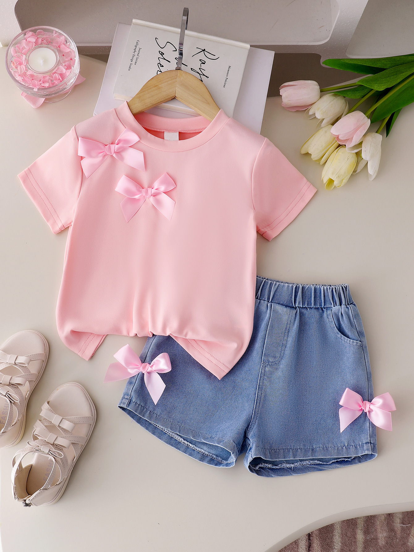 어린이 의류 소녀의 활 단색 티셔츠 데님 반바지 2 조각 세트 여름 원피스스토어 가기
