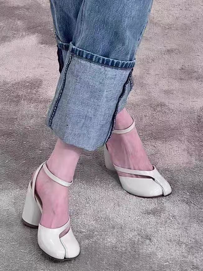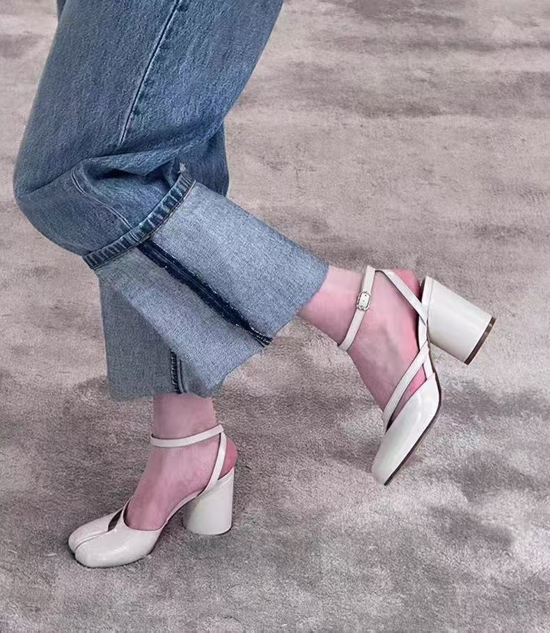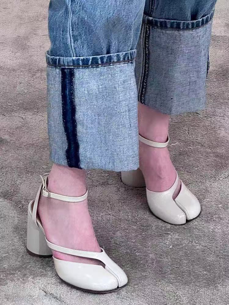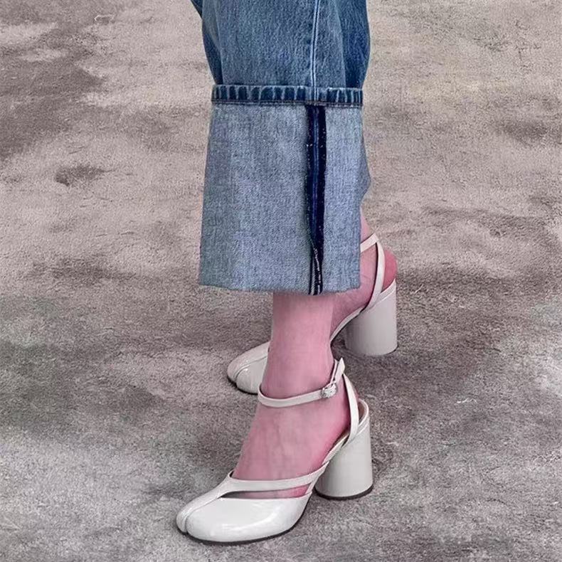 8CM 하이힐 타비 스플릿 발가락 슈즈를 가진 패션 스타 돼지의 트로터 한 단어 버클 말굽 양 트로터 여성 신발 하이힐