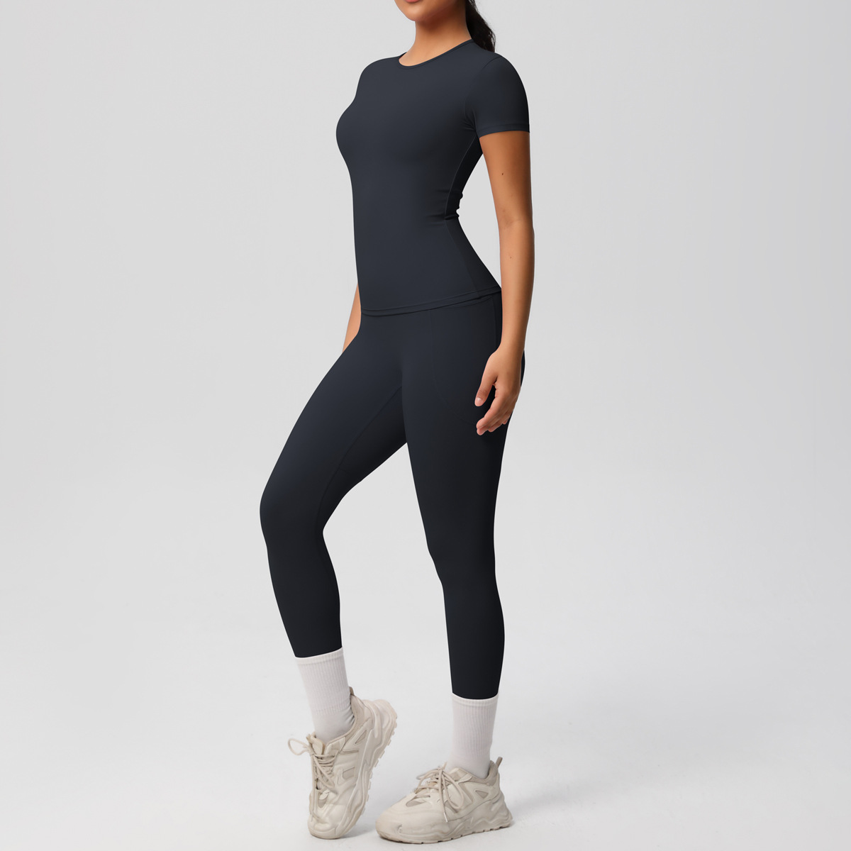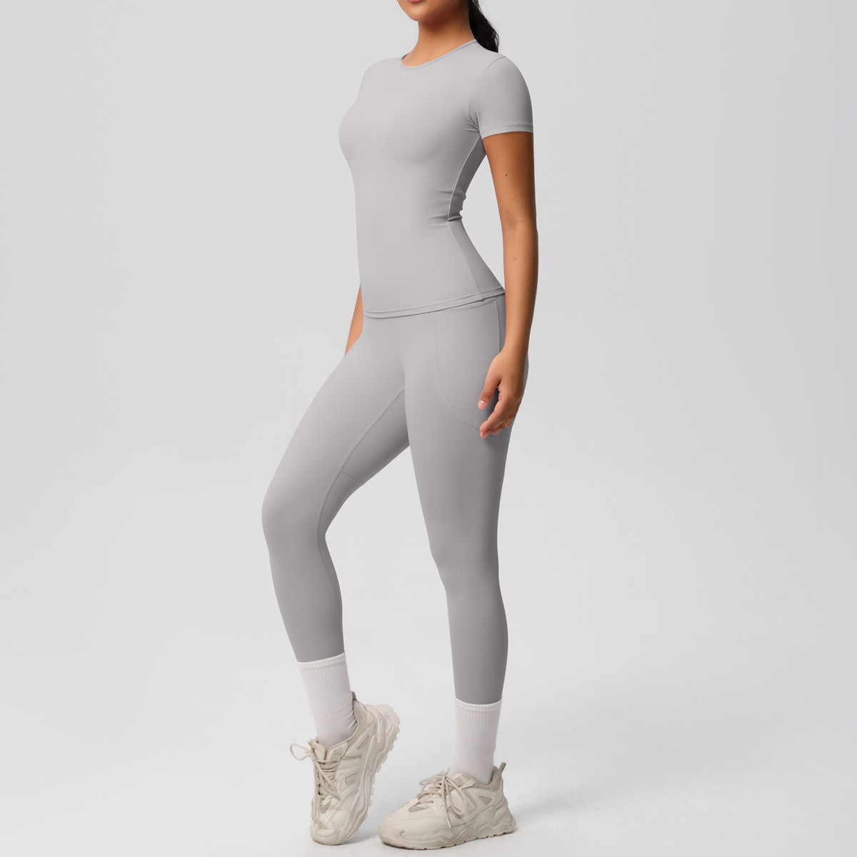재고 크로스 보더 솔리드 컬러 양면 샌딩 통기성 높은 탄성 꽉 맞는 요가 세트 세트 스포츠 러닝 피트니스 투피스 세트