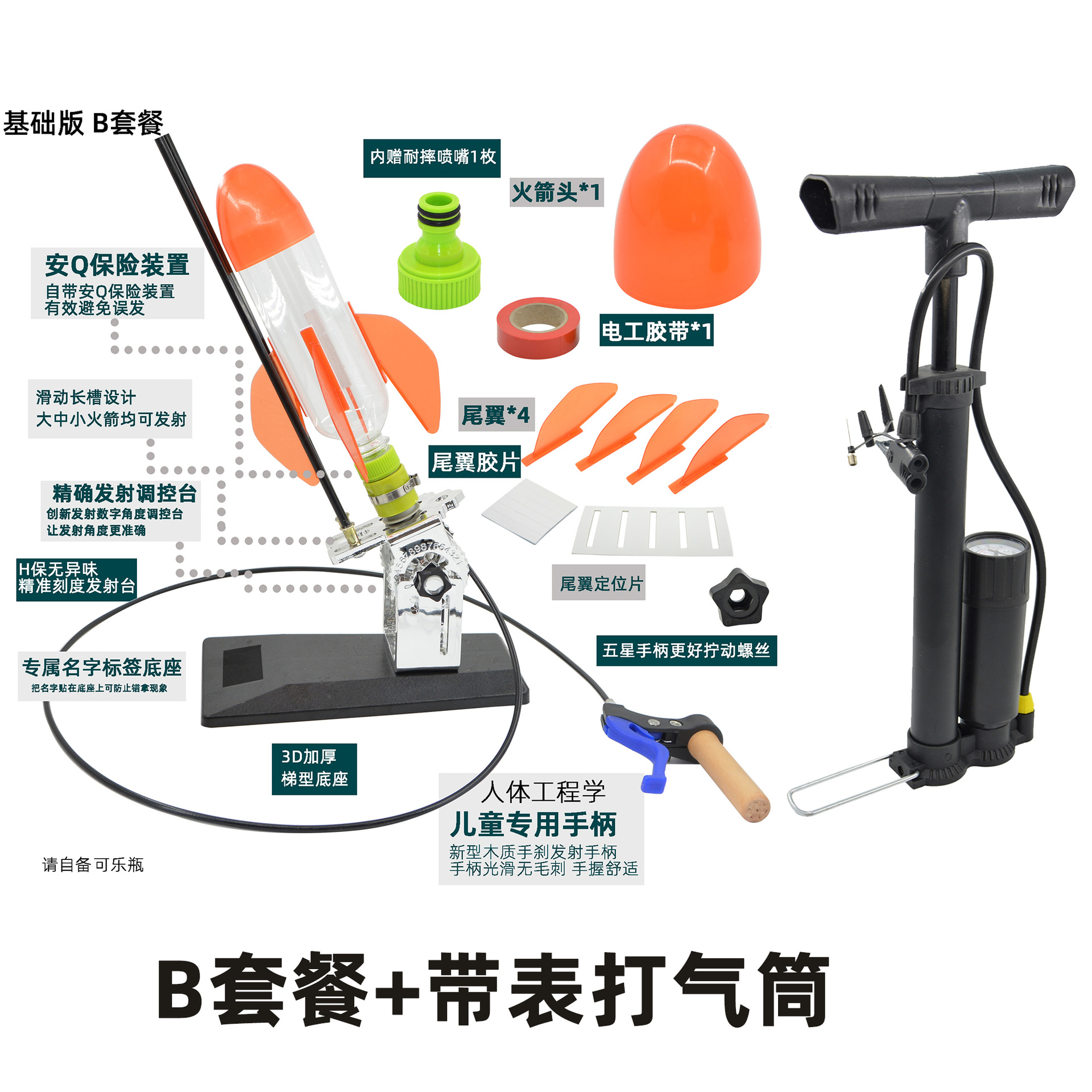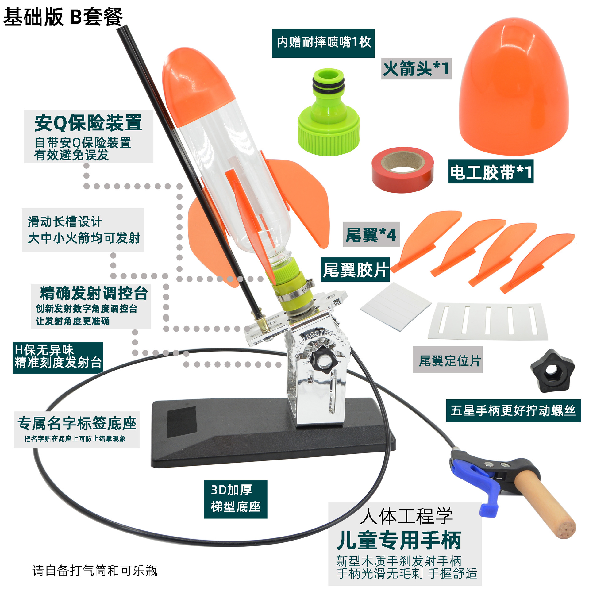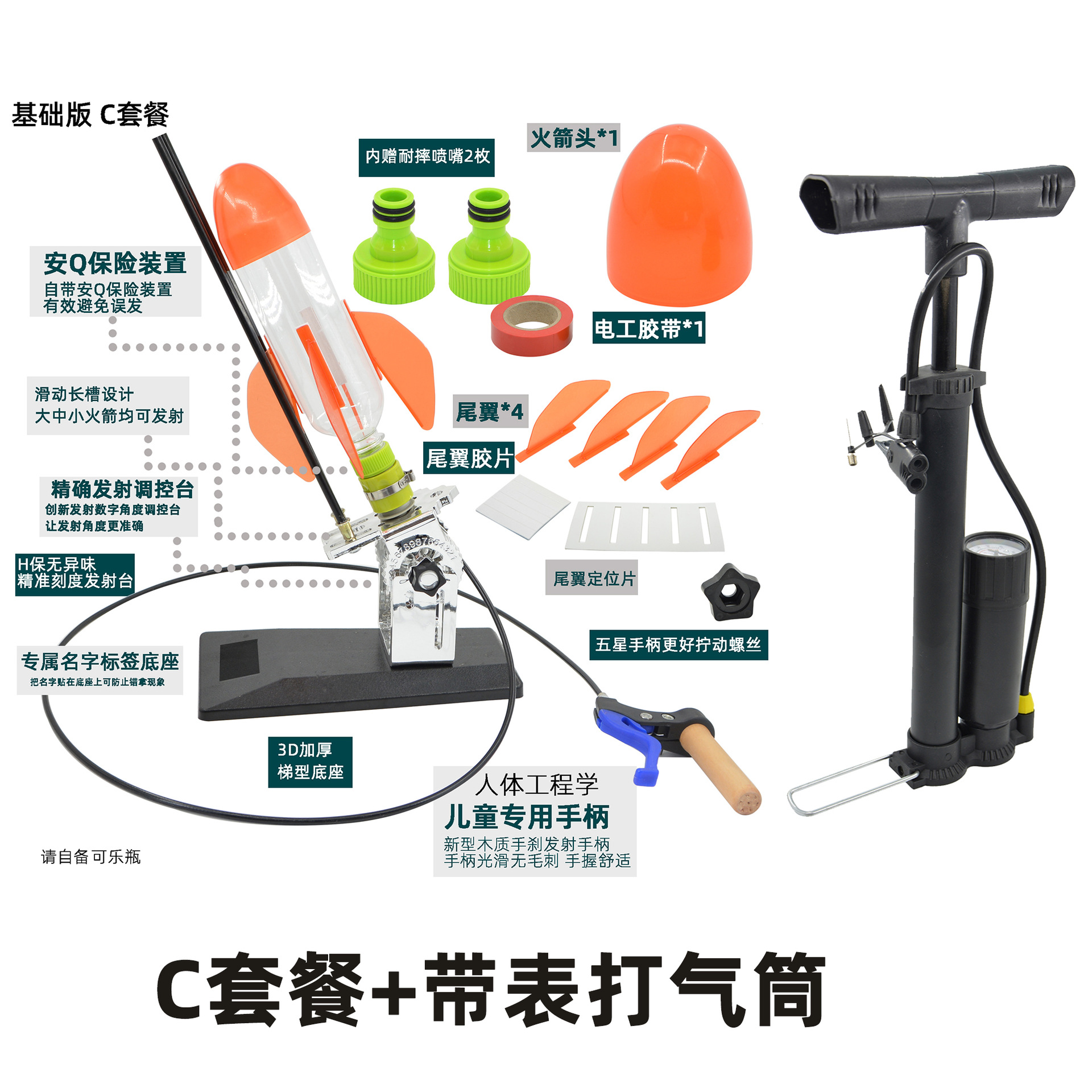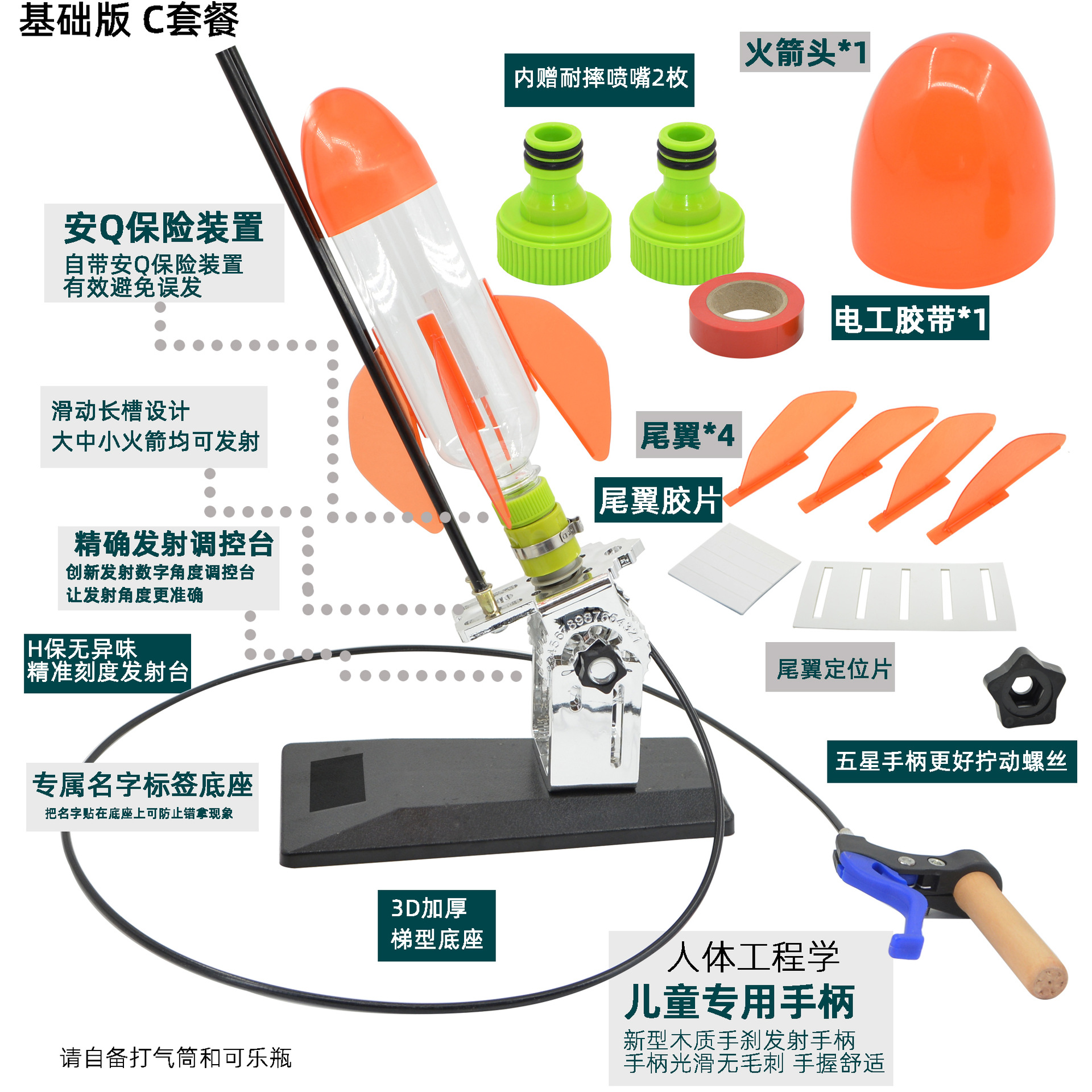 发射架、喷嘴、可口可乐瓶、头锥尾翼、自行车打气筒
