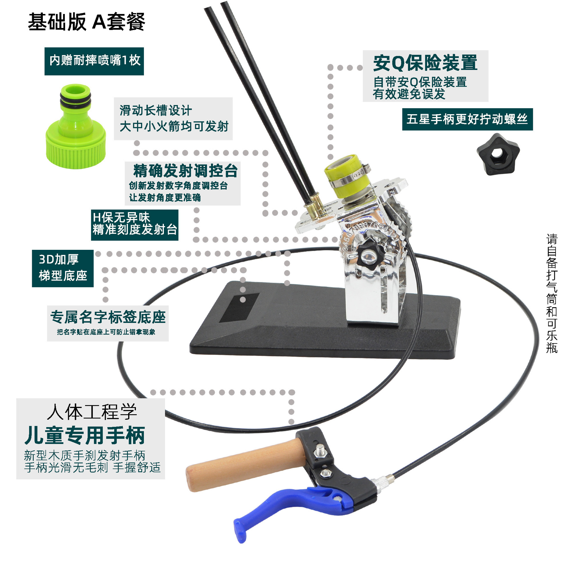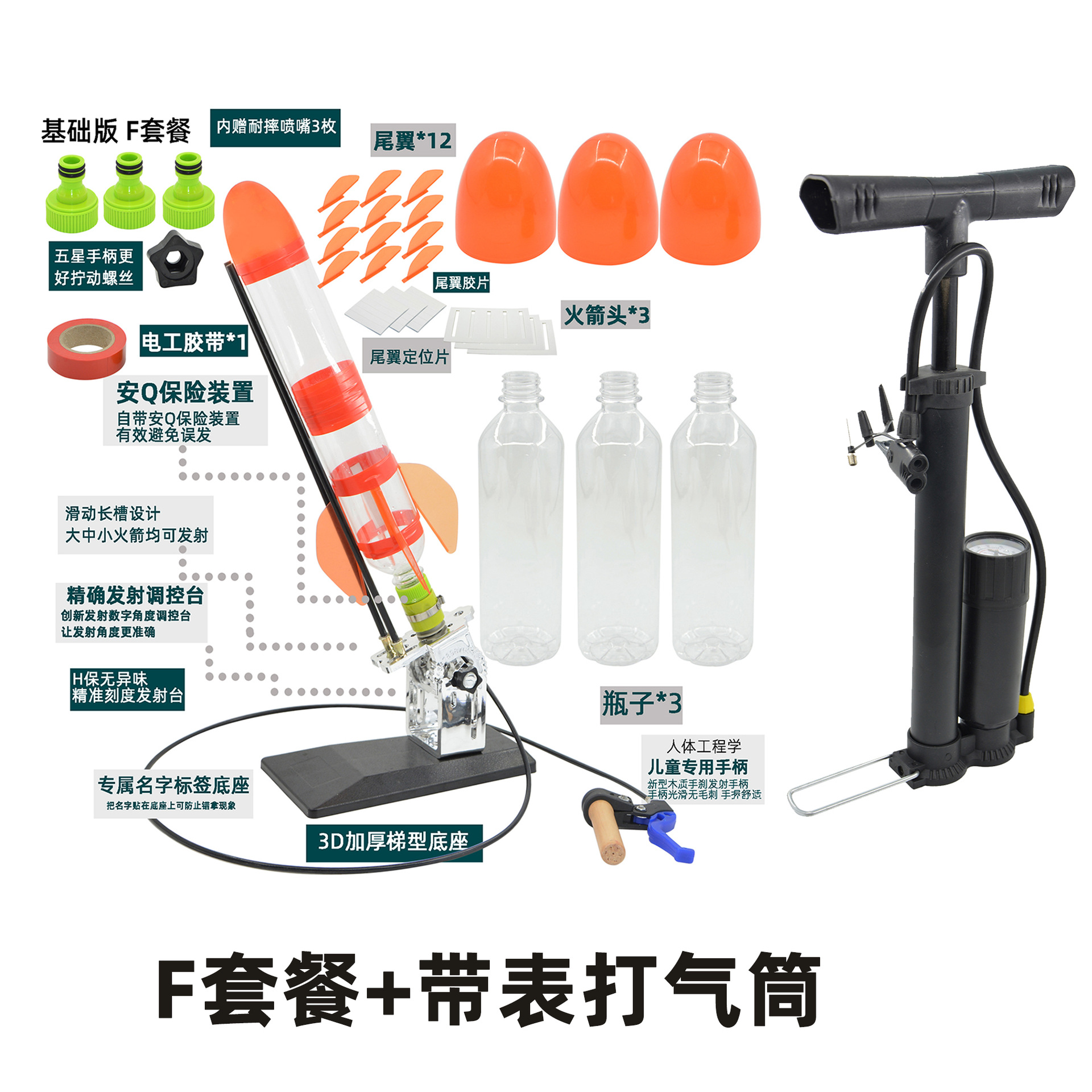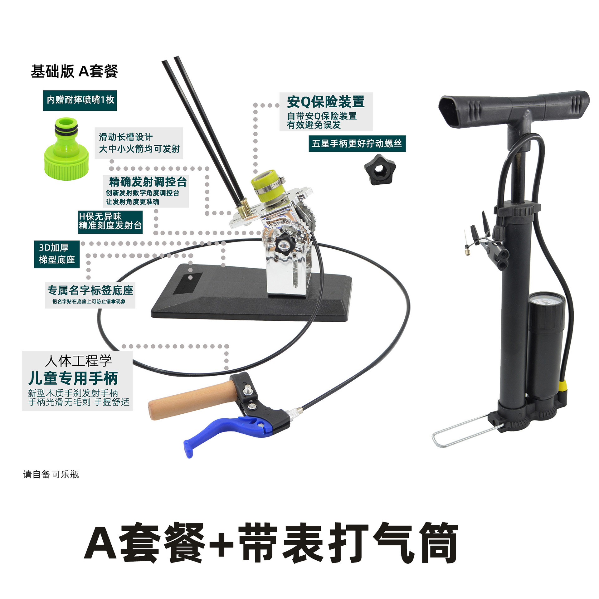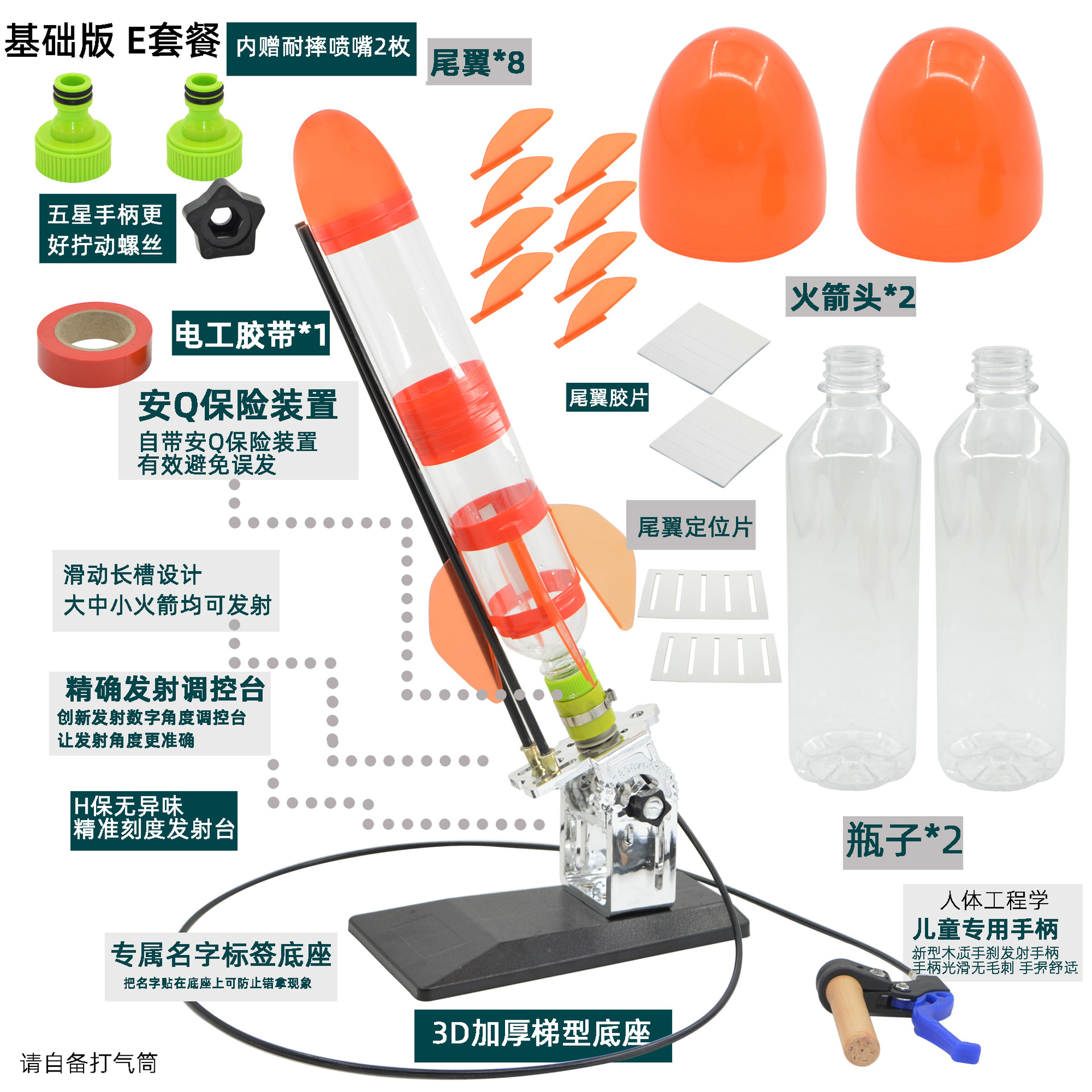 发射架、喷嘴、可口可乐瓶、头锥尾翼、自行车打气筒
