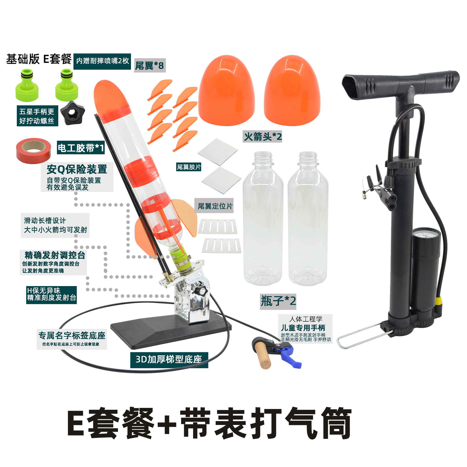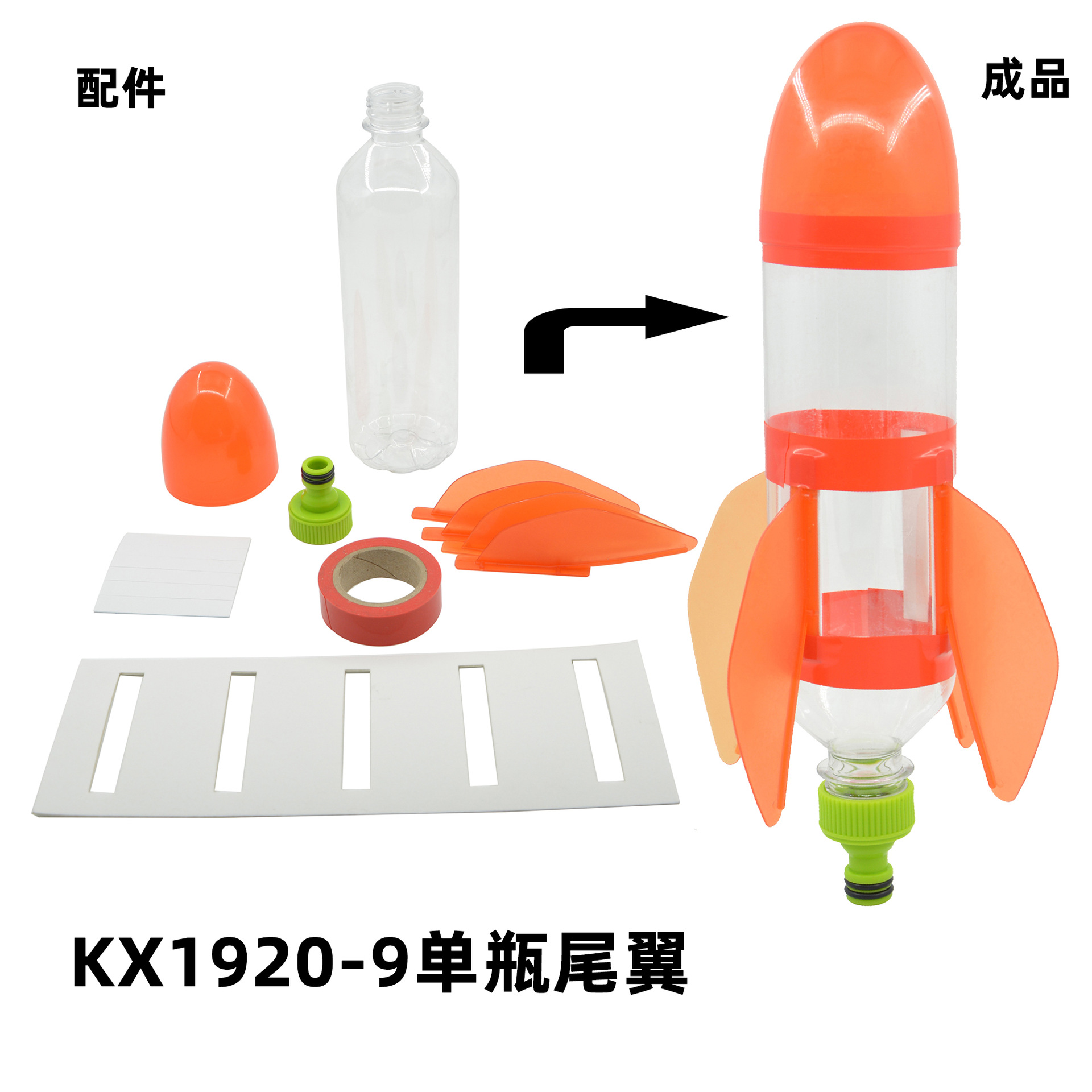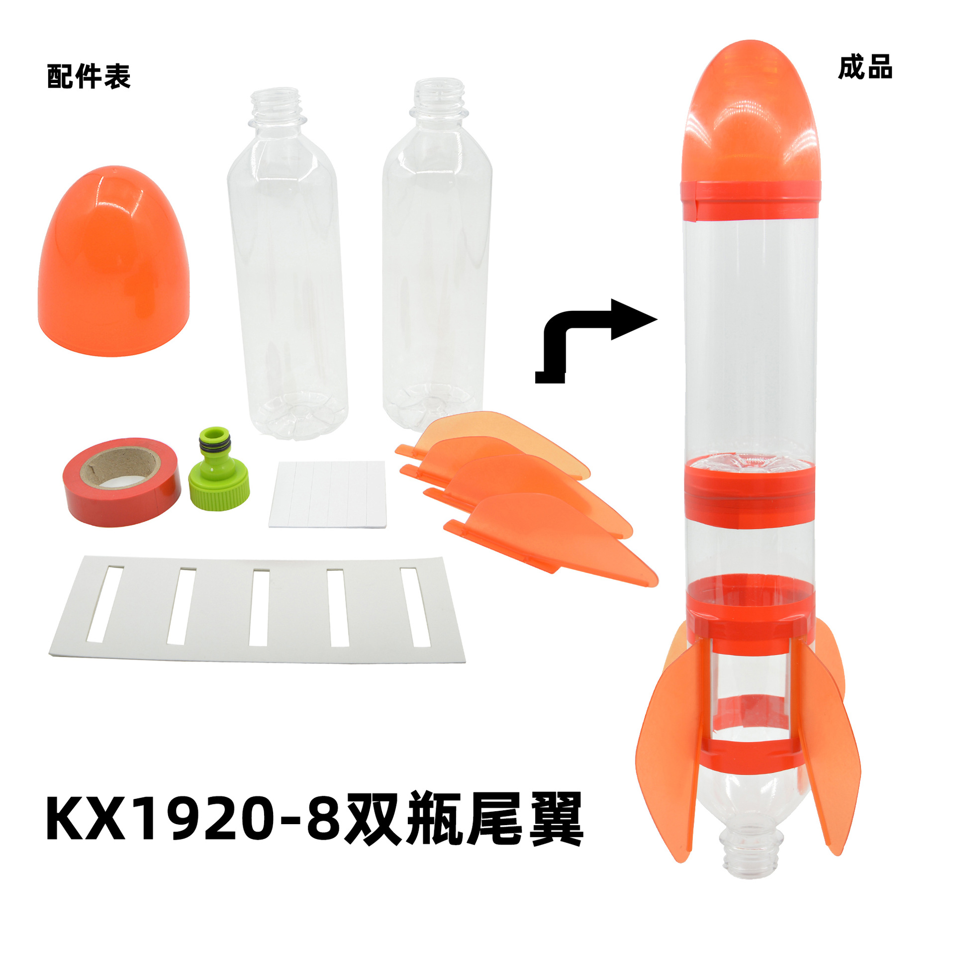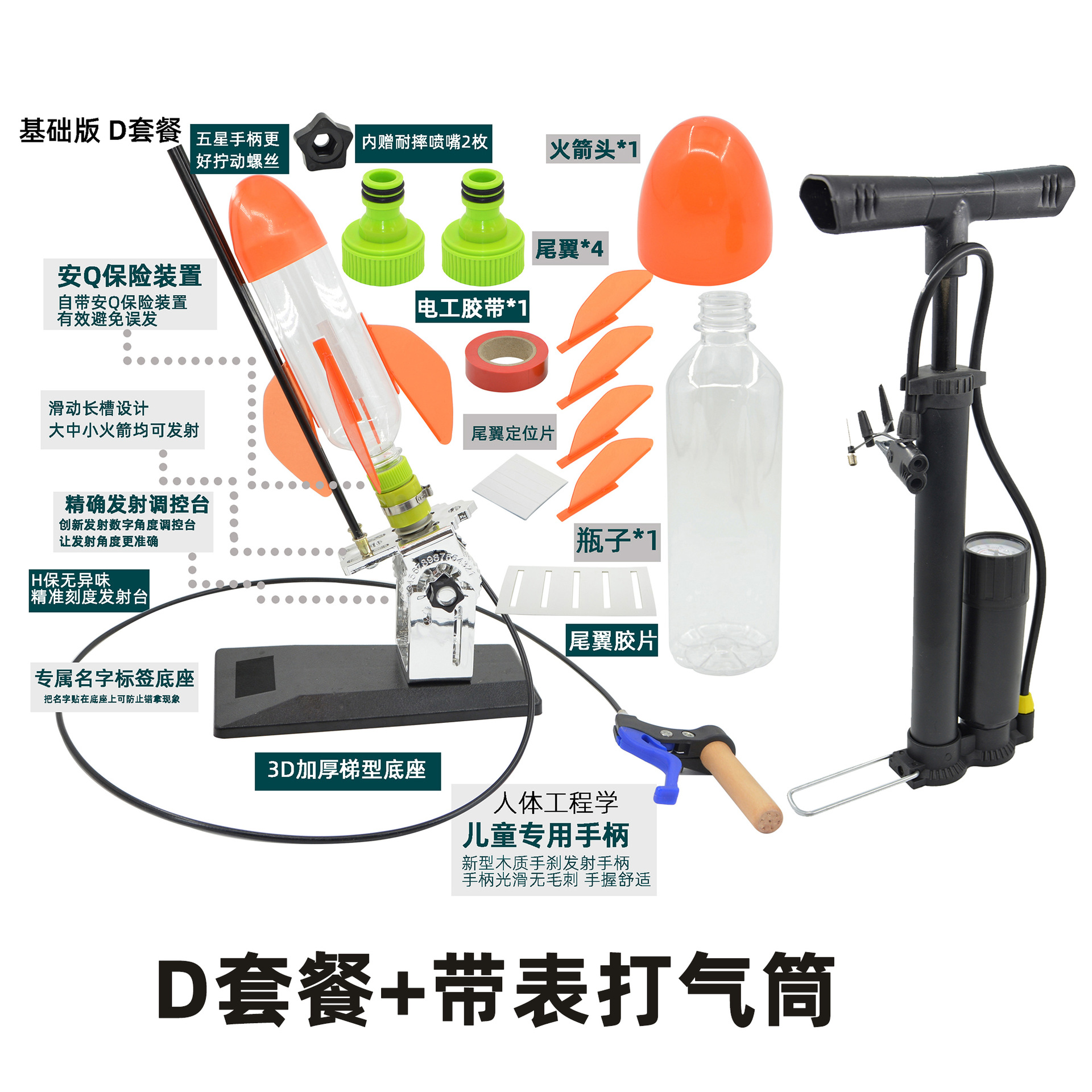 发射架、喷嘴、可口可乐瓶、头锥尾翼、自行车打气筒