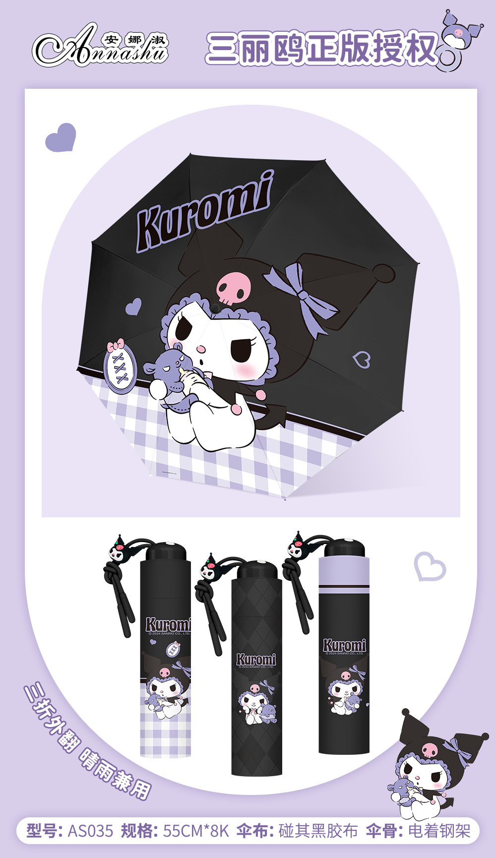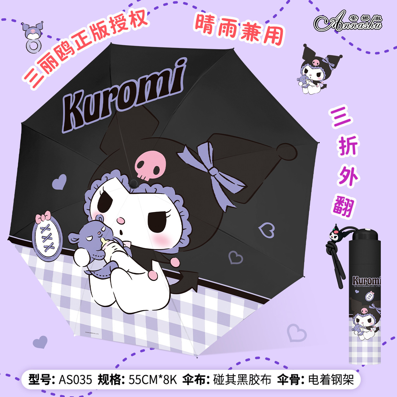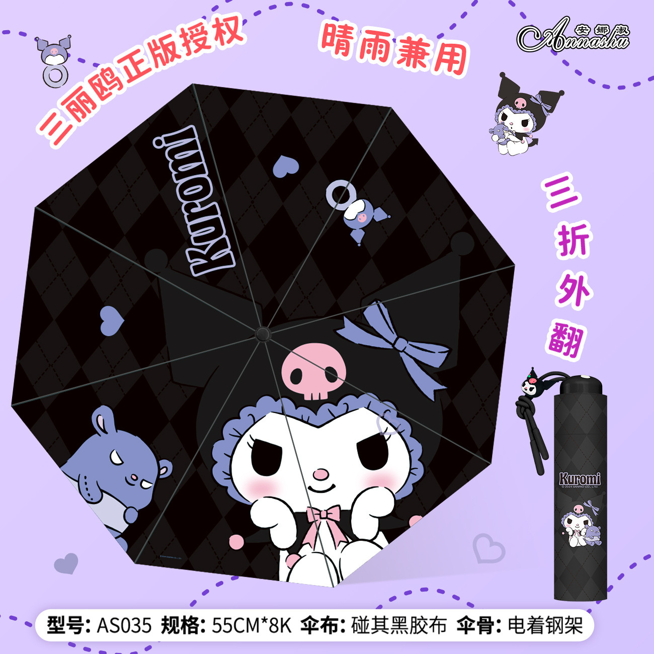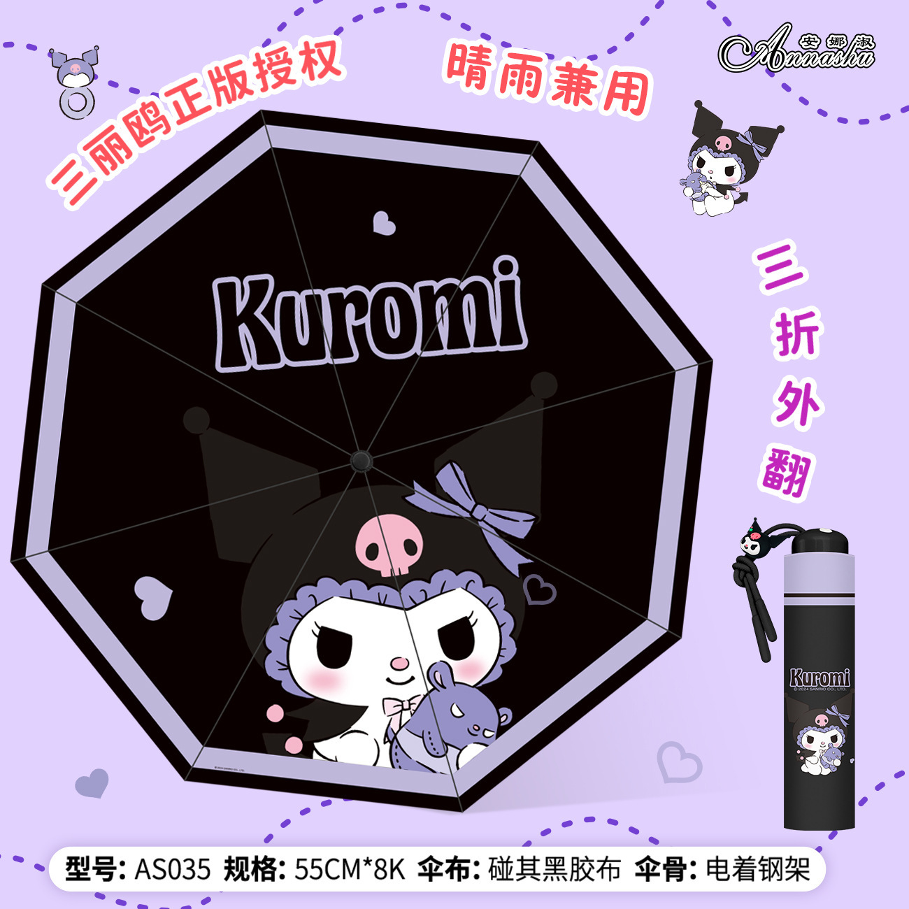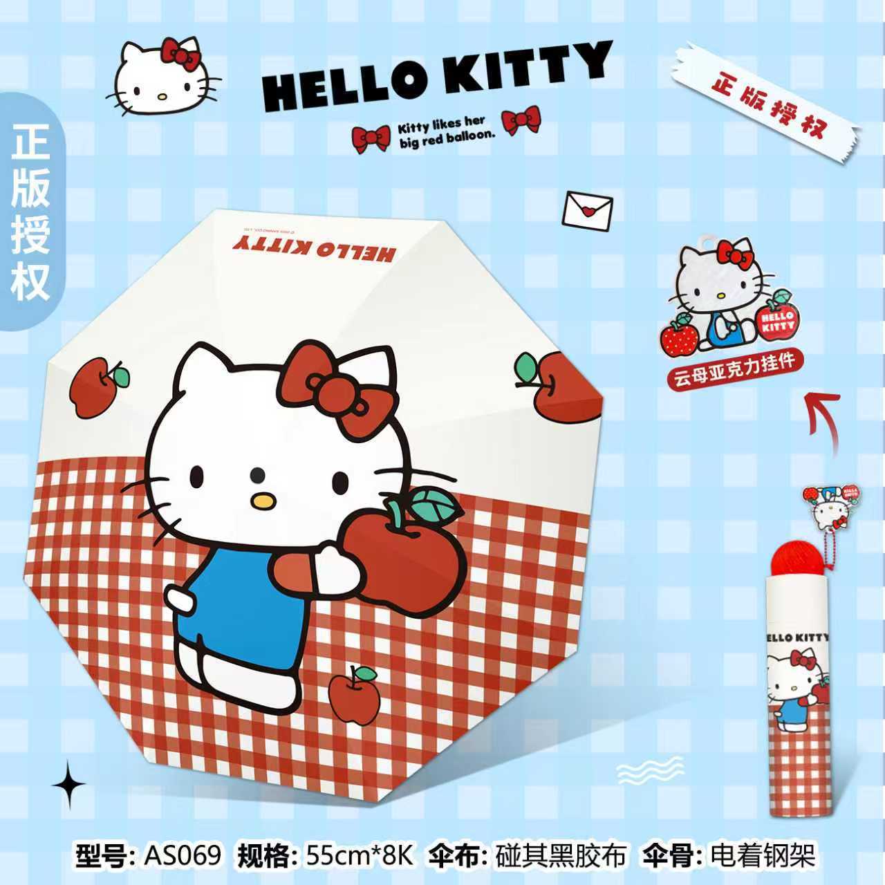 정품 산리오 우산 검은 고무 햇살 우산 맑고 비오는 이중 용도 선 스크린 및 UV 보호 휴대용 만화 3 배 우산스토어 가기