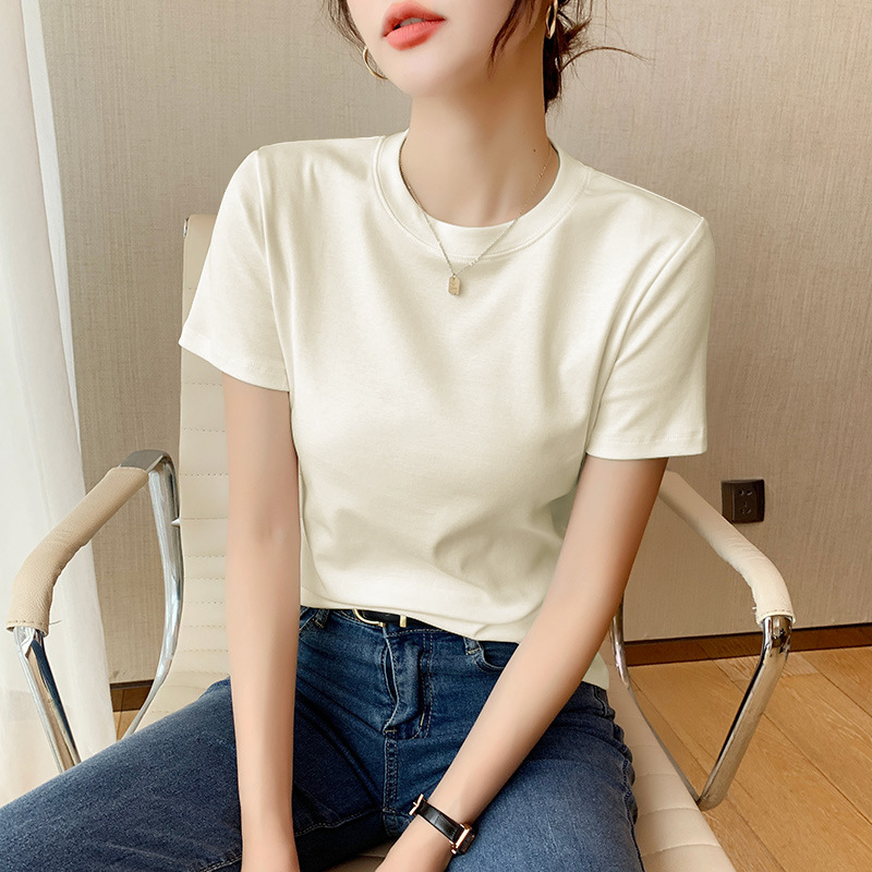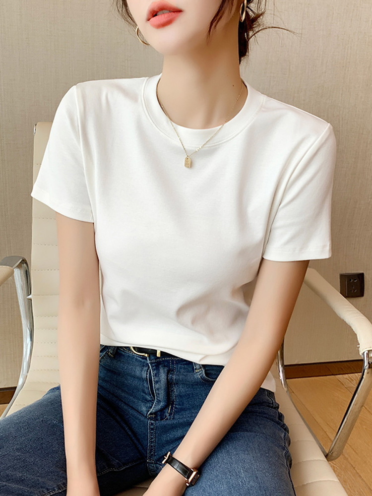 어깨 퓨어 코튼 반팔 티셔츠 여성 봄과 여름 2025 새로운 퓨어 화이트 슬림 핏 슬리밍 티셔츠 반소매 베이스 셔츠스토어 가기