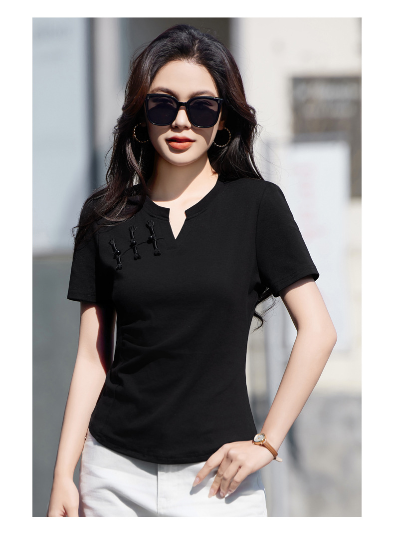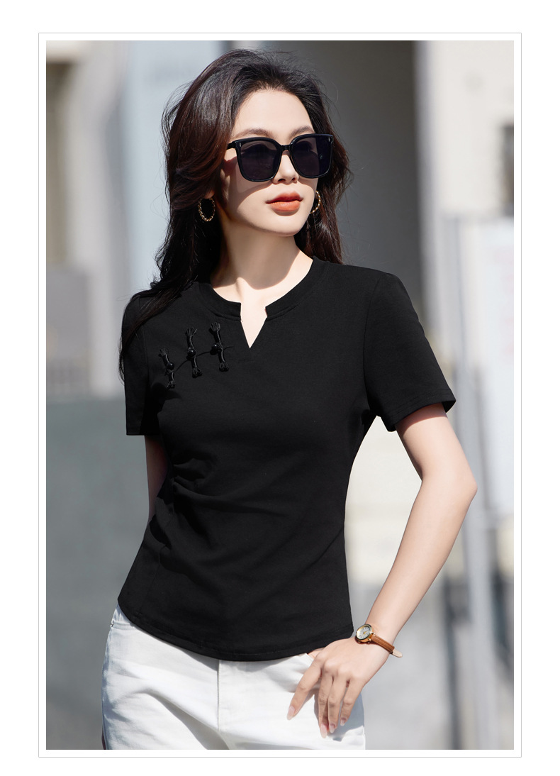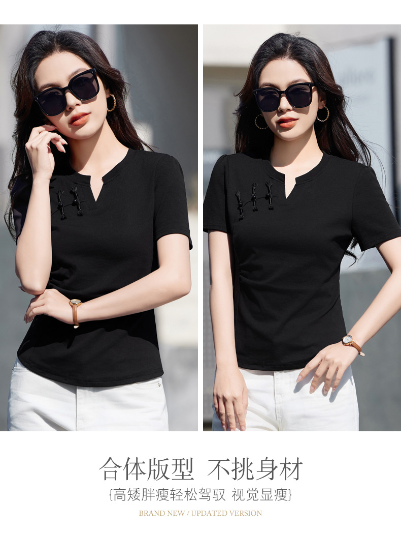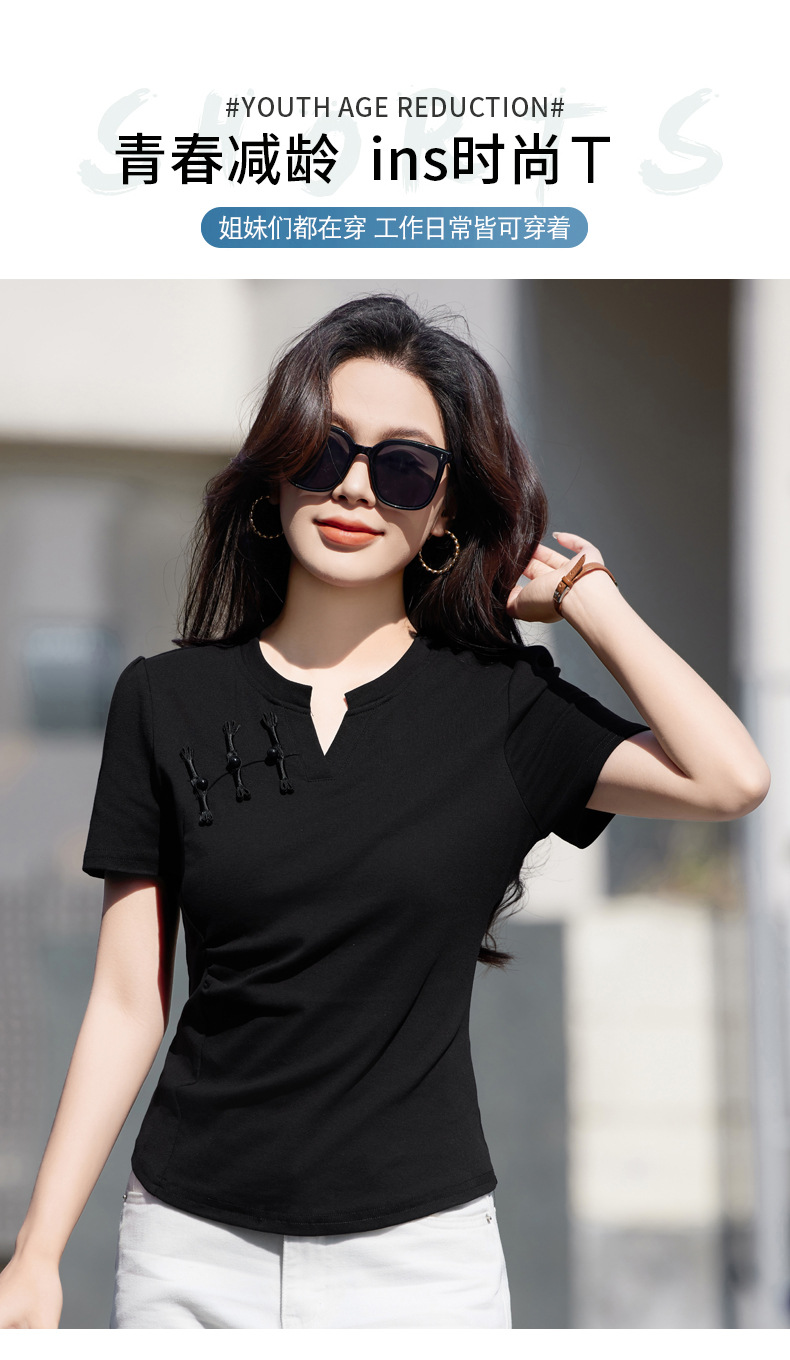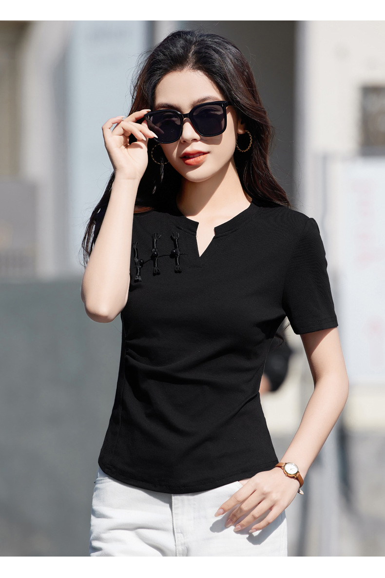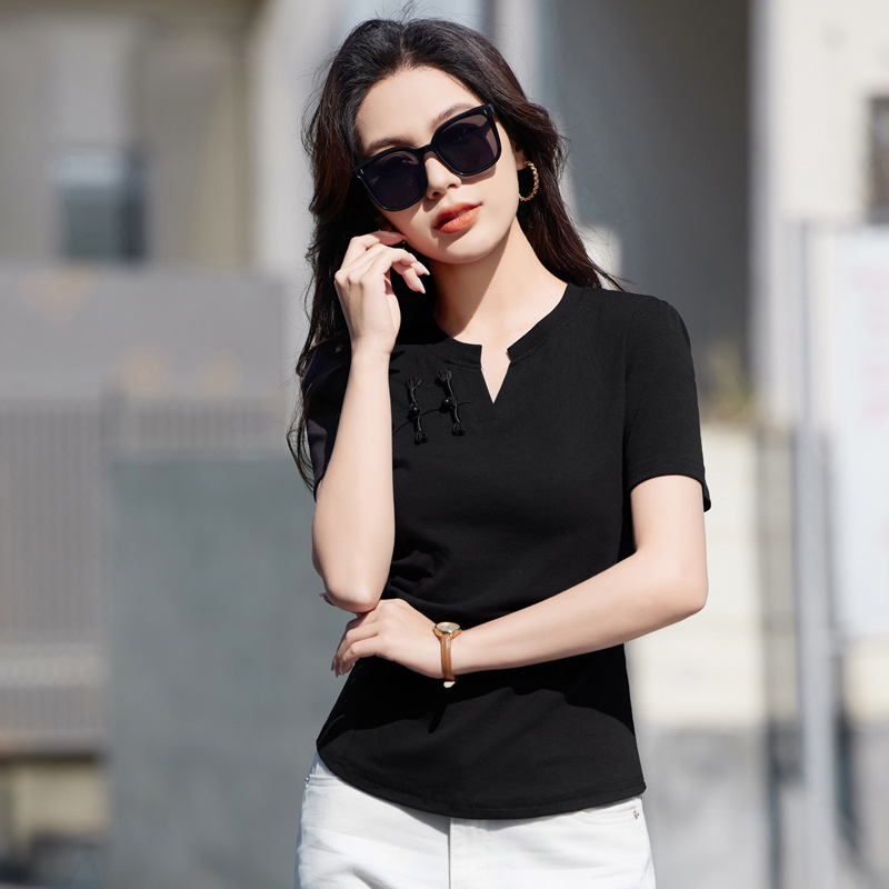 52038 새로운 중국 스타일 국가 스타일 코튼 반팔 티셔츠 여자 2025 년 여름 새로운 슬림 핏 올 매치 블랙 반소매 탑스토어 가기