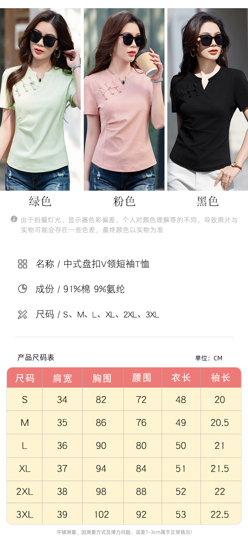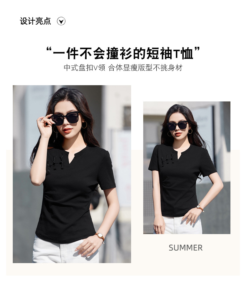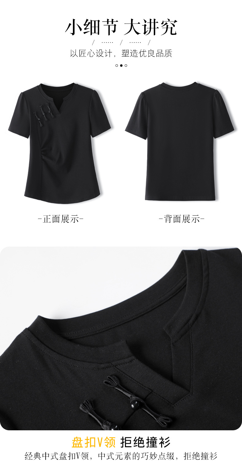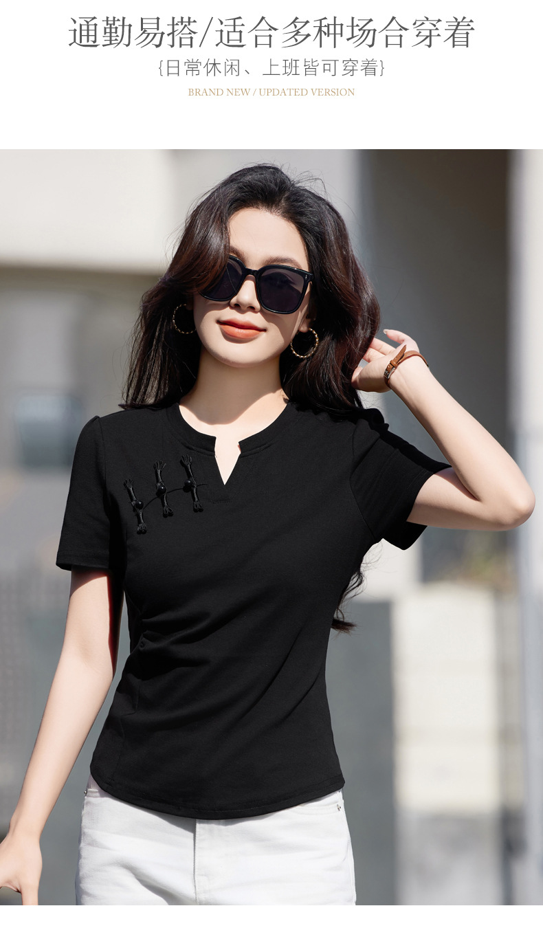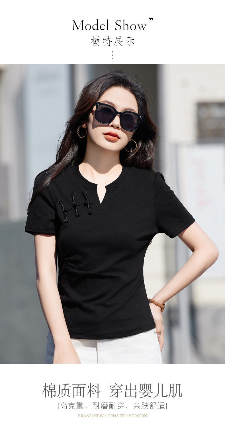 52038 새로운 중국 스타일 국가 스타일 코튼 반팔 티셔츠 여자 2025 년 여름 새로운 슬림 핏 올 매치 블랙 반소매 탑스토어 가기