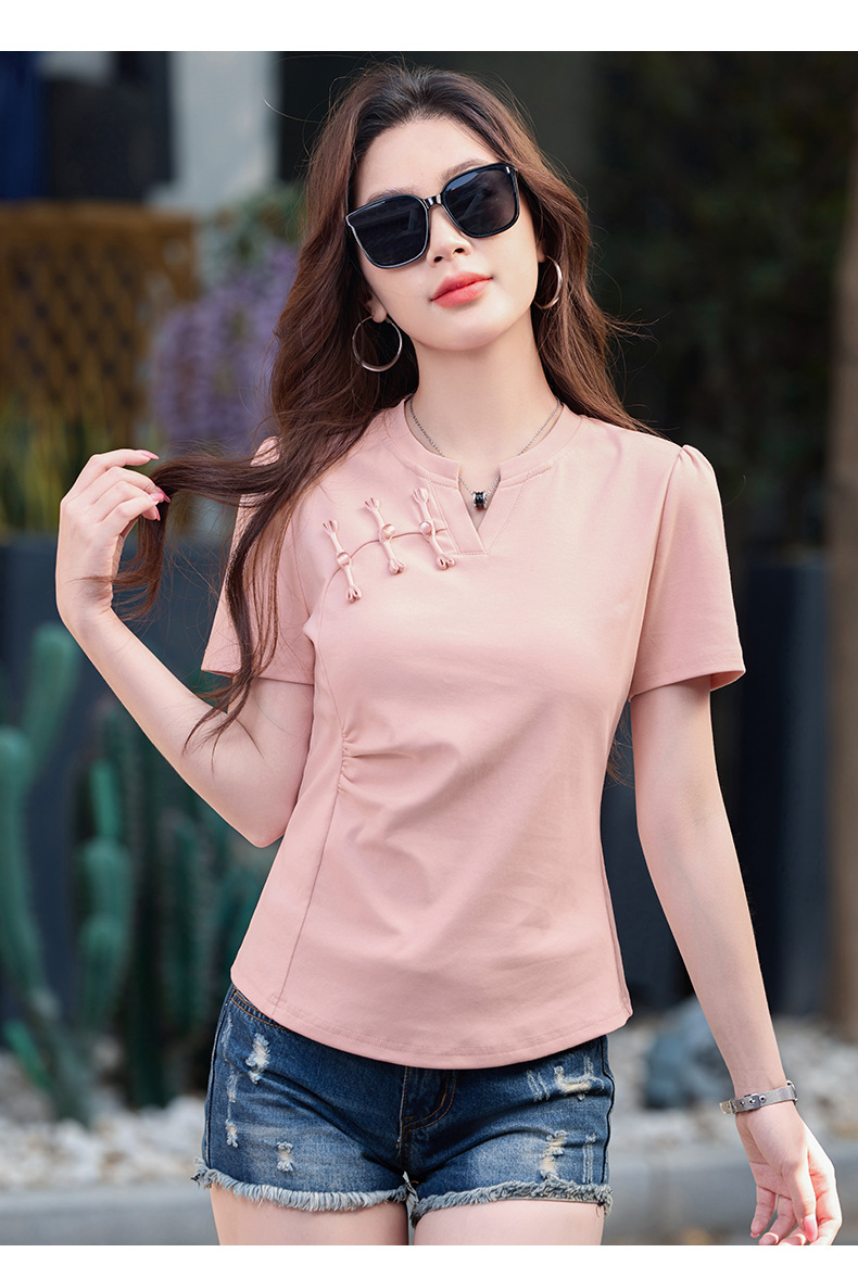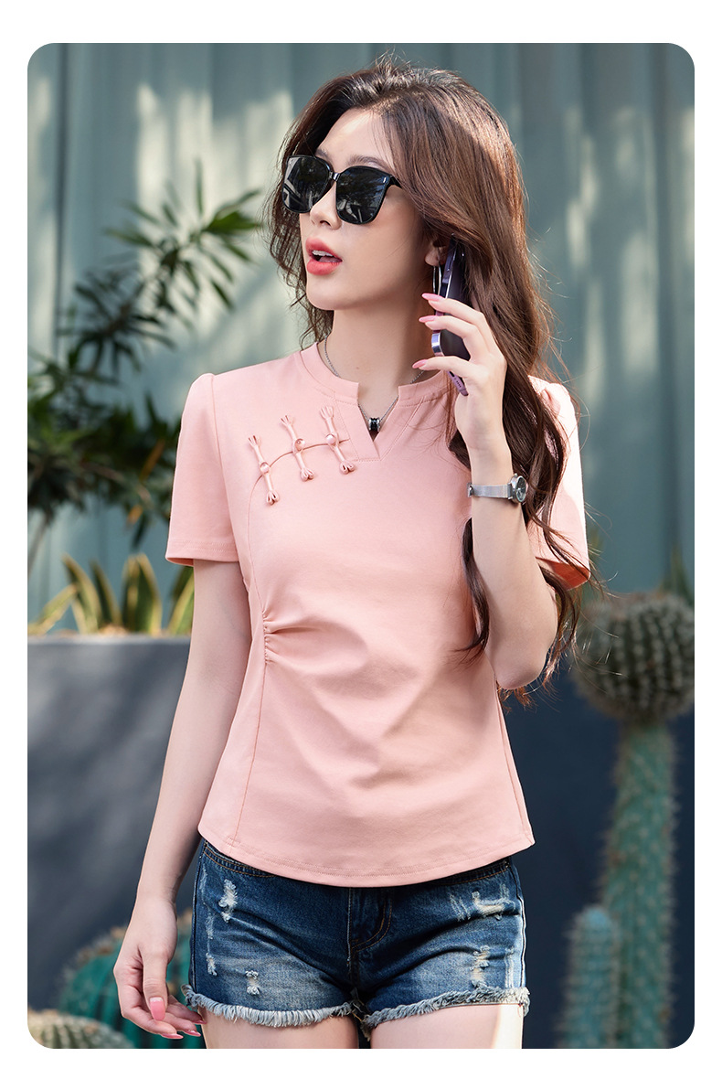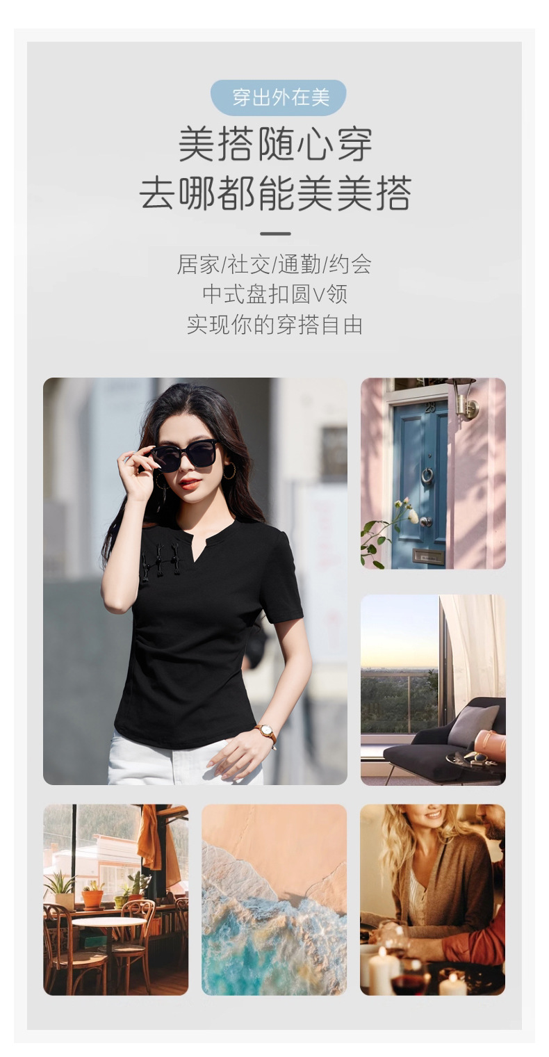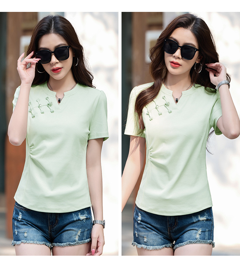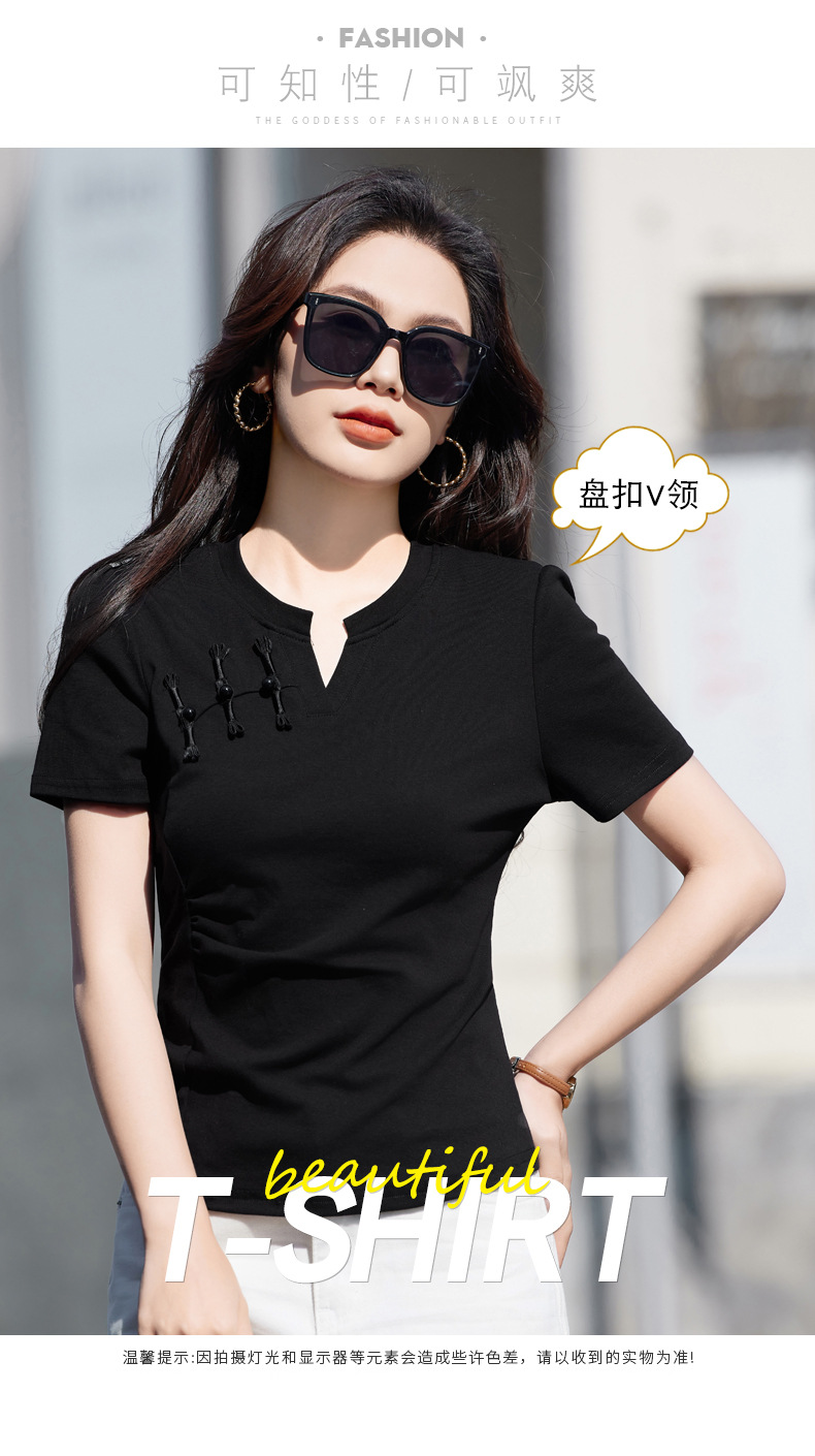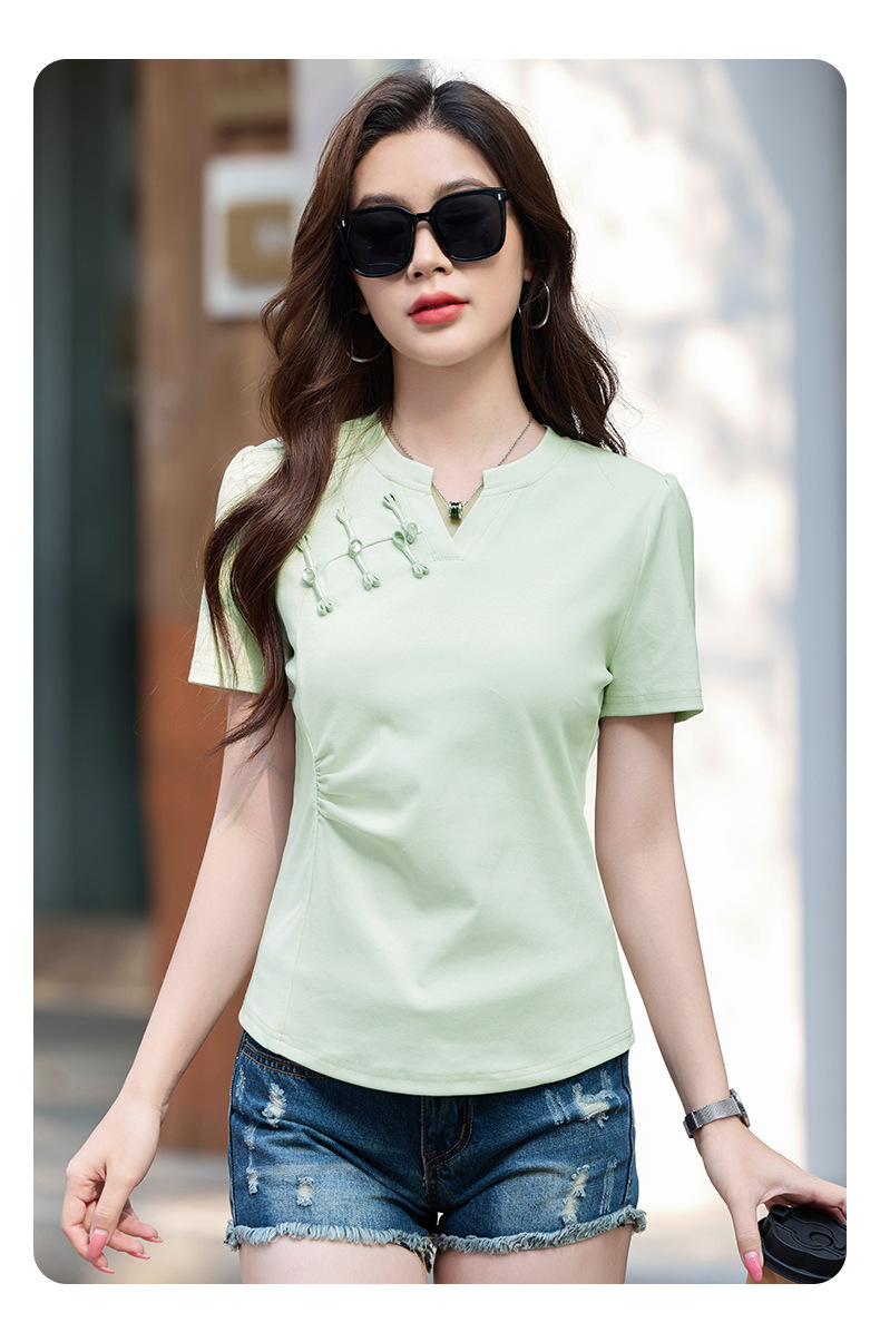 52038 새로운 중국 스타일 국가 스타일 코튼 반팔 티셔츠 여자 2025 년 여름 새로운 슬림 핏 올 매치 블랙 반소매 탑스토어 가기