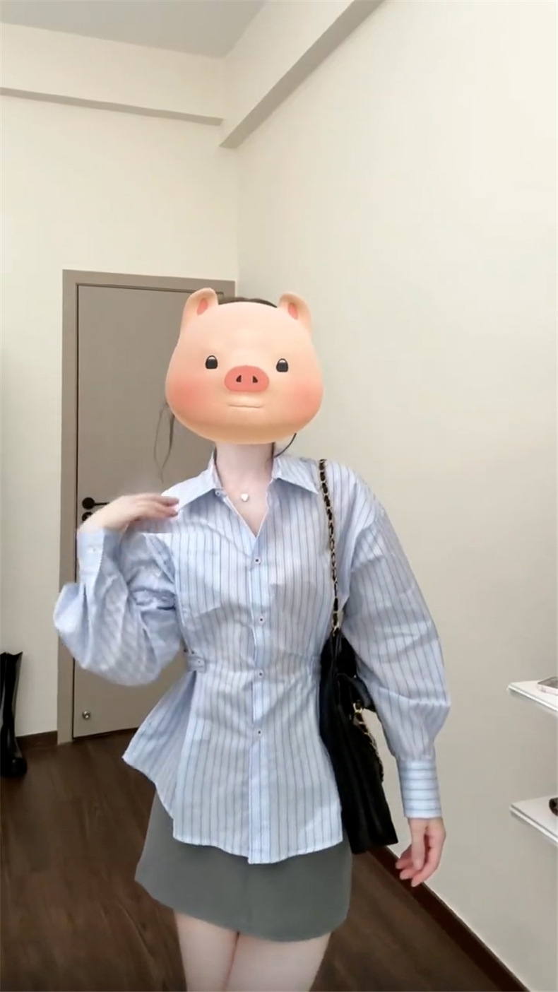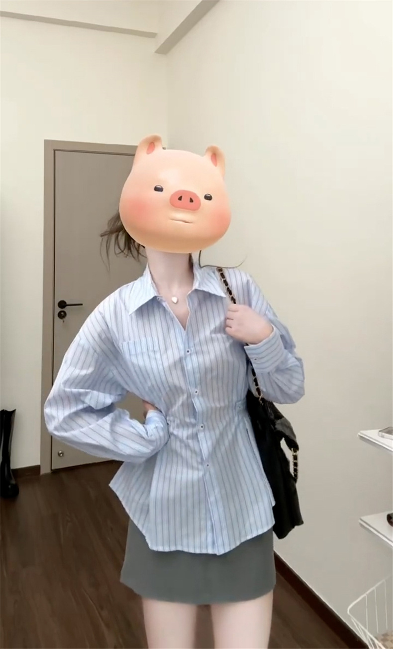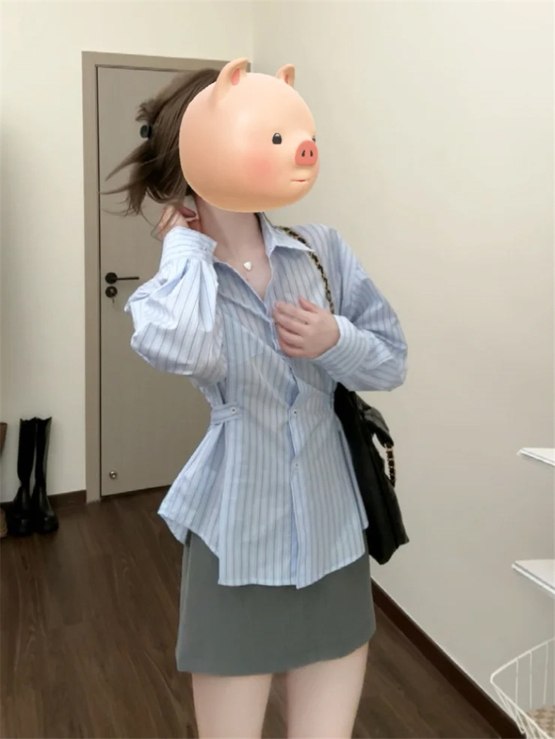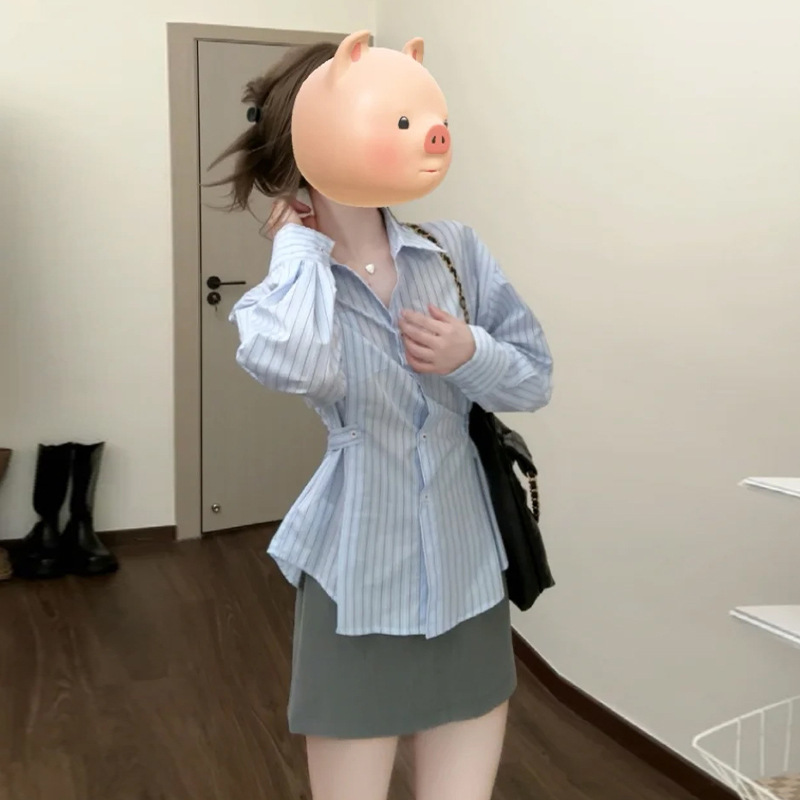 2025 년 초 가을 새로운 프랑스 스타일 독특한 아름다운 푸른 줄무늬 셔츠 여성의 하이 엔드 센스 셔츠 허리 긴팔 탑스토어 가기