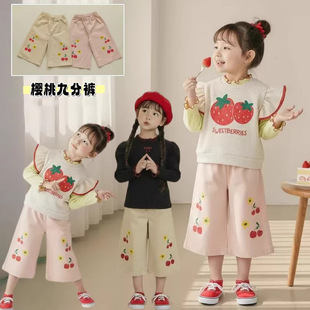 2026新品卡通女童宝宝纯色草莓阔腿休闲九分裤宝宝儿童阔腿裤