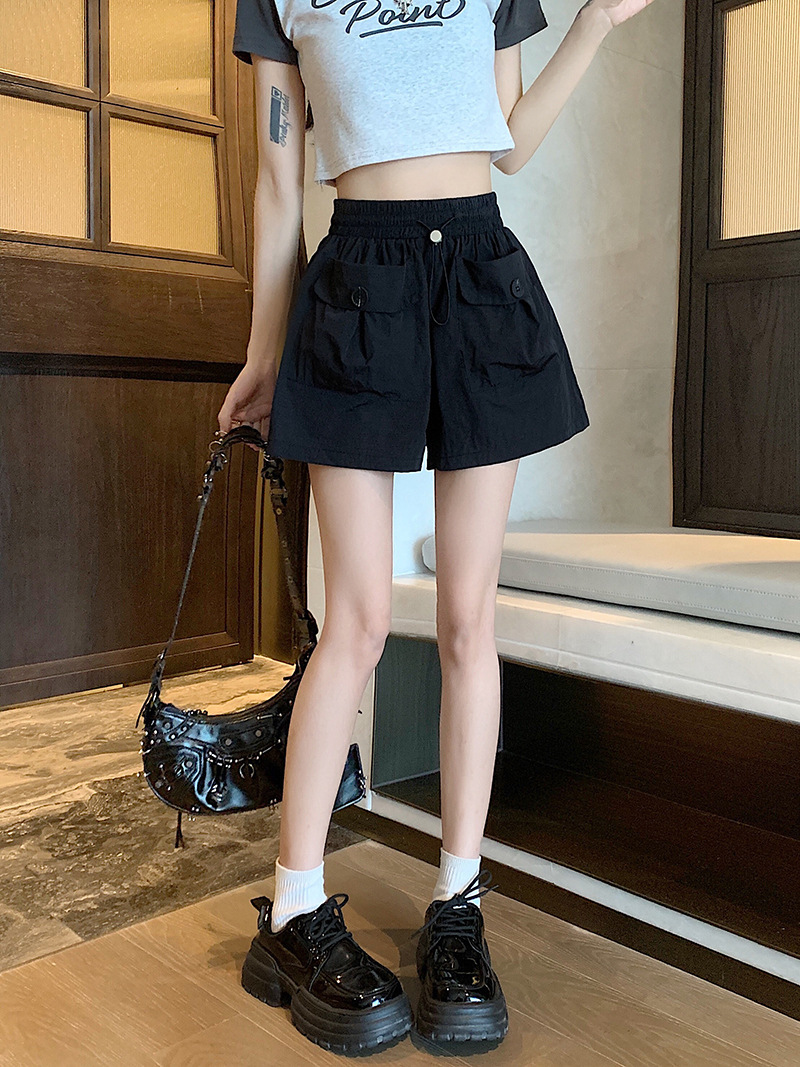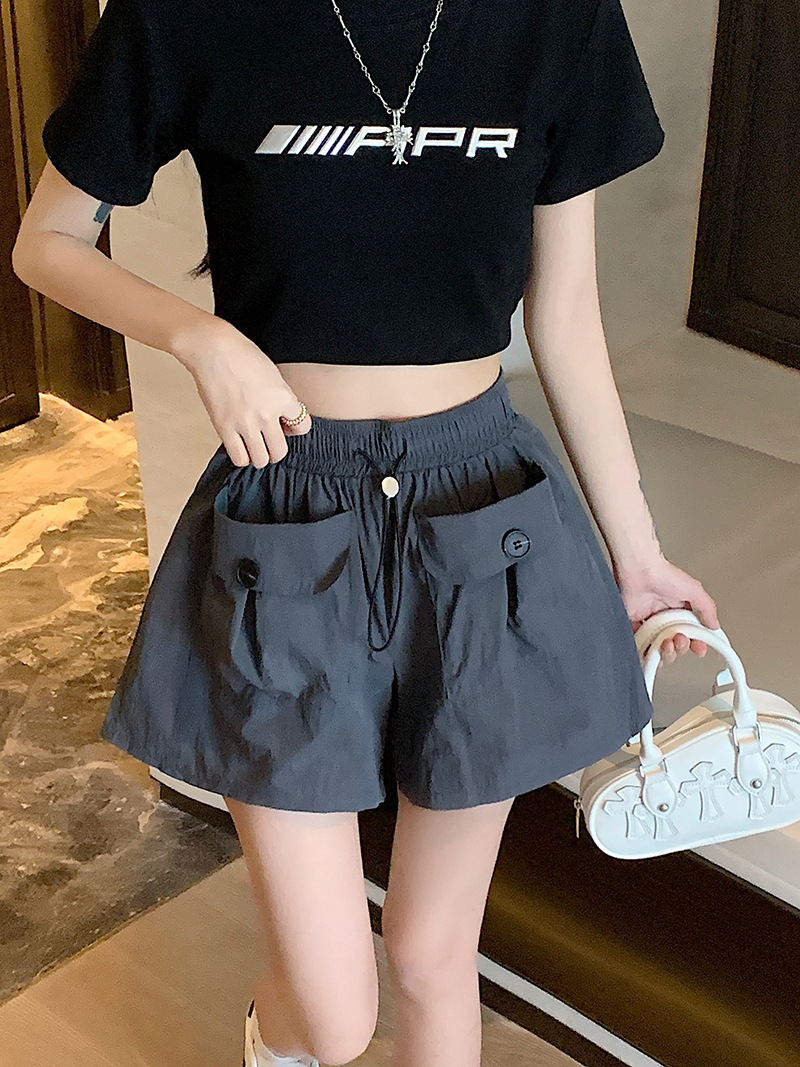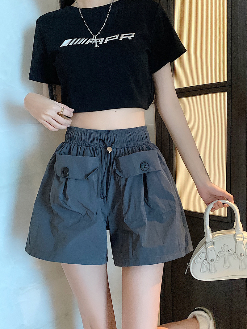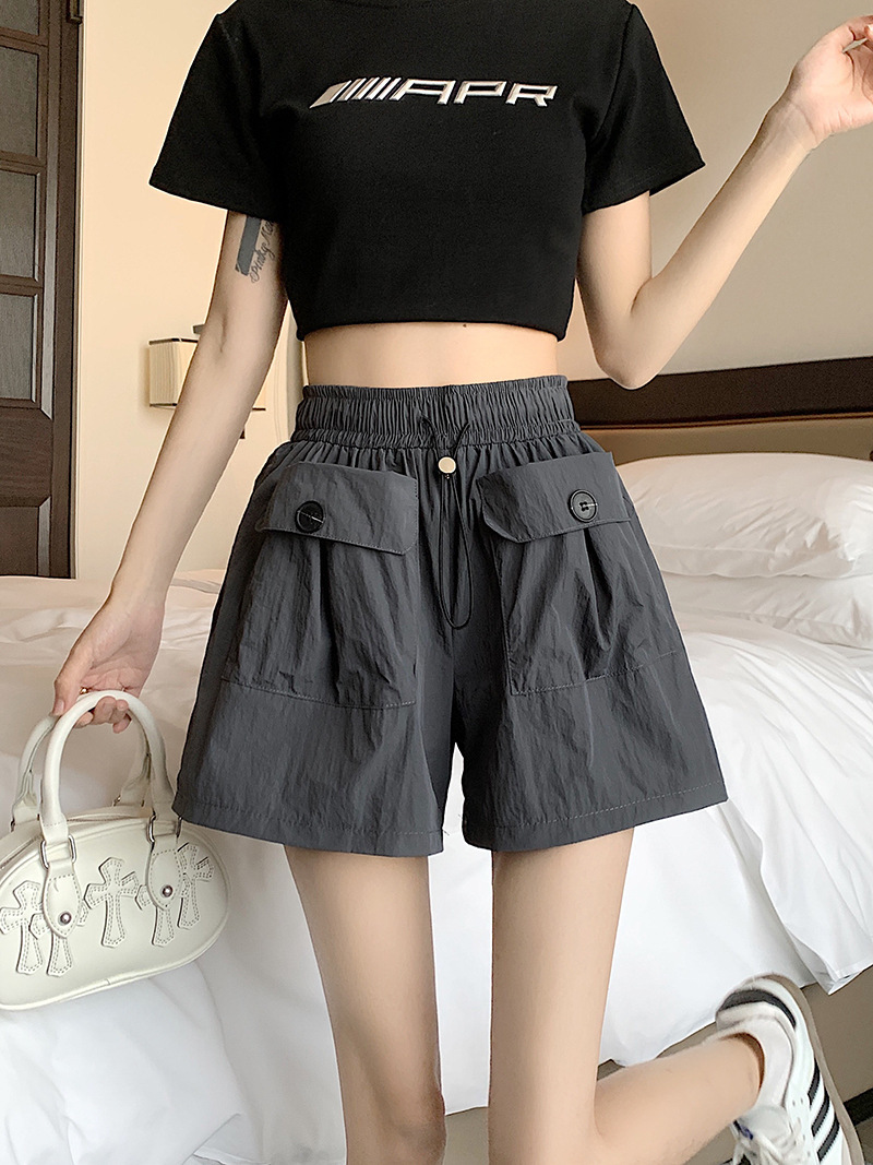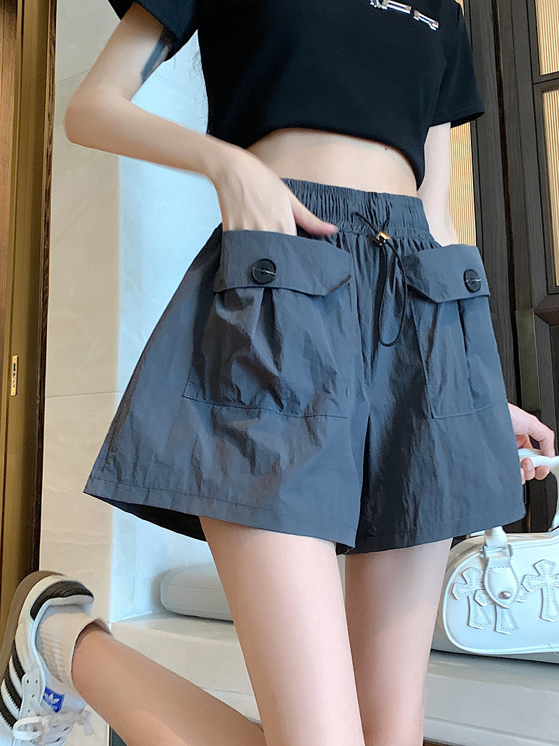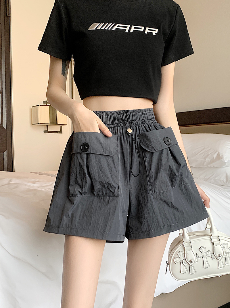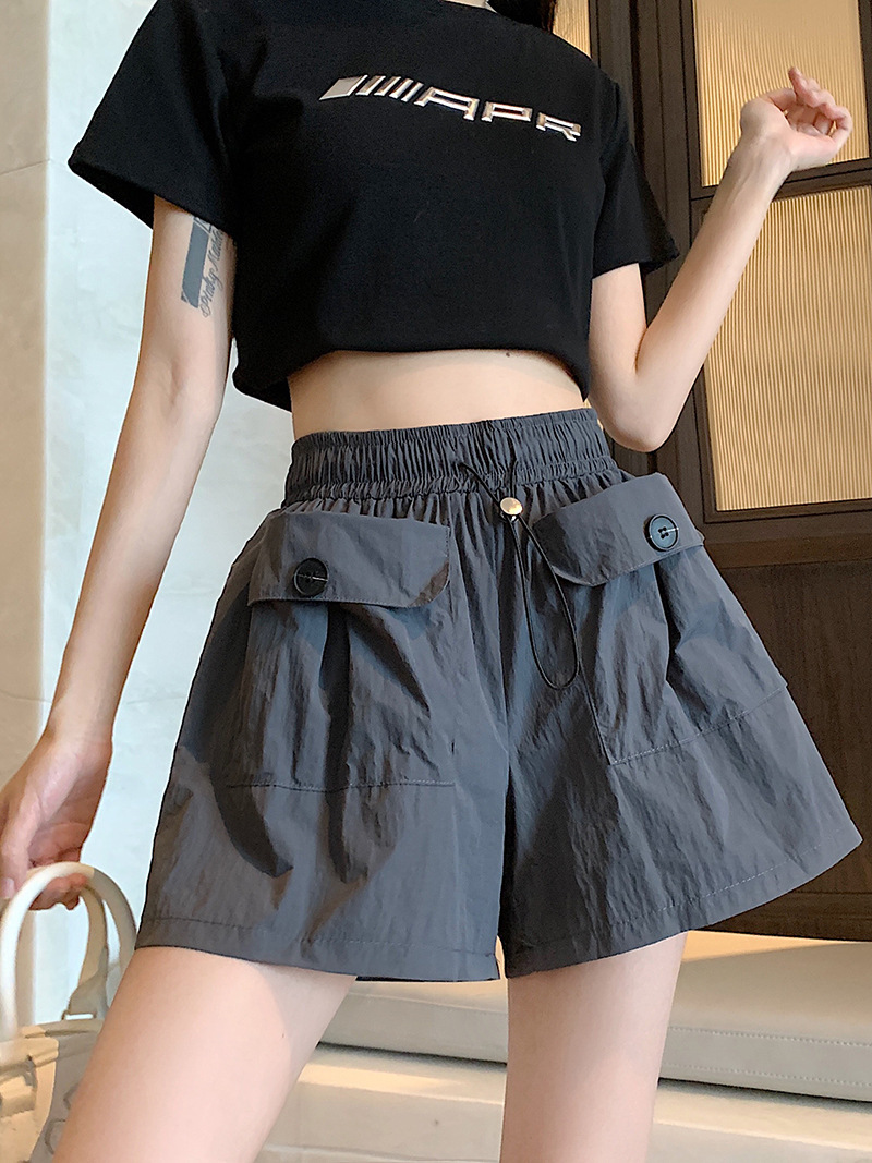 높은 허리 슬리밍 스파이스 소녀 회색 캐주얼 반바지 여성 여름 2025 새로운 도착 작업복 와이드 다리 더블 포켓 드로우 스트링 바지스토어 가기