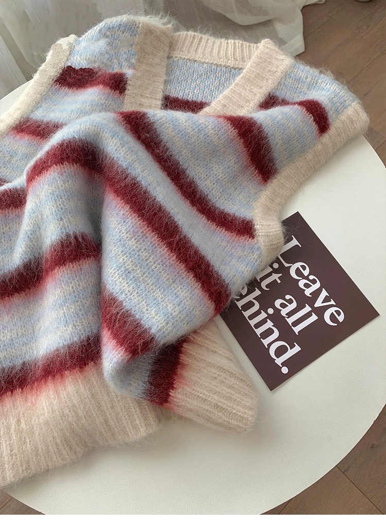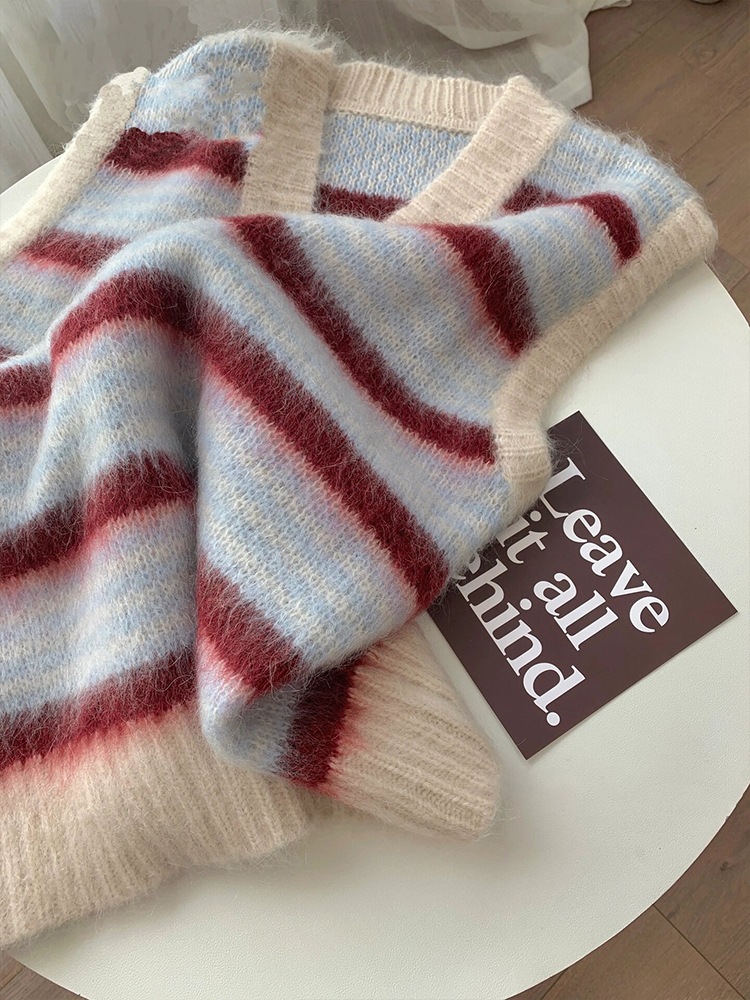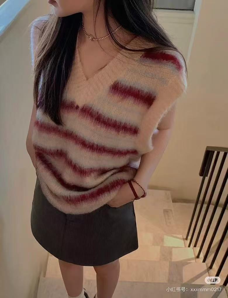 여성을 위한 플러시하고 편안한 브이넥 민소매 조끼의 실제 사진, 이른 봄 새로운 스타일의 핑크 스트라이프 레이어드 조끼스토어 가기