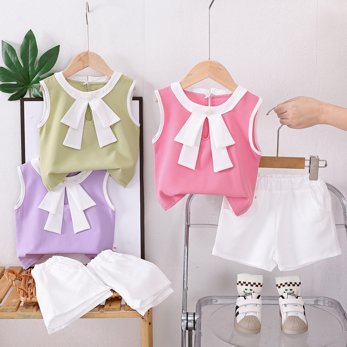 여아 민소매 여름복, 신상 아기 여름옷, 중소형 아동용 쉬폰 얇은 조끼 투피스 세트, 인기 폭발스토어 가기