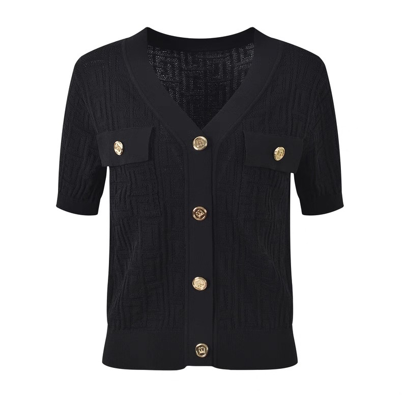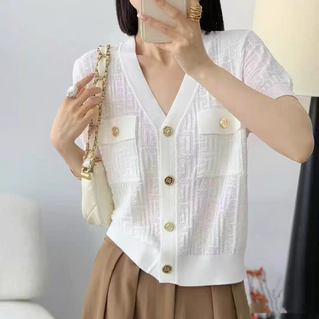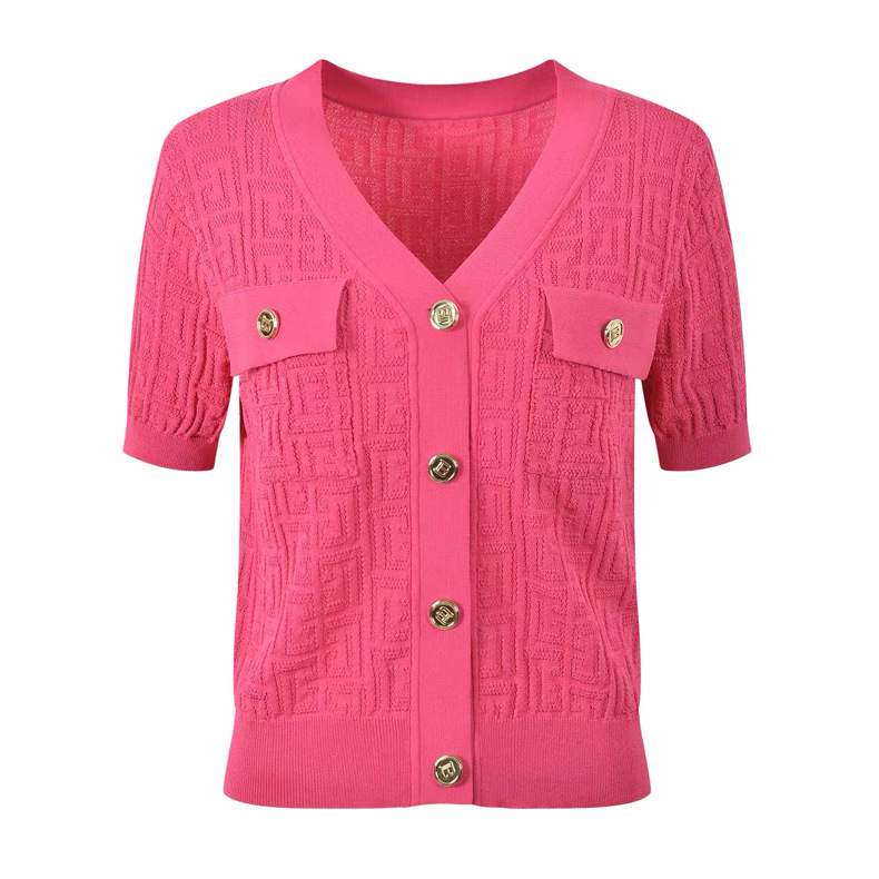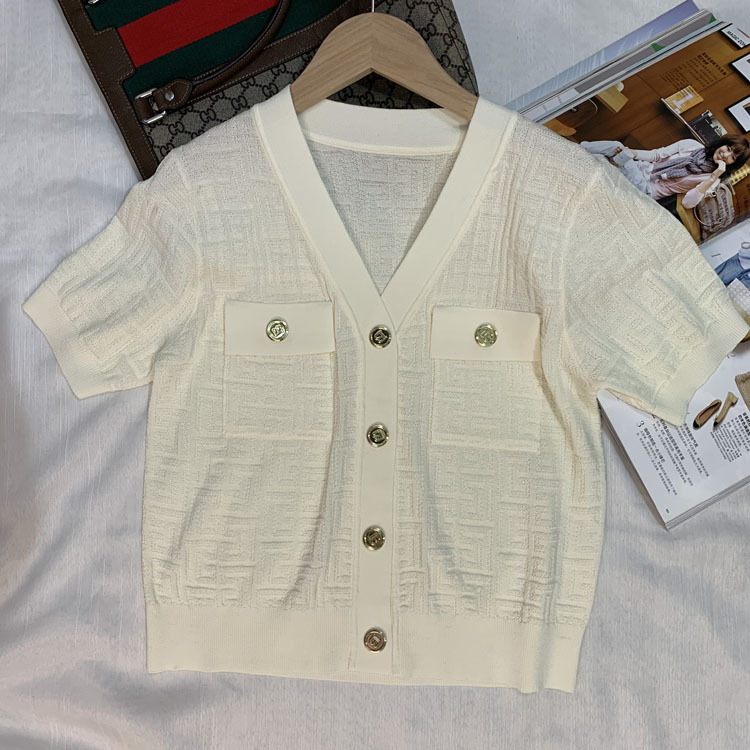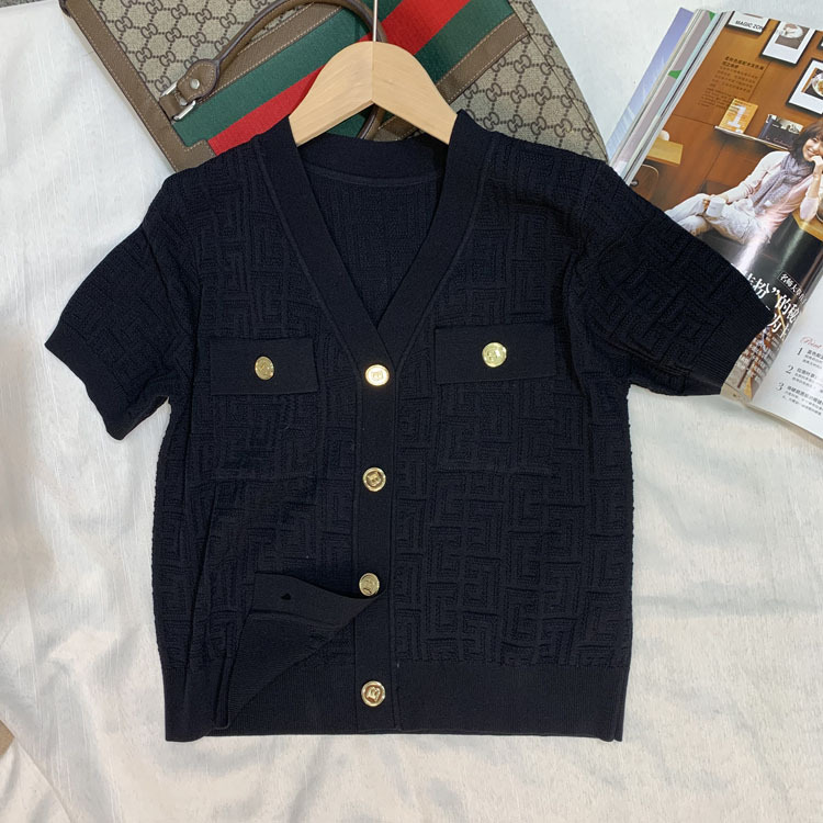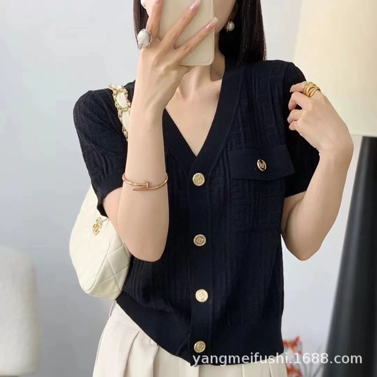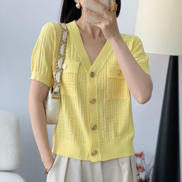 2026 봄 신상 스타일리쉬한 V넥 반팔 금속 단추 타월 자수 자카드 숏 텐셀 니트 여성용스토어 가기