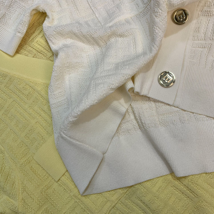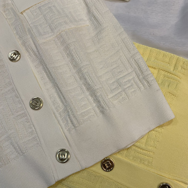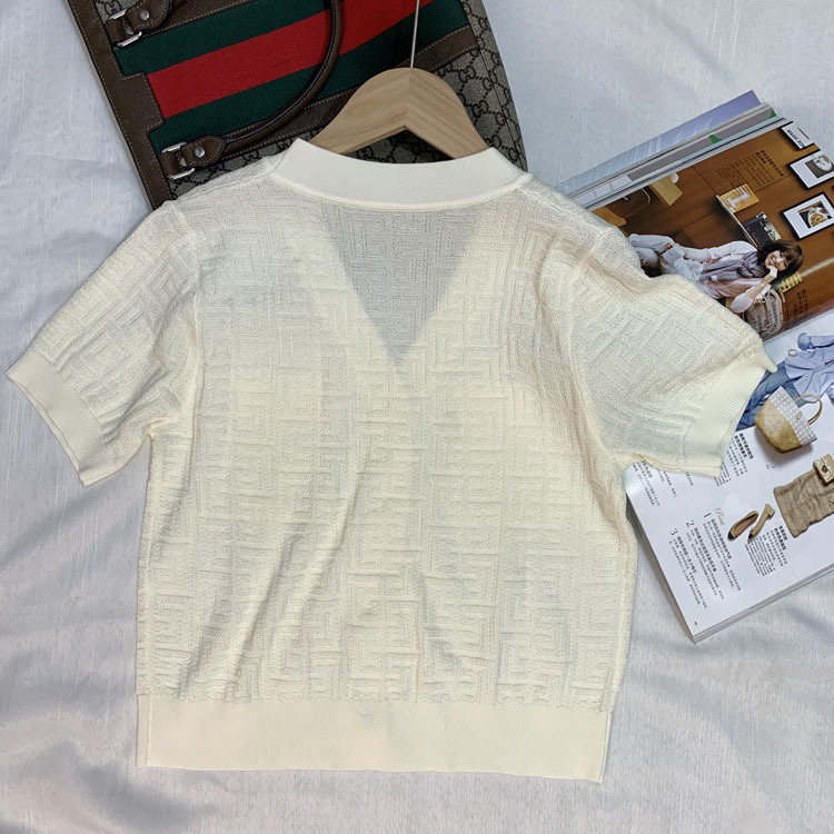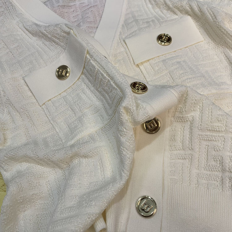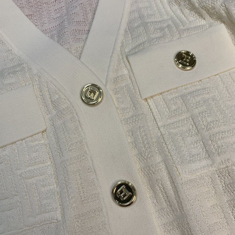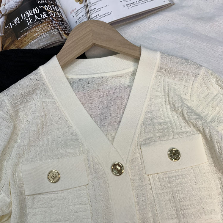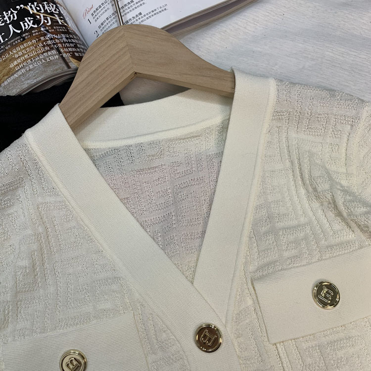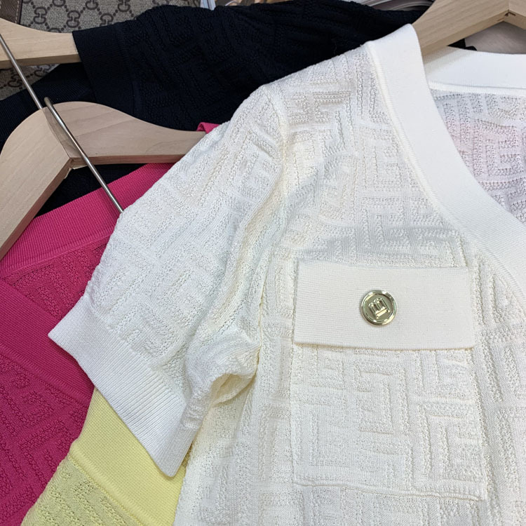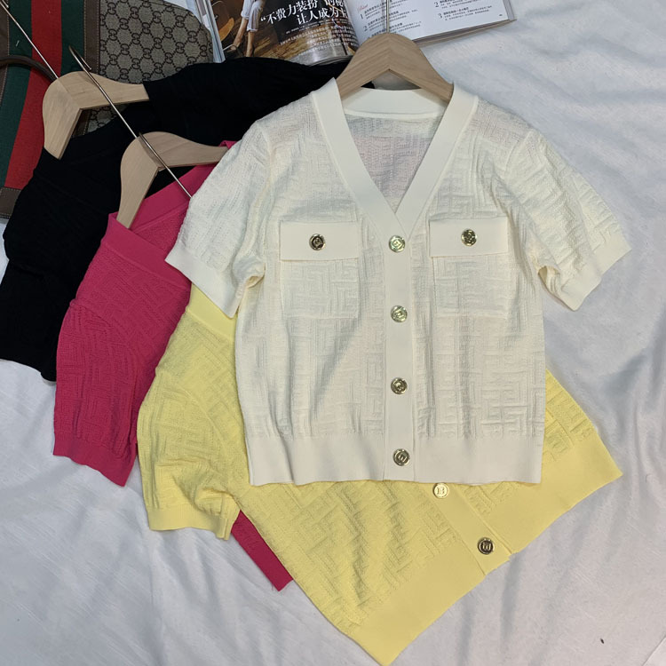 2026 봄 신상 스타일리쉬한 V넥 반팔 금속 단추 타월 자수 자카드 숏 텐셀 니트 여성용스토어 가기