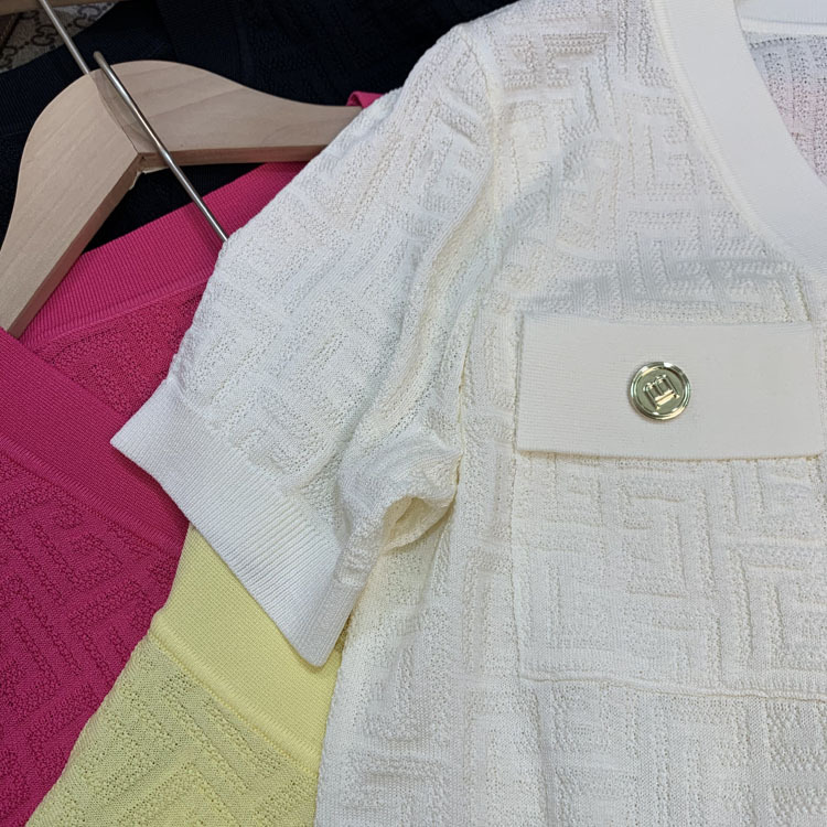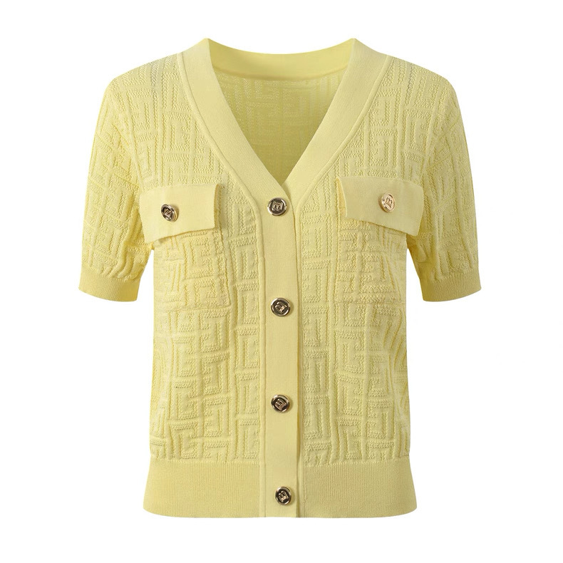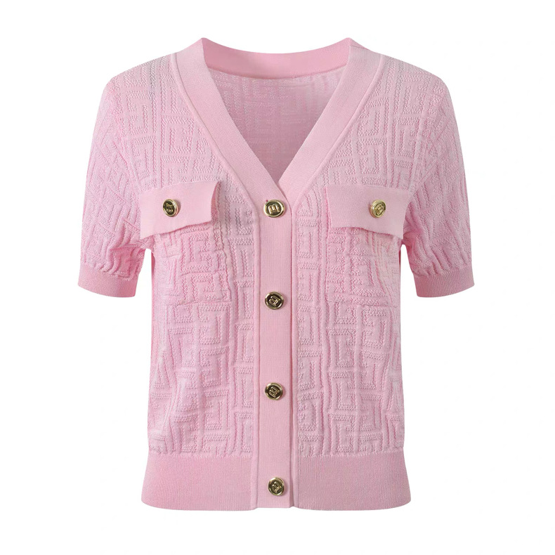 2026 봄 신상 스타일리쉬한 V넥 반팔 금속 단추 타월 자수 자카드 숏 텐셀 니트 여성용