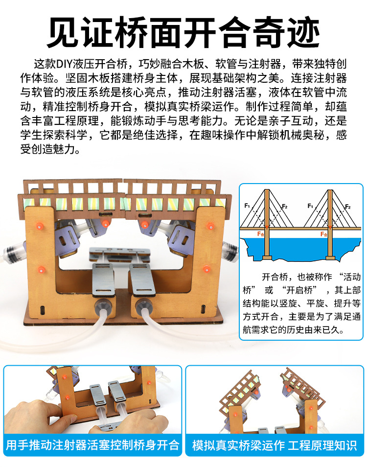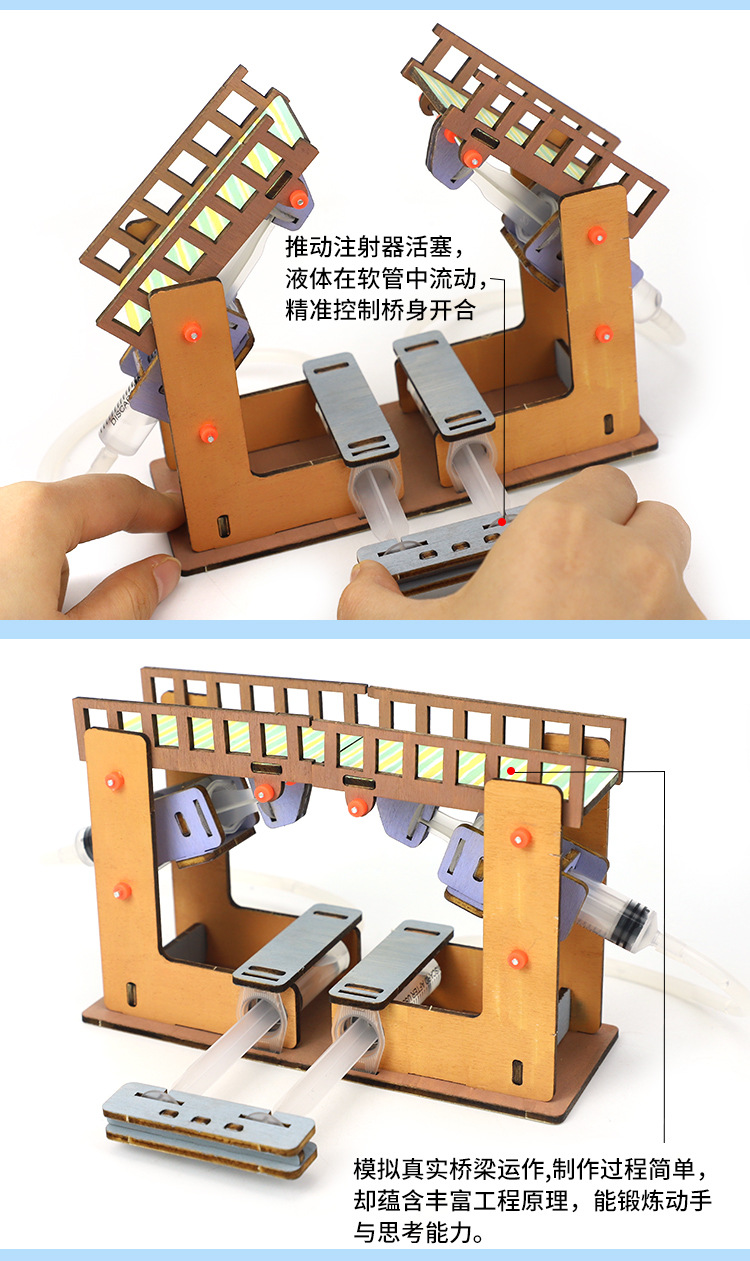 자체 제작 유압 개통 및 폐쇄 교량 역학 교량 건축 과학 작은 실험 재료 패키지 7-12 세 초등학생들이 교육 보조 도구를 사용합니다.