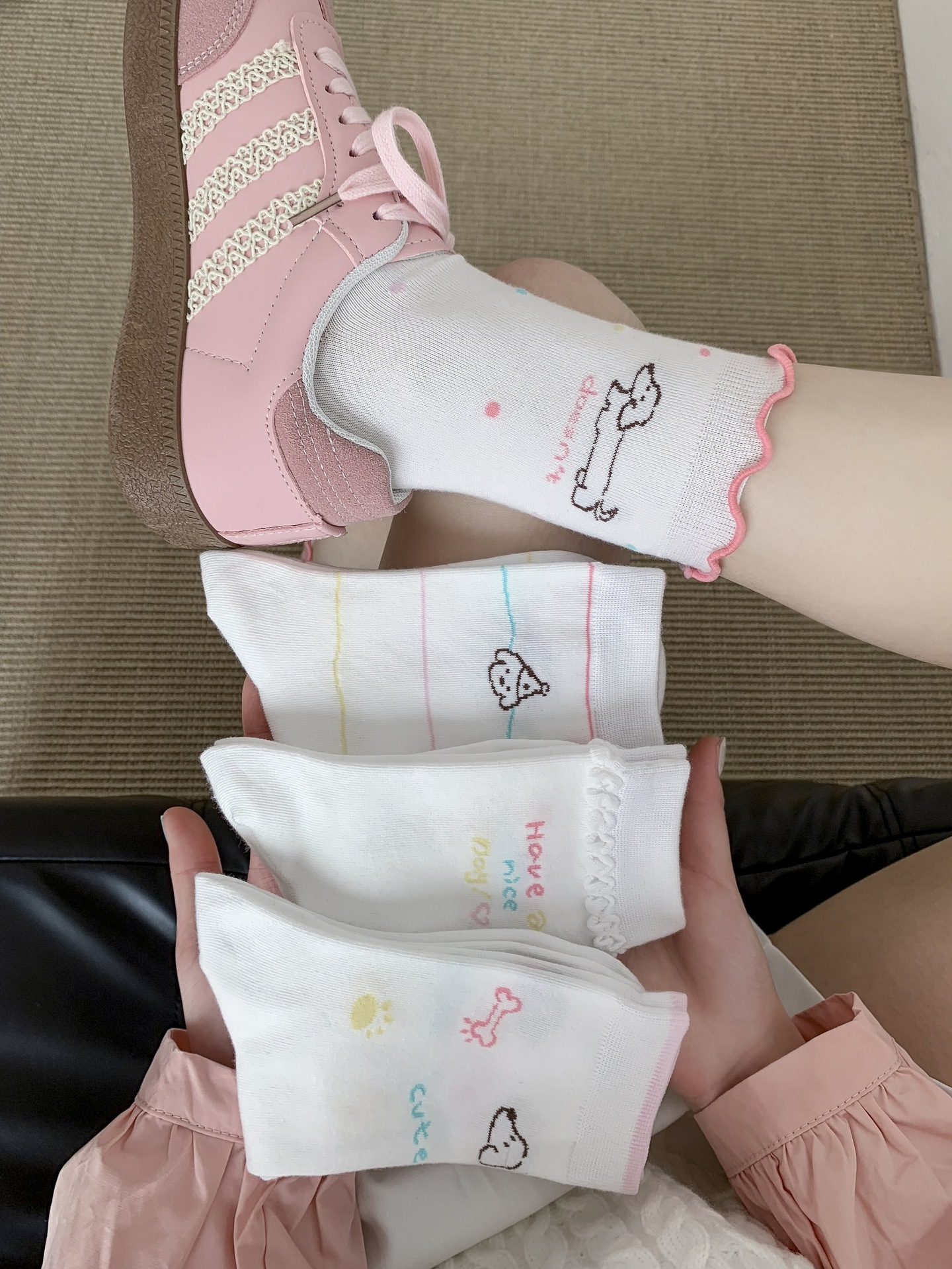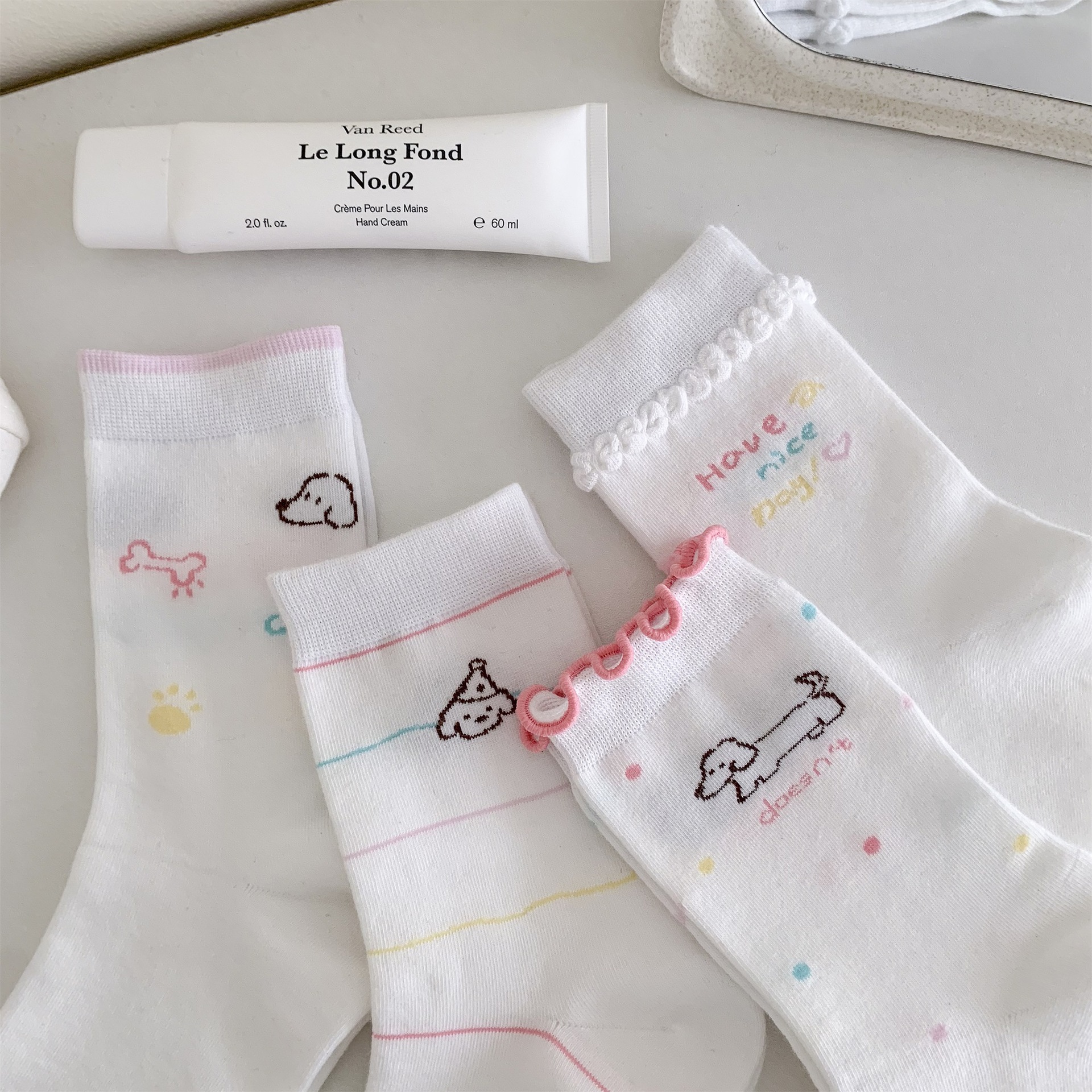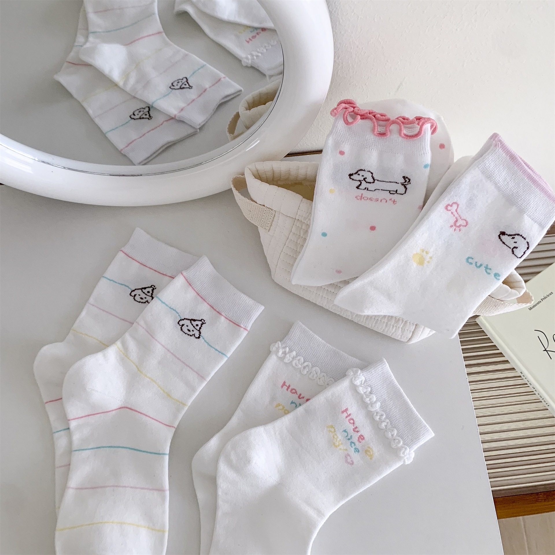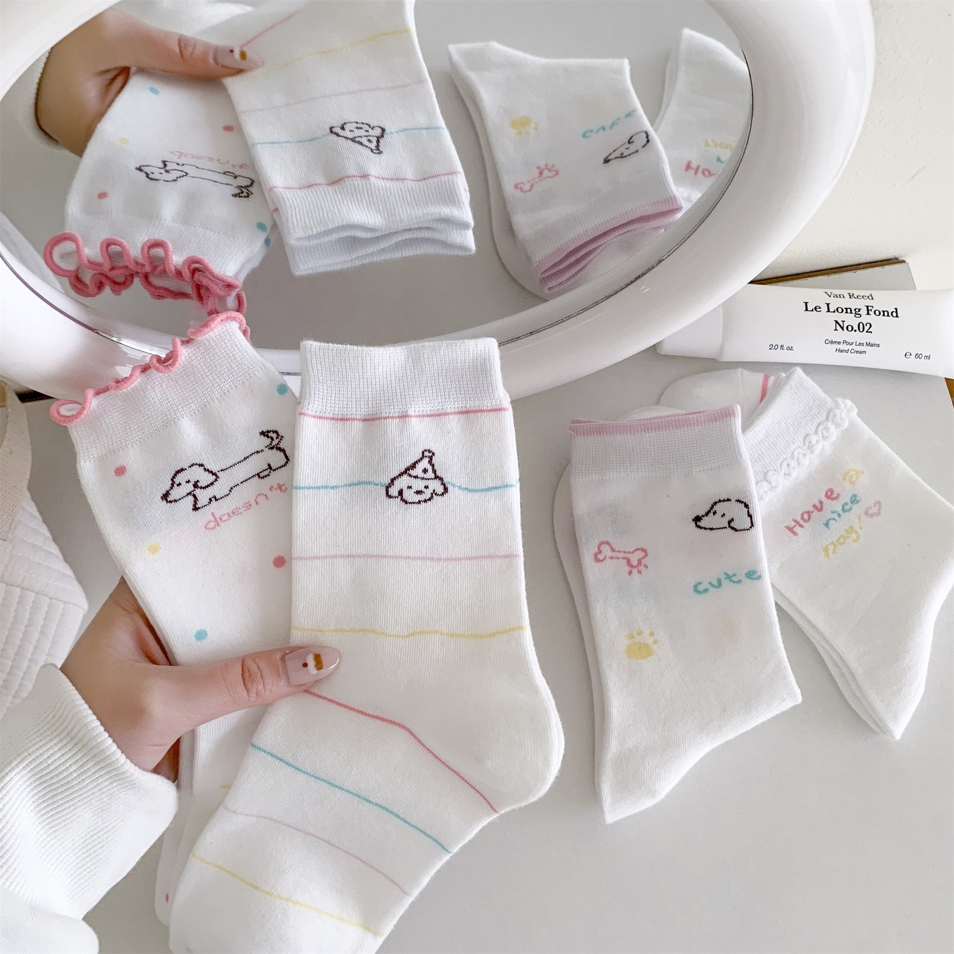 흰색 양말 여성의 봄과 여름 귀여운 그림 강아지 면화 양말 일본 만화 학생 조커 여성 양말 도매