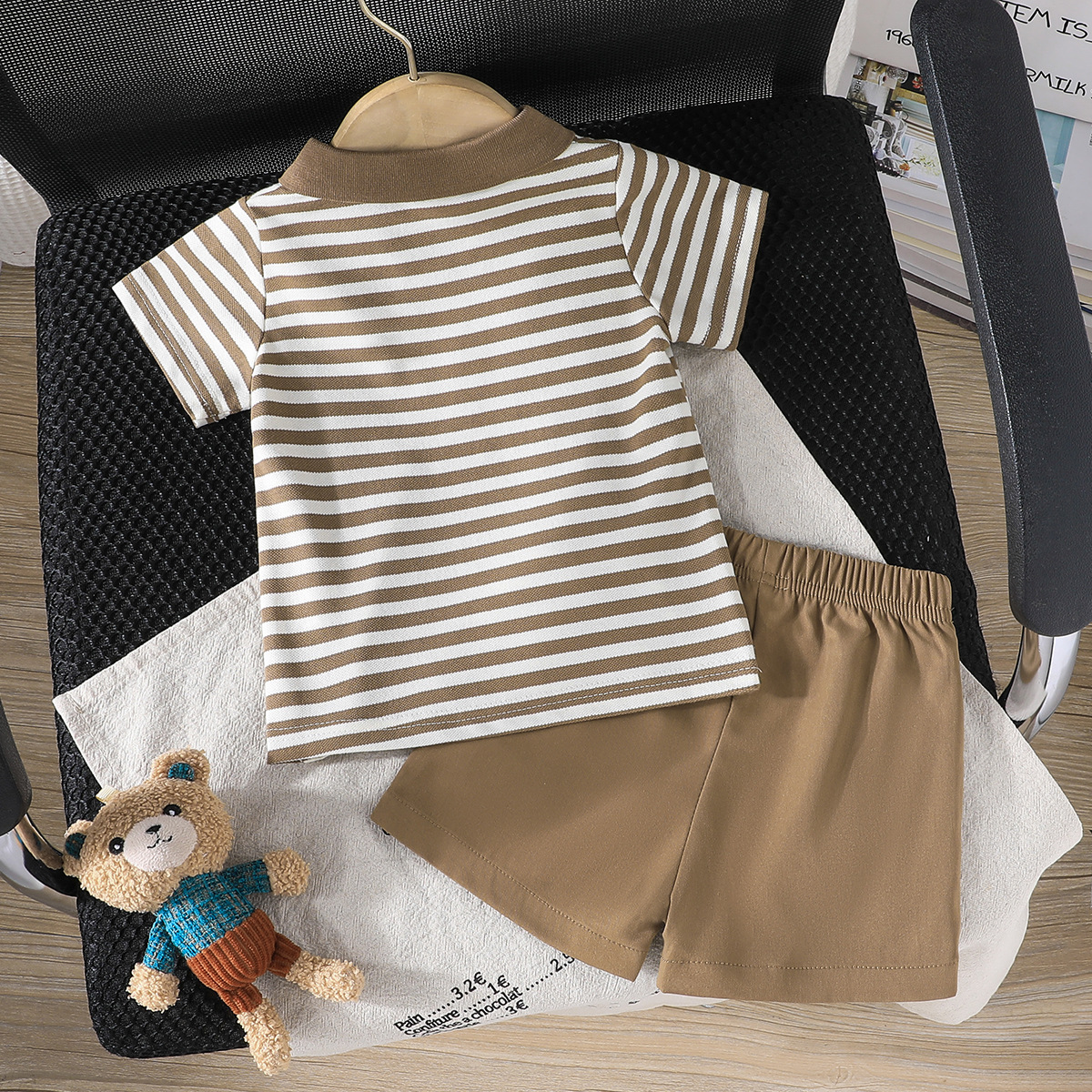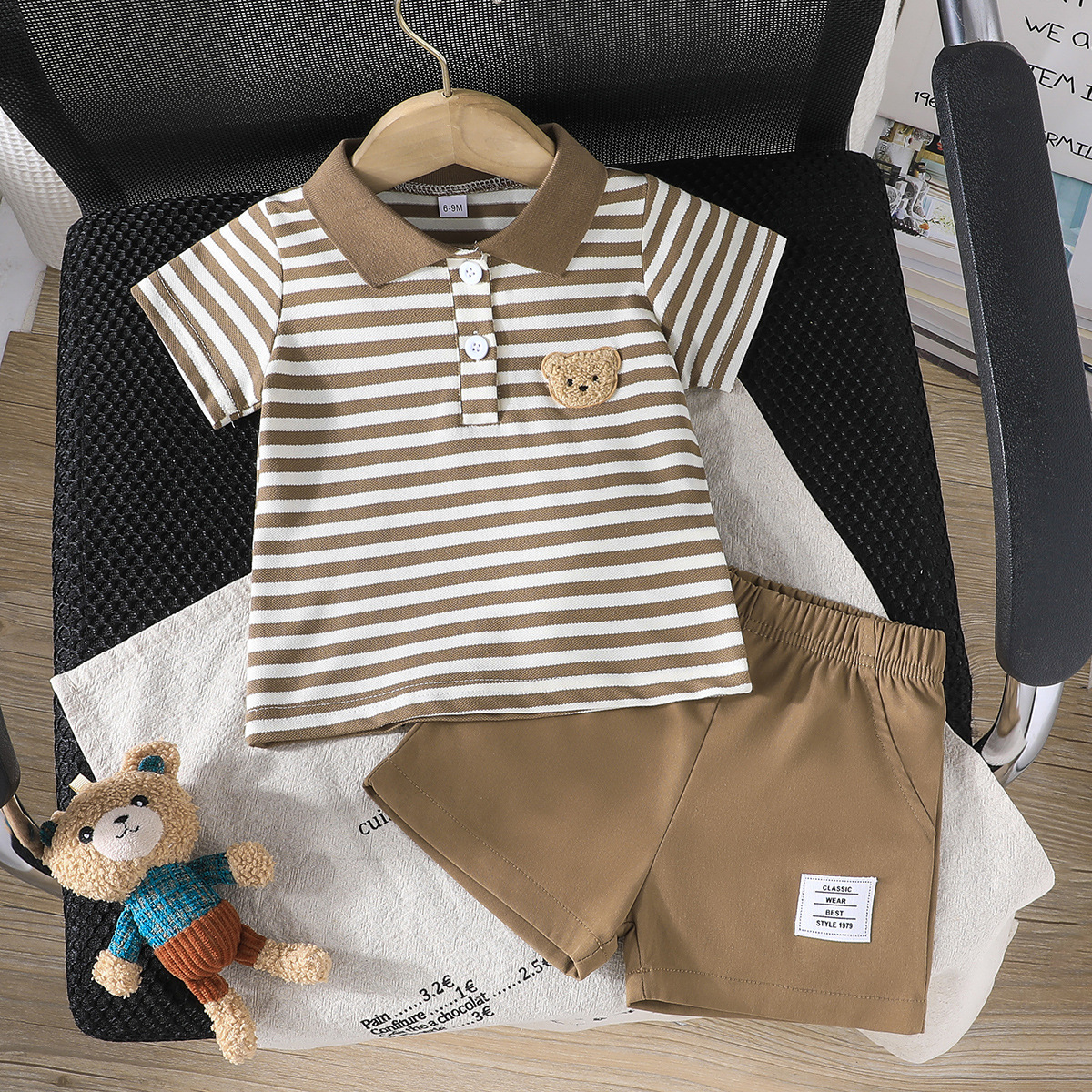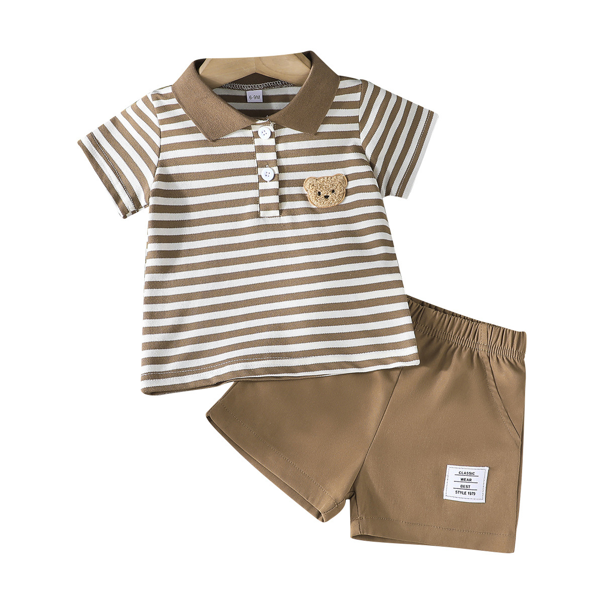 국경 2025 여름 간단한 패션 아기 남자의 새로운 곰 장지 줄무늬 랩 탑 반바지 세트