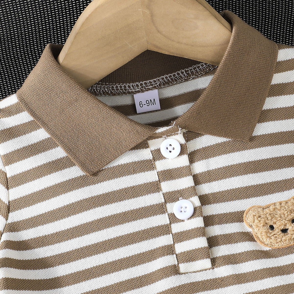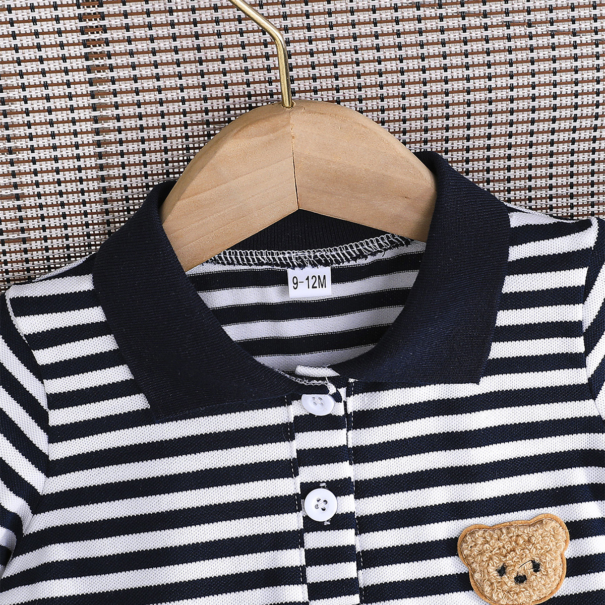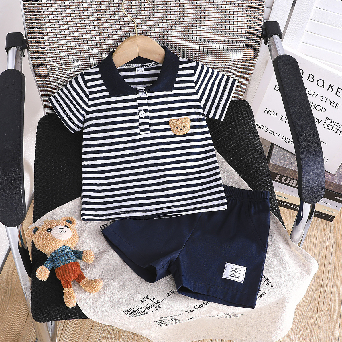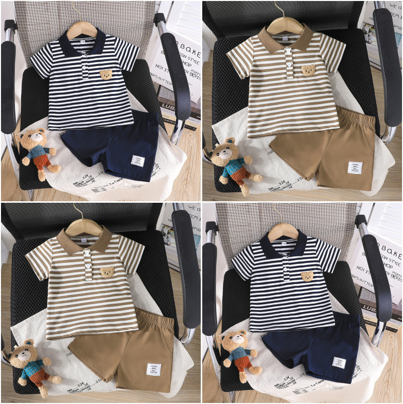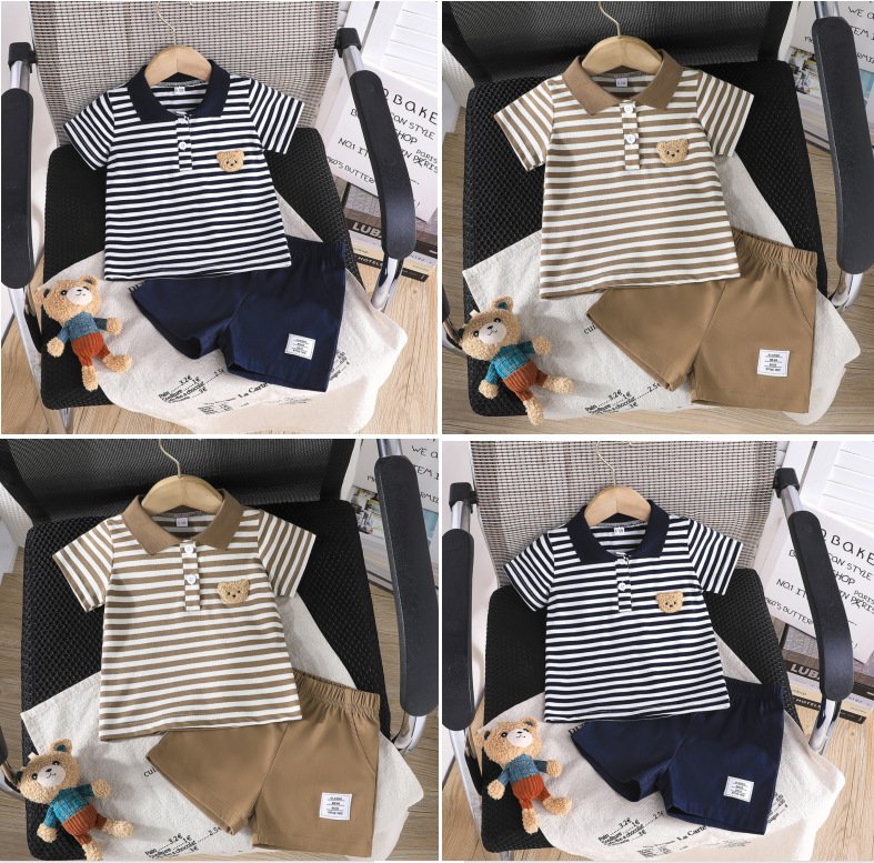 국경 2025 여름 간단한 패션 아기 남자의 새로운 곰 장지 줄무늬 랩 탑 반바지 세트스토어 가기