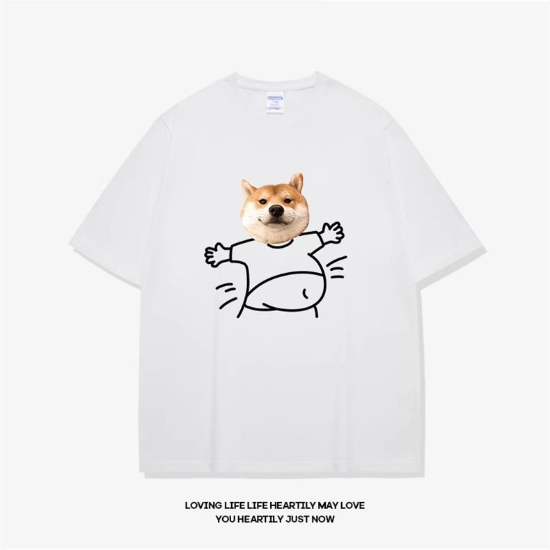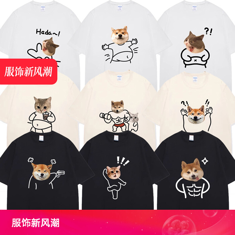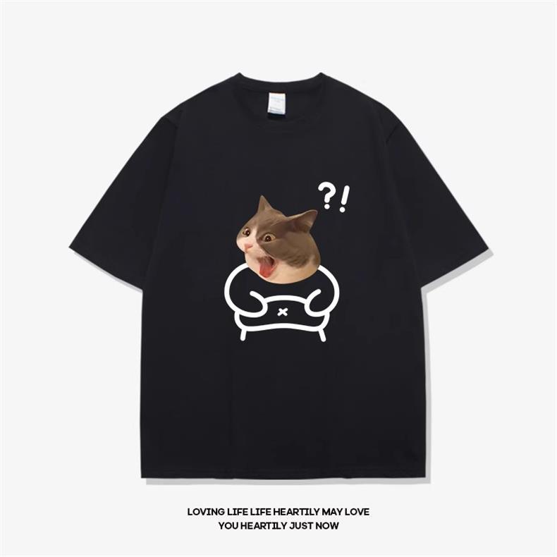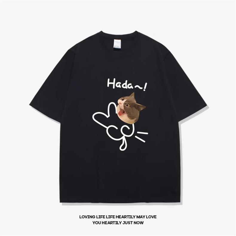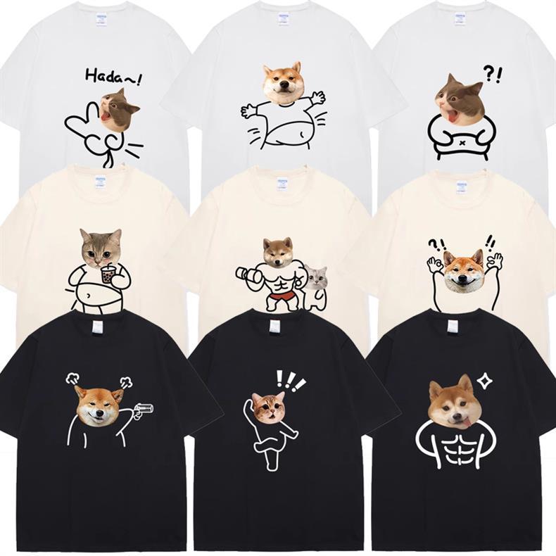고양이와 개 창조적 인 재미있는 디자인 재미있는 커플 짧은 소매 여름 새로운 느슨한 티셔츠 남자의 반 소매