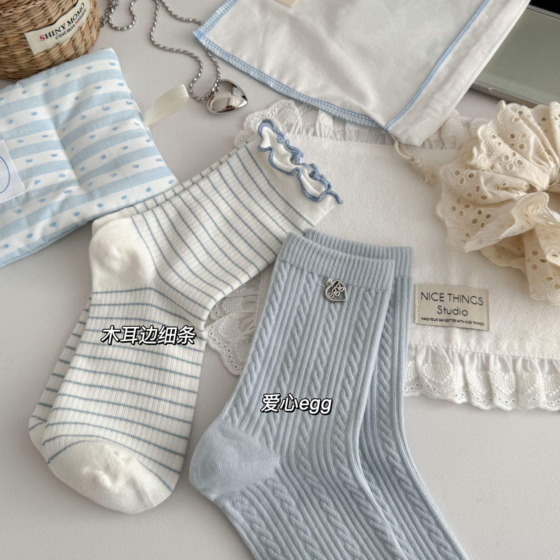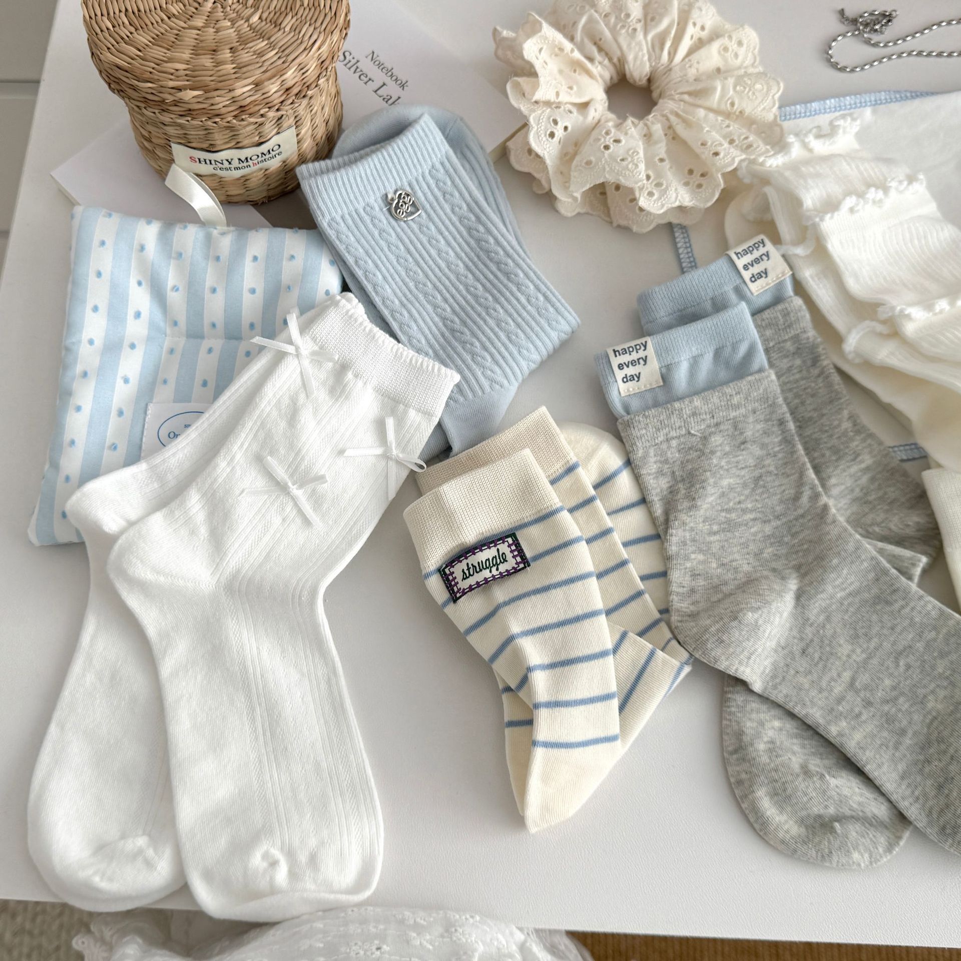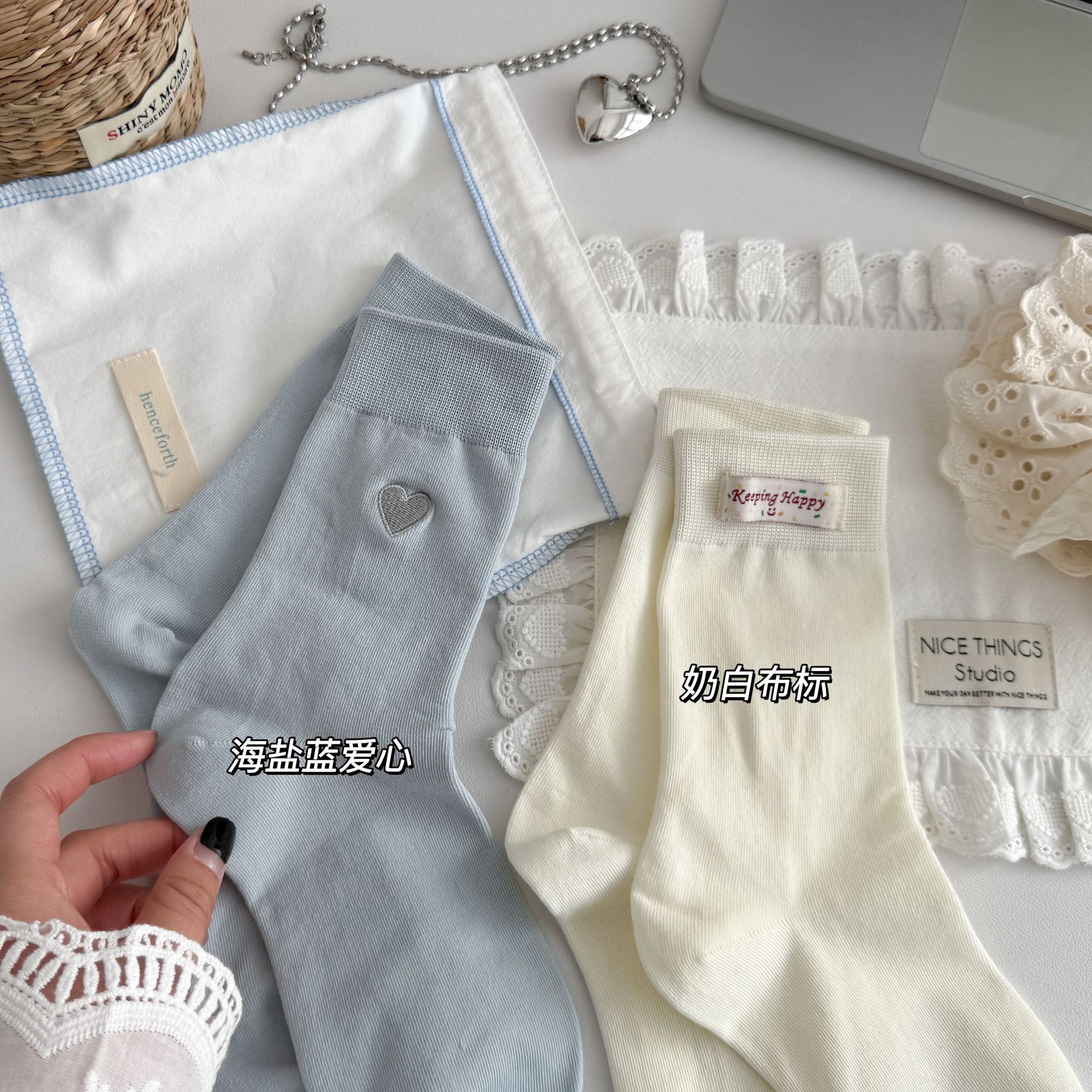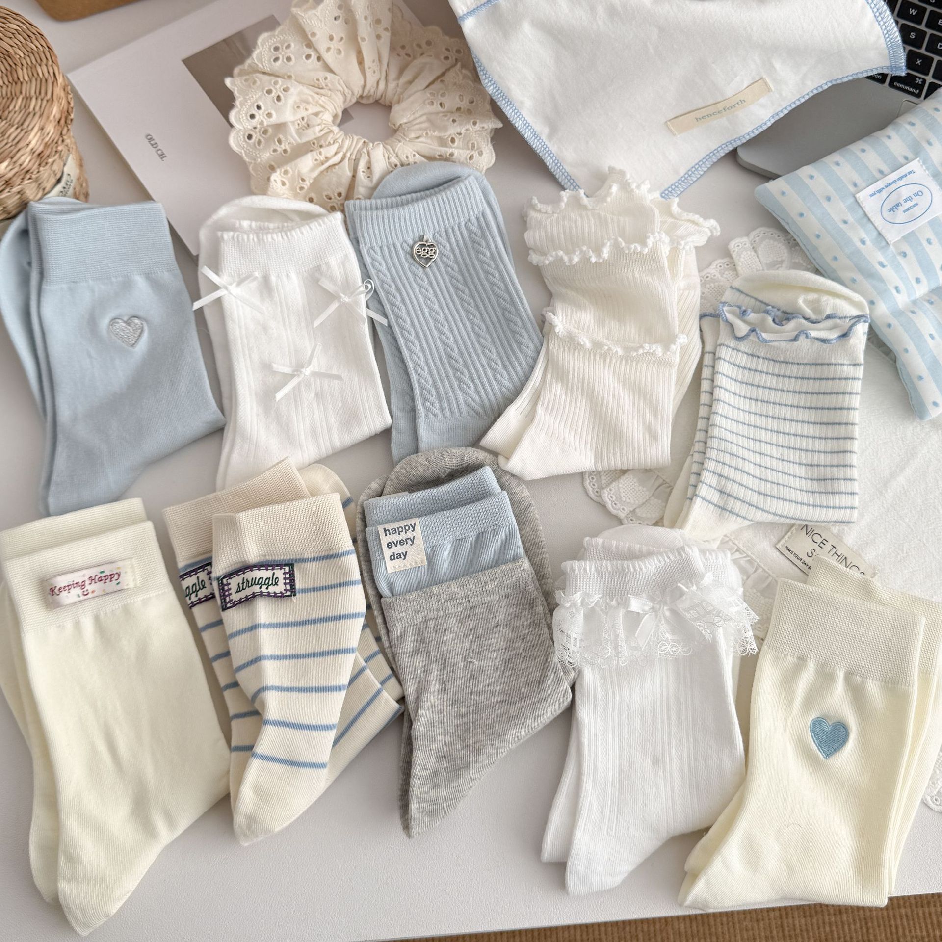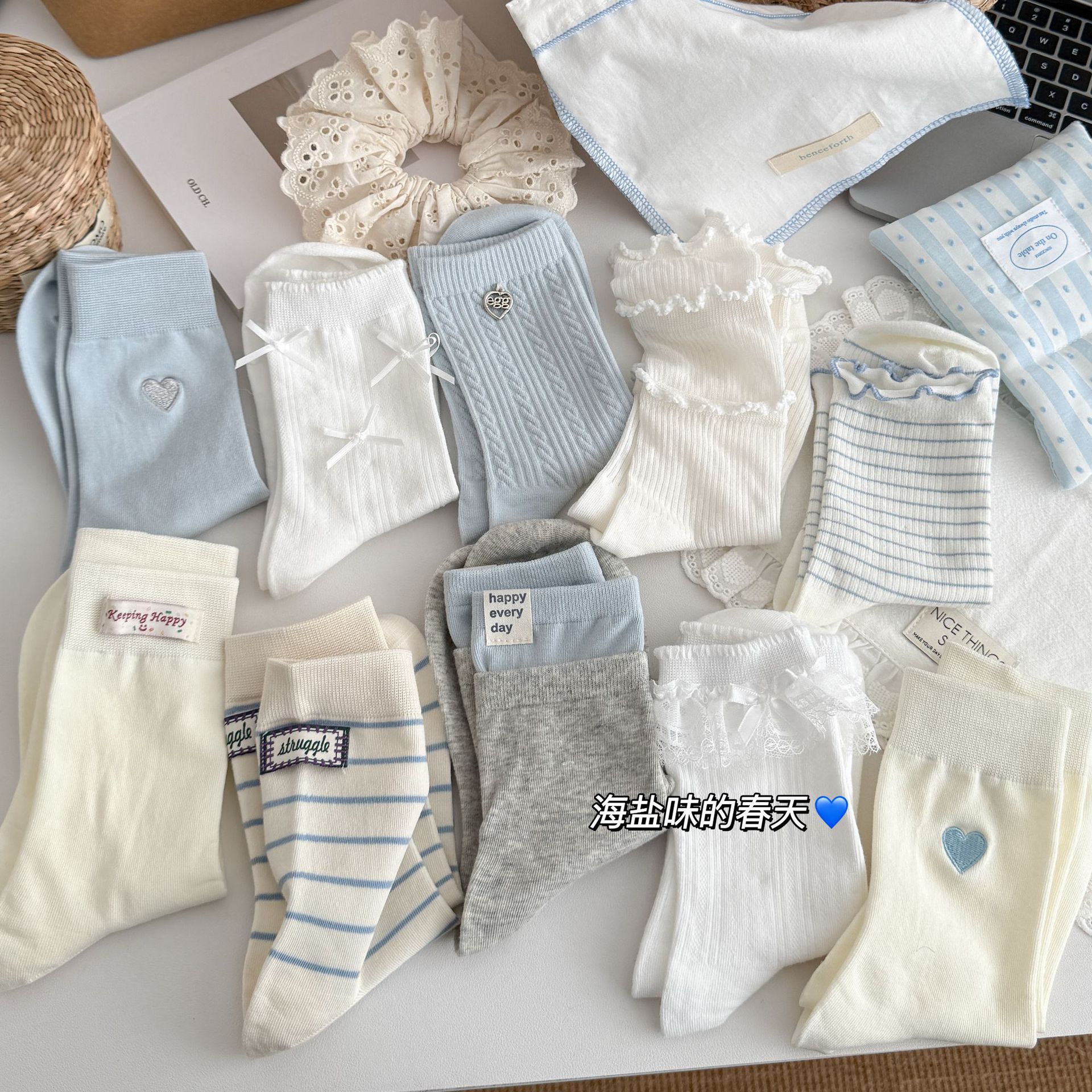 봄과 여름 새로운 한국 스타일 화이트 블루 자수 활 여름 얇은 양말 중간 양말 달콤한 통기성 여성 양말스토어 가기