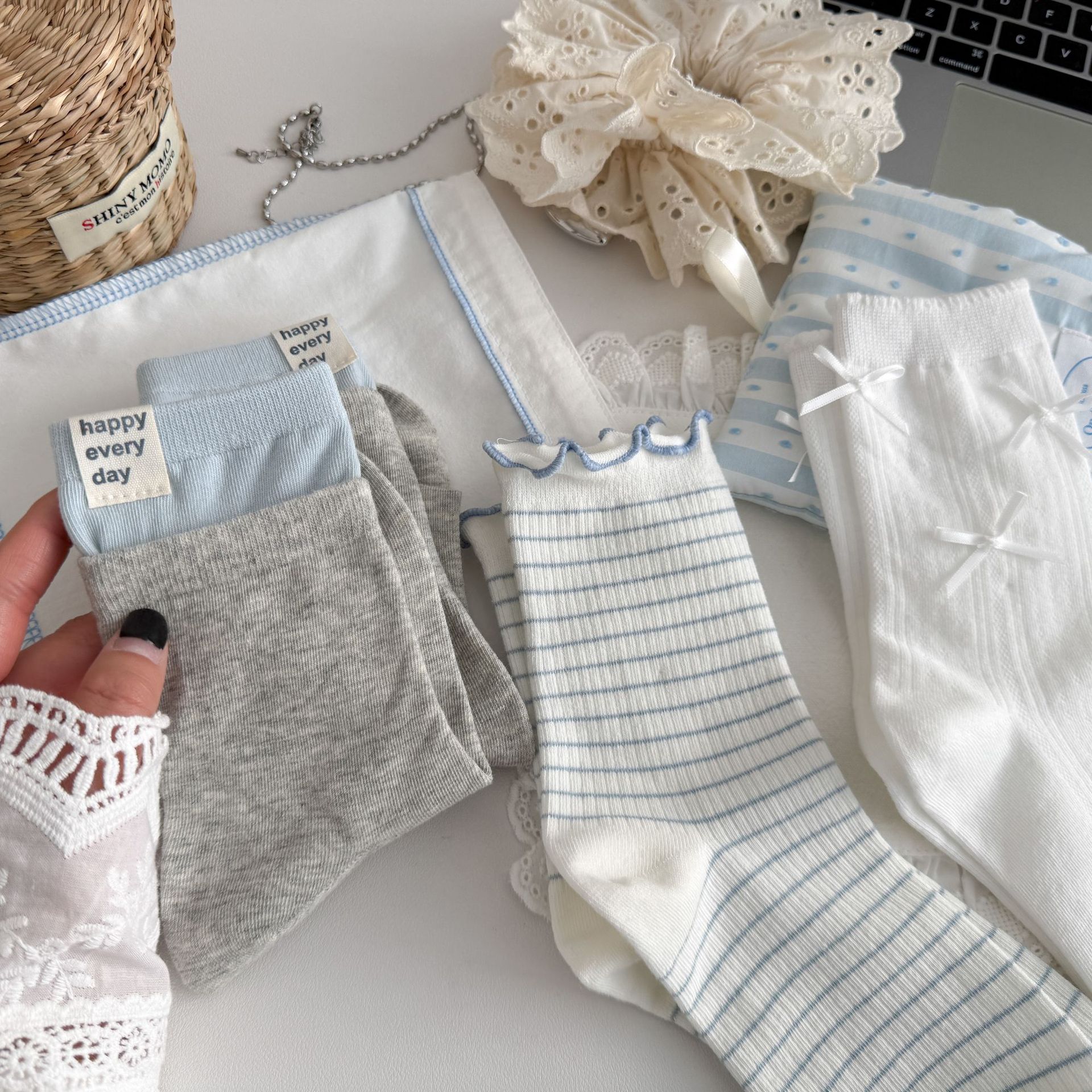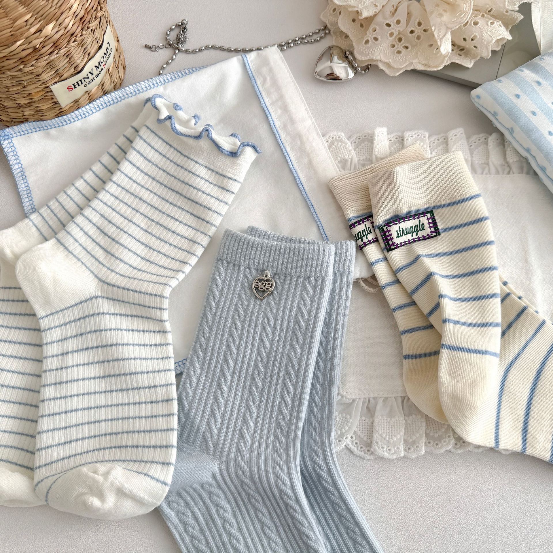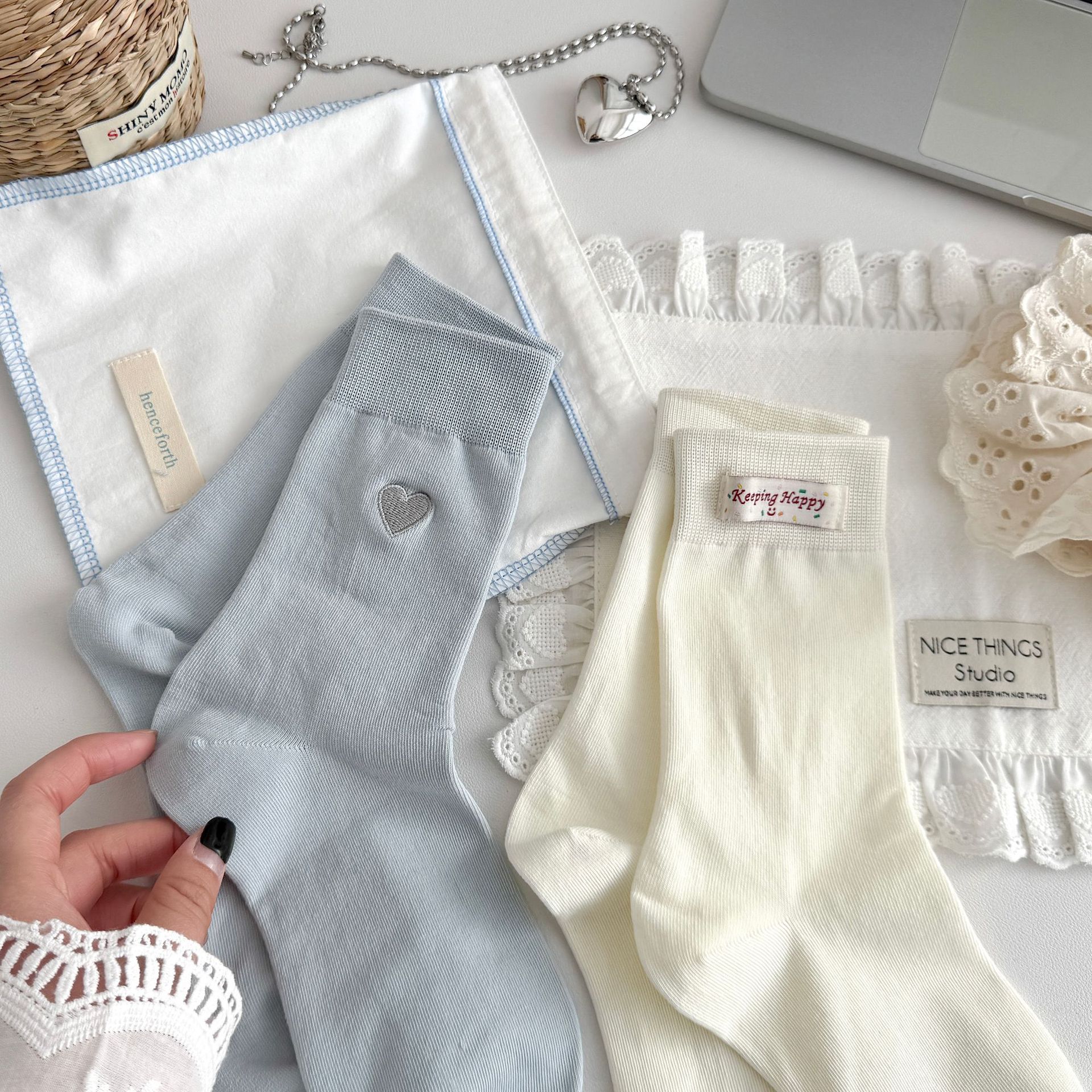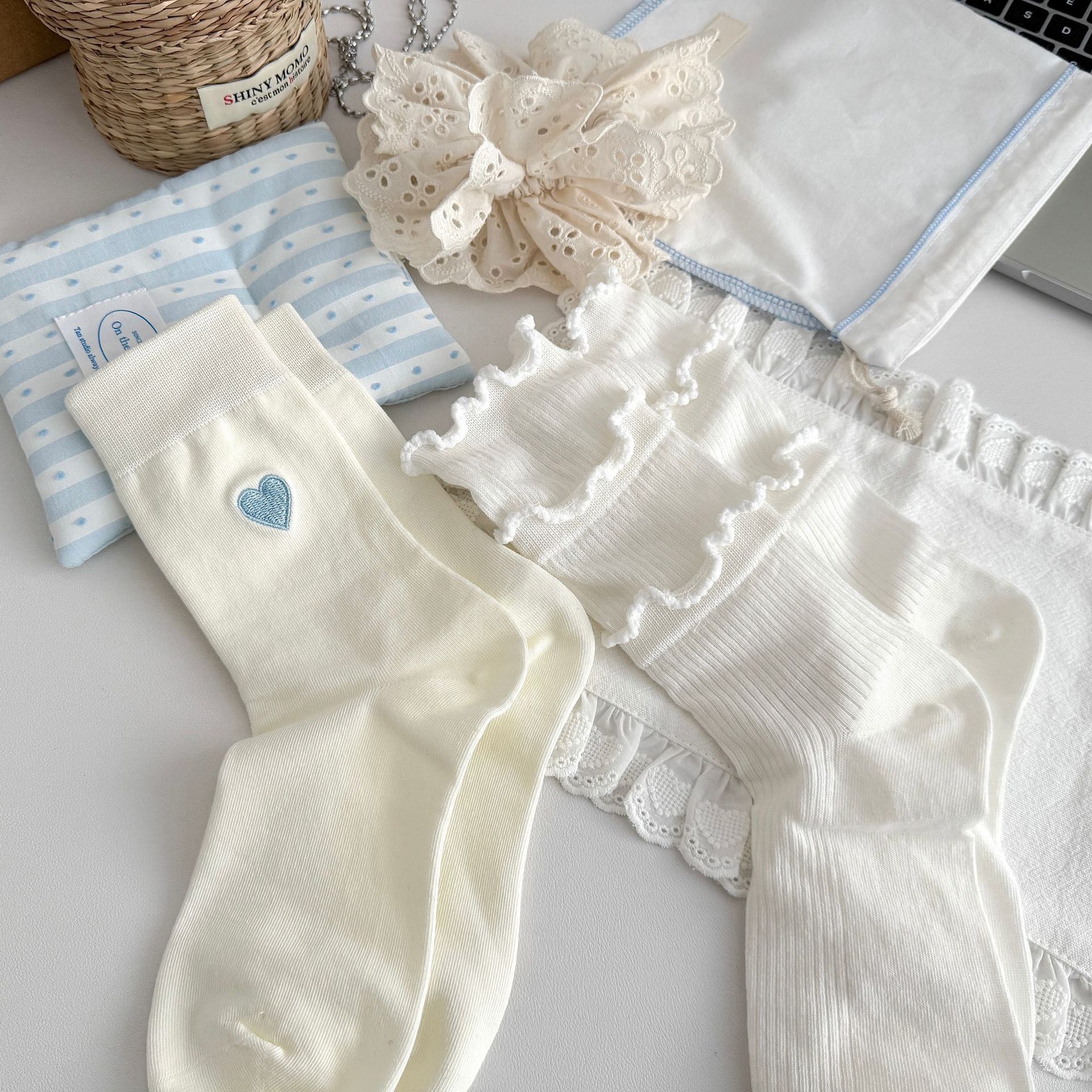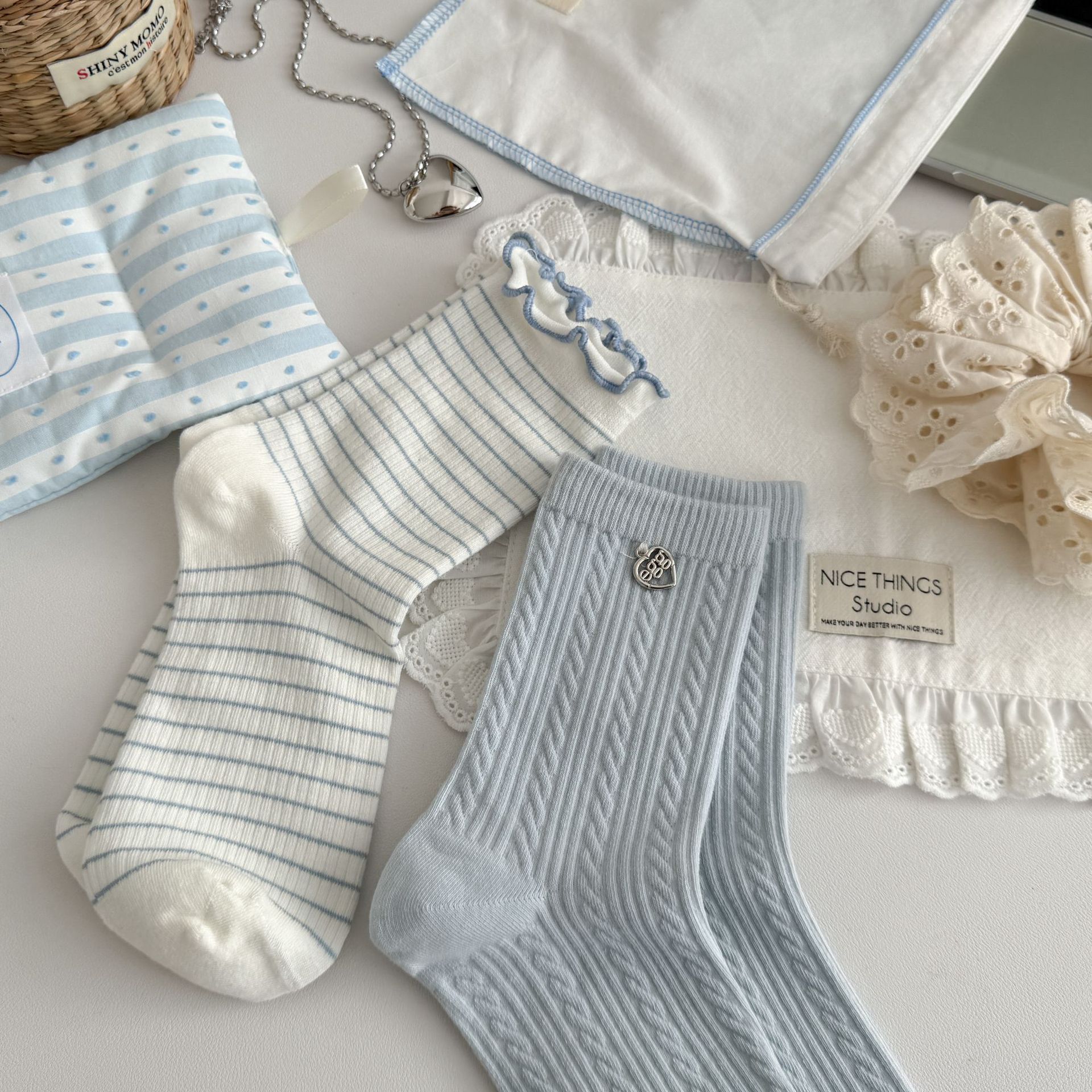 봄과 여름 새로운 한국 스타일 화이트 블루 자수 활 여름 얇은 양말 중간 양말 달콤한 통기성 여성 양말스토어 가기