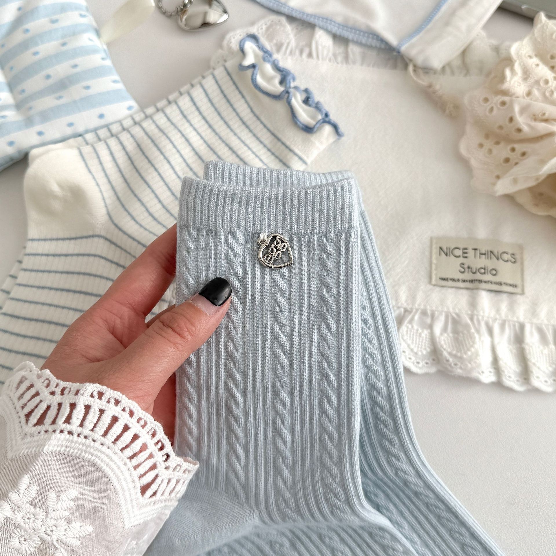 봄과 여름 새로운 한국 스타일 화이트 블루 자수 활 여름 얇은 양말 중간 양말 달콤한 통기성 여성 양말