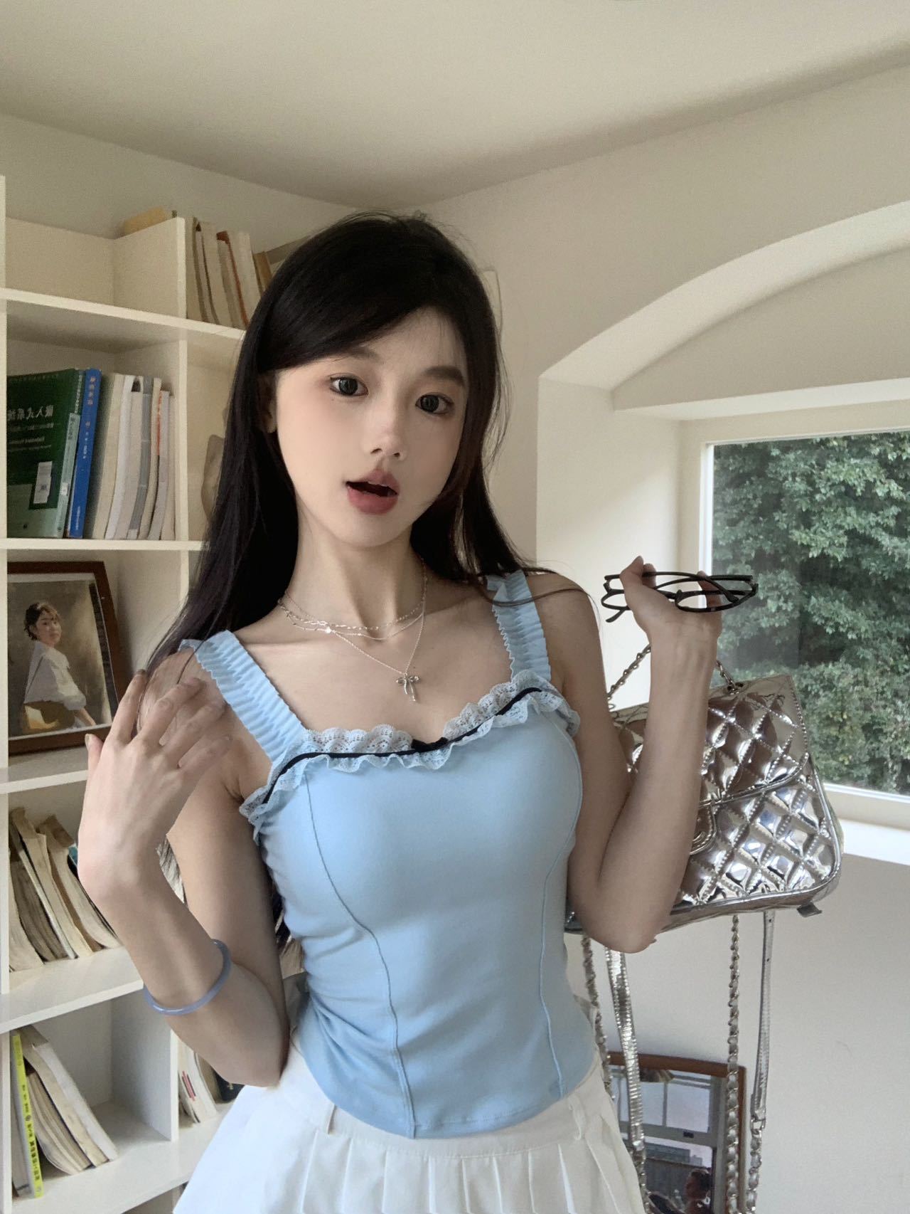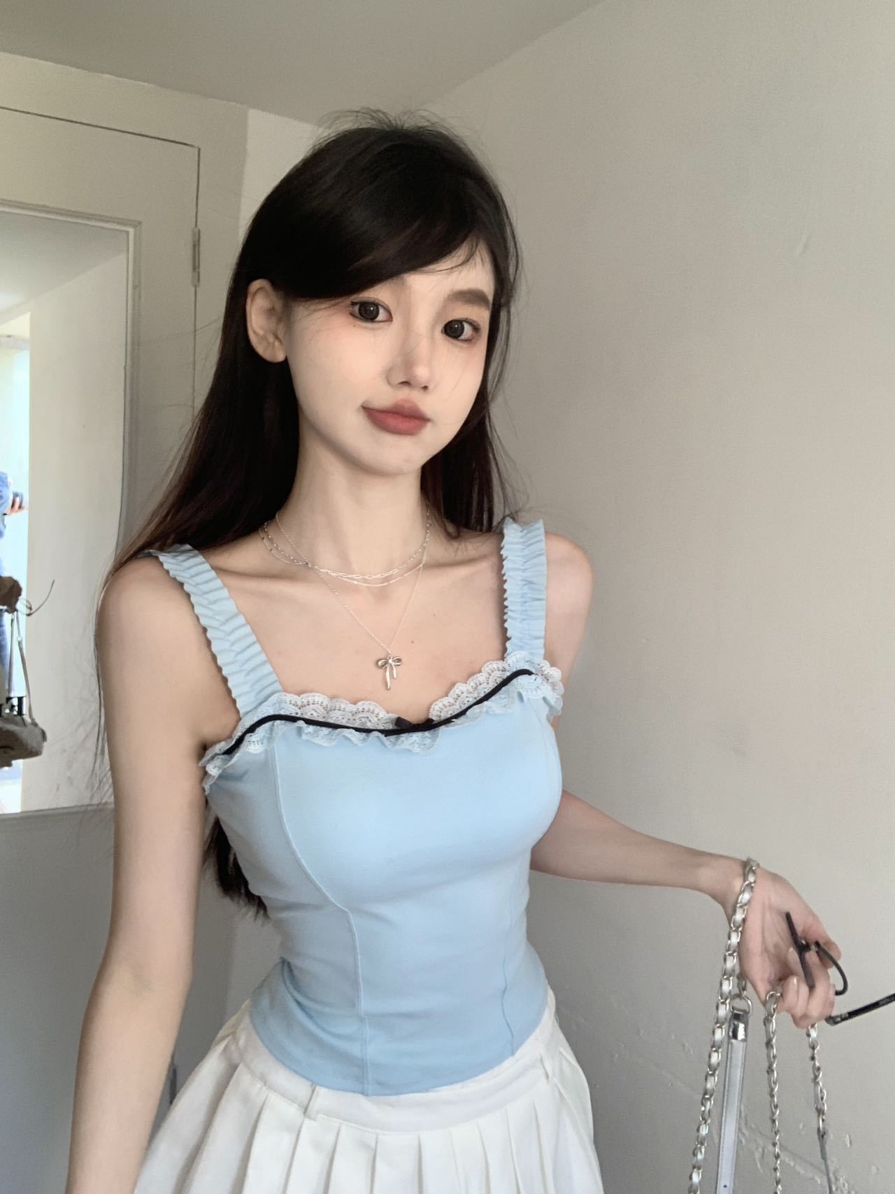1846 # # 여름 신선한 디자인 주름 레이스 디자인 올 매치 슬림 핏 섹시한 민소매 슬링 여성
