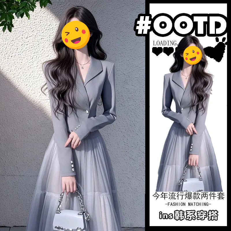 봄 2025 가벼운 고급 고급 고급 느낌 기질 사교계 샤오 샹 스타일 그레이 세트 재킷 메쉬 스커트 세트스토어 가기