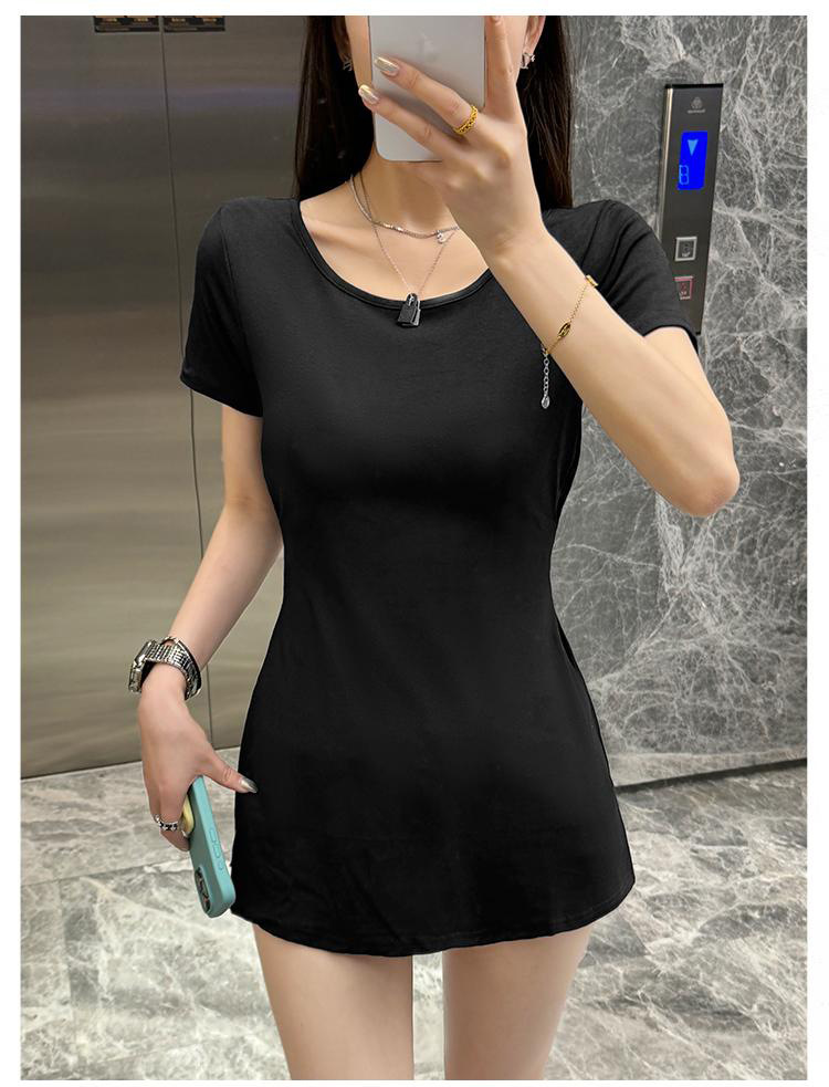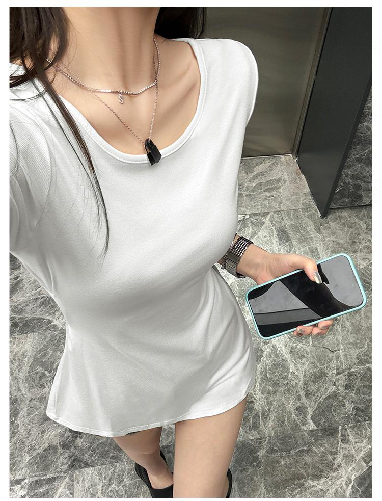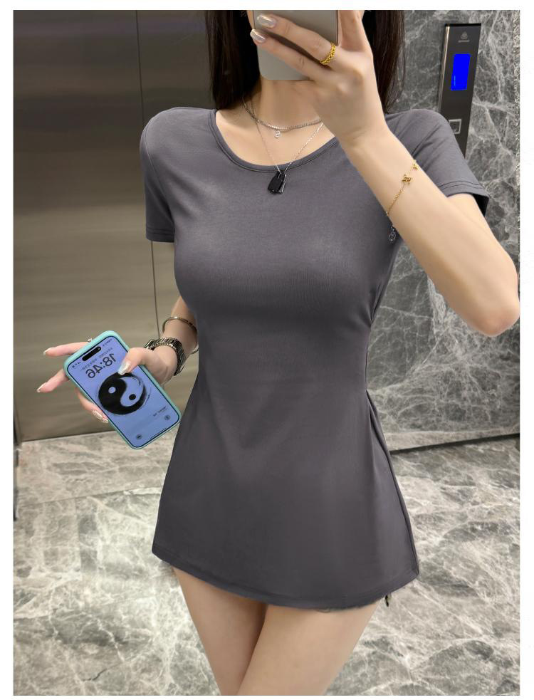 한국 스타일의 우아한 단색 허리라인 반팔 티셔츠 여성용 2025 여름 신상 패션 중간 길이 슬림핏 어깨라인이 잘 드러나는 탑