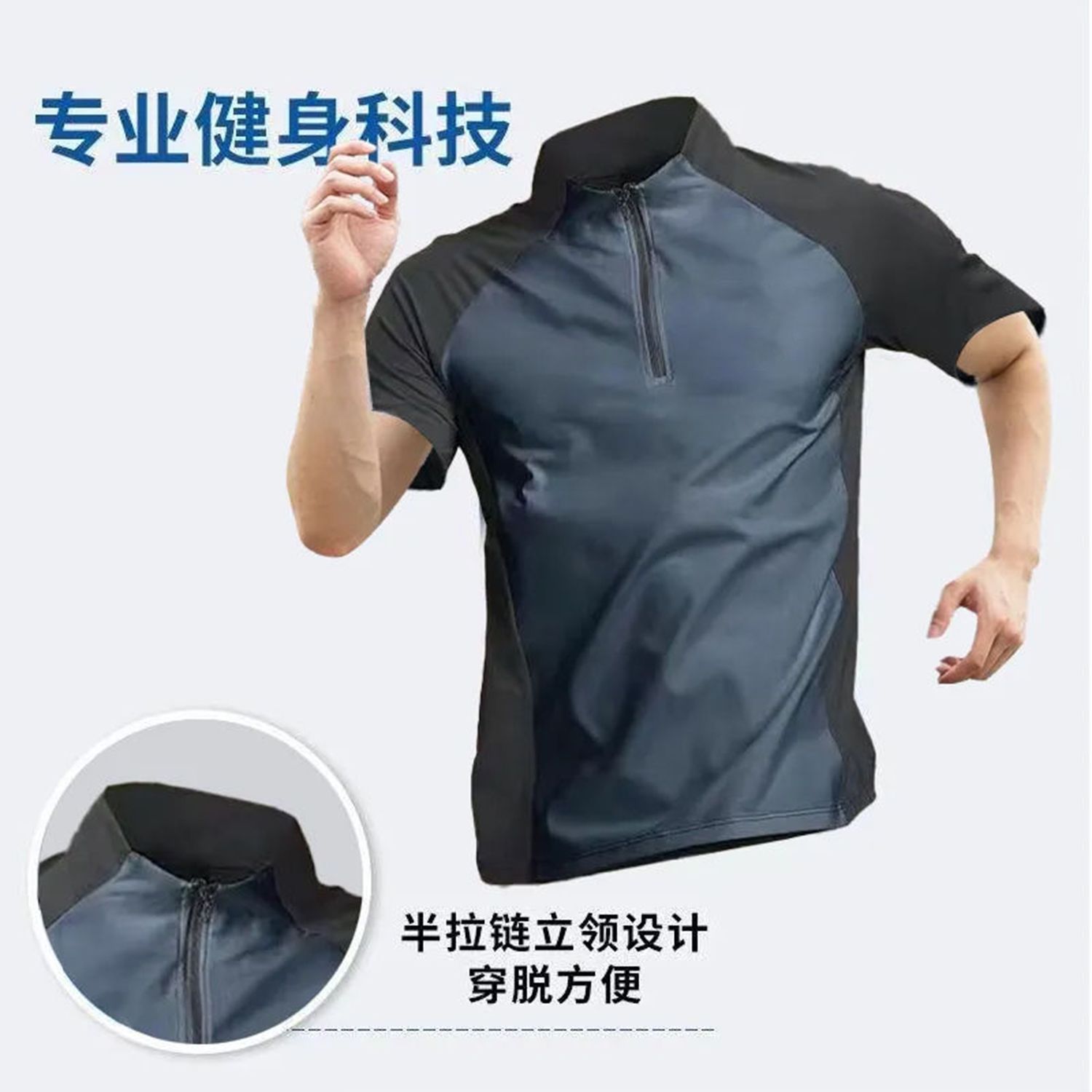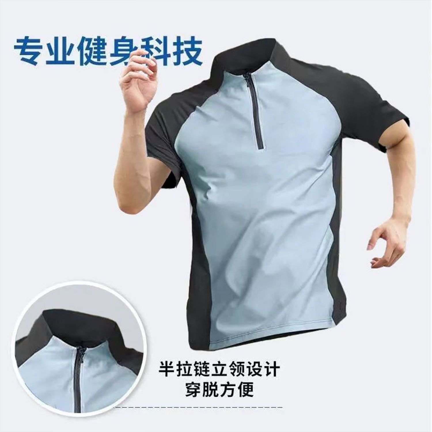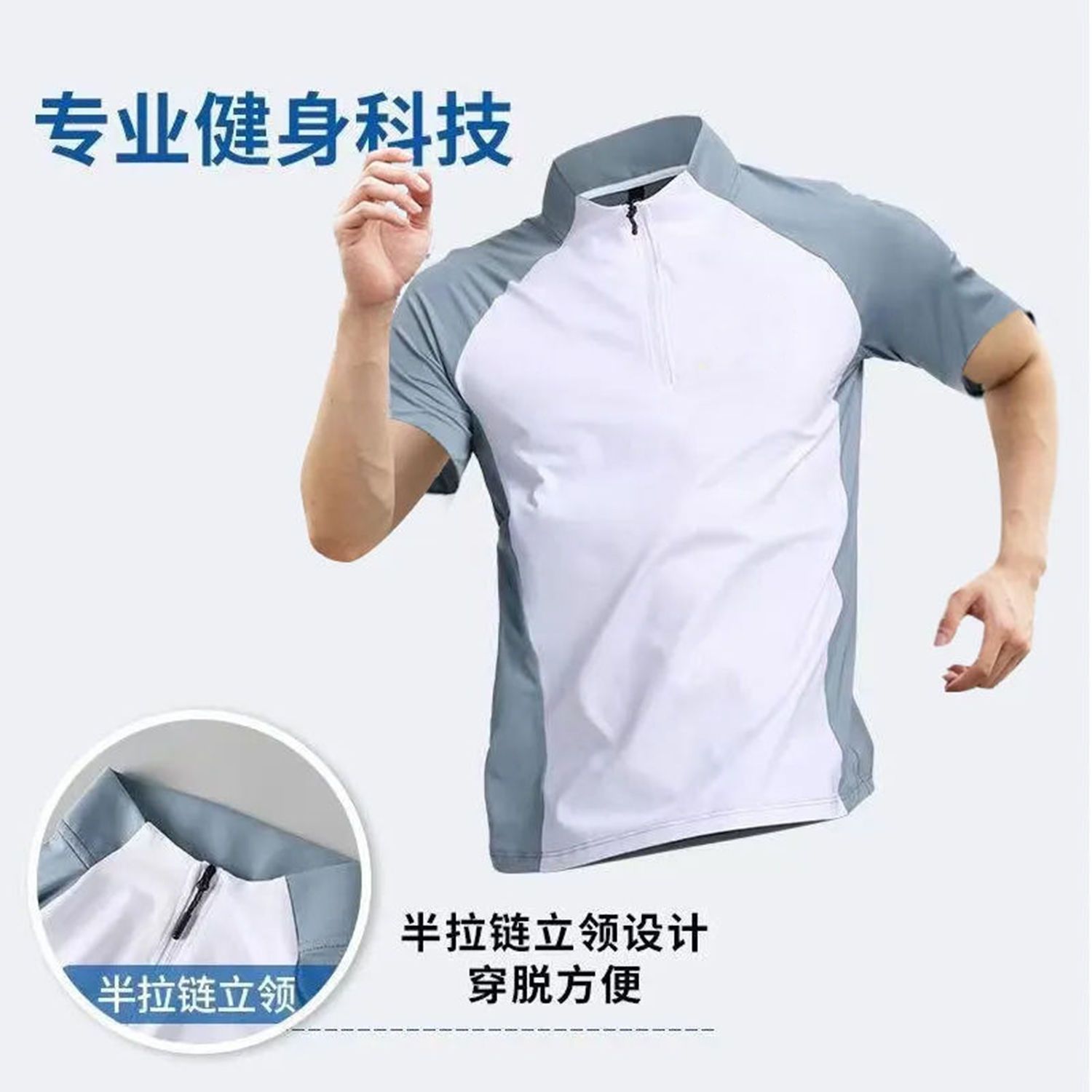 수직 칼라 및 반 지퍼 짧은 소매 훈련이있는 포괄적 인 훈련 옷 땀 흡수성 빠른 건조 옷 스티칭 대비 컬러 스포츠 달리기 피트니스 옷스토어 가기