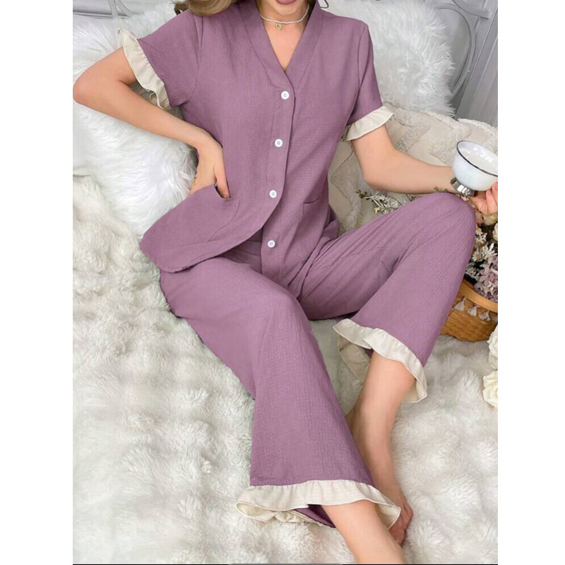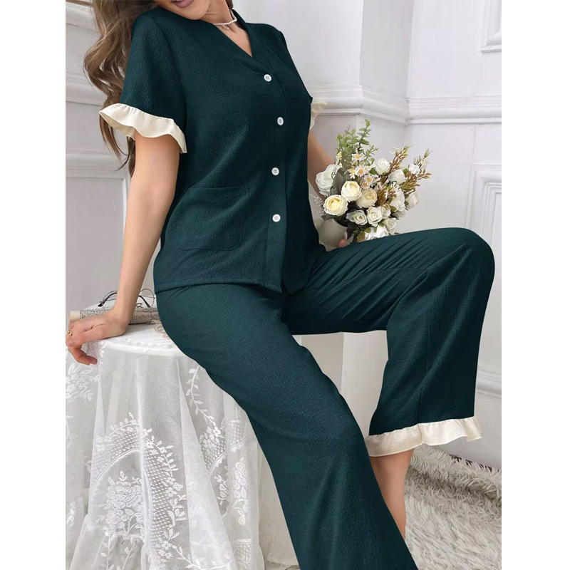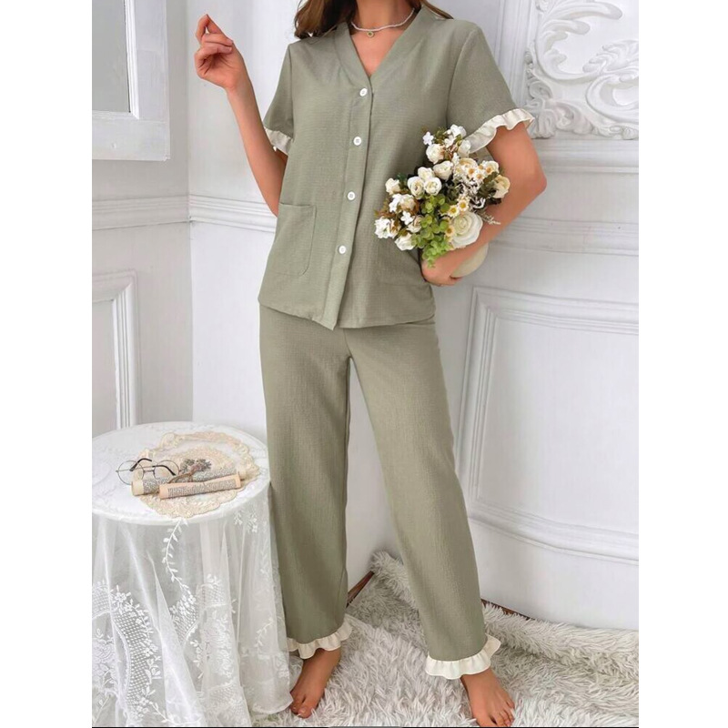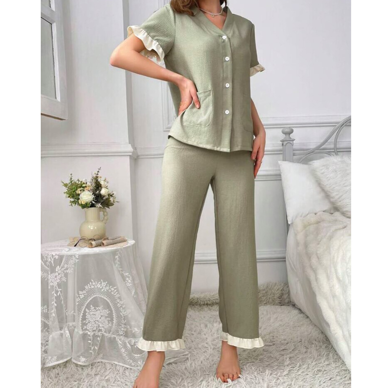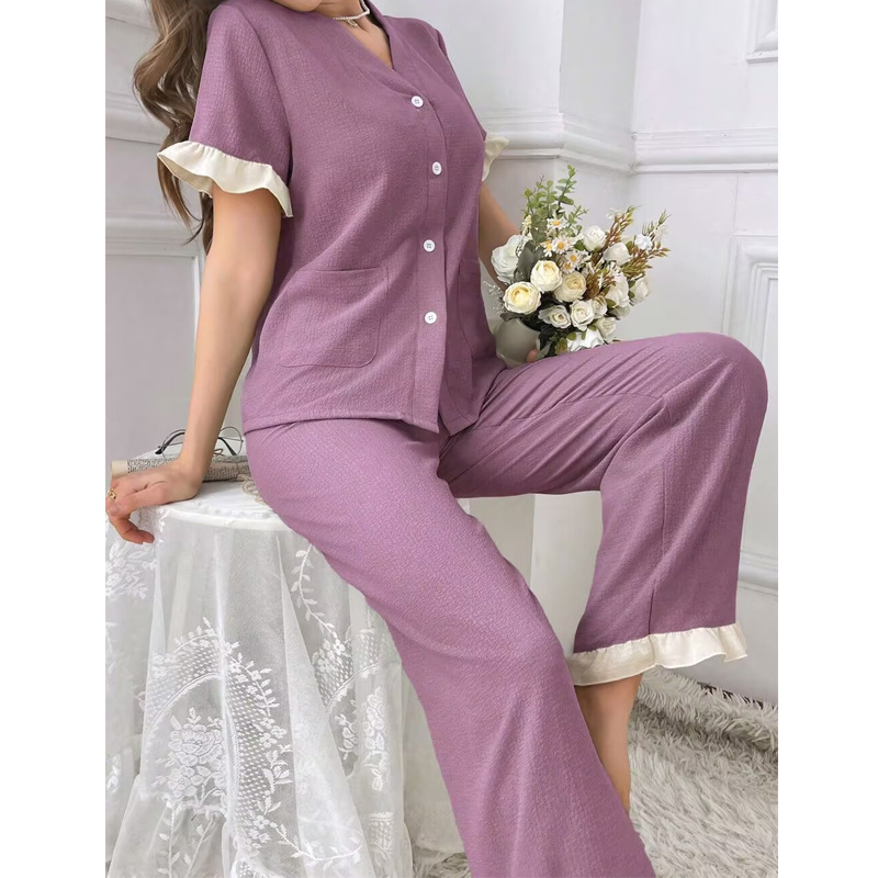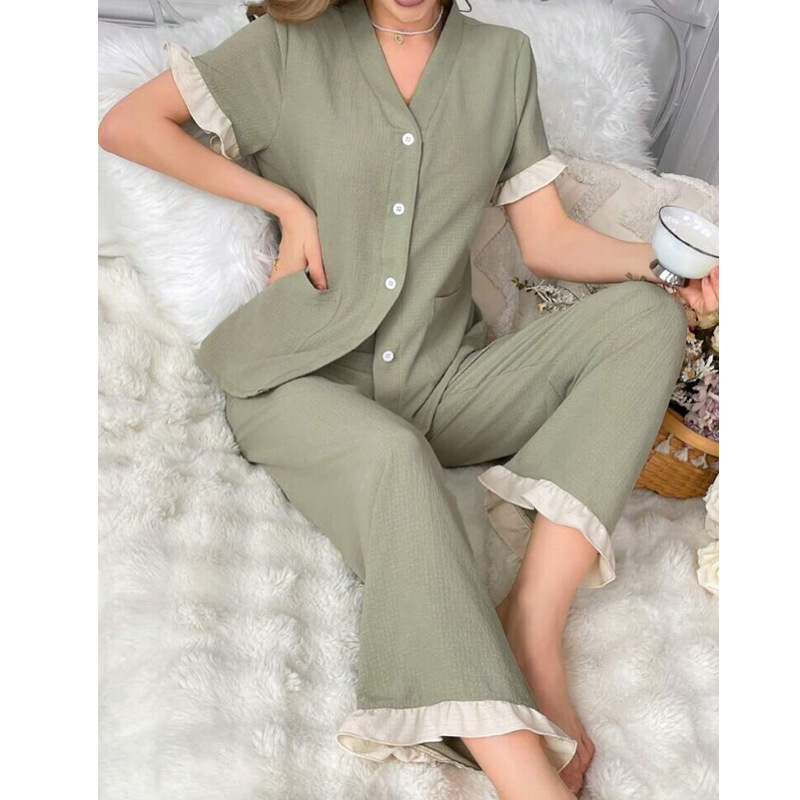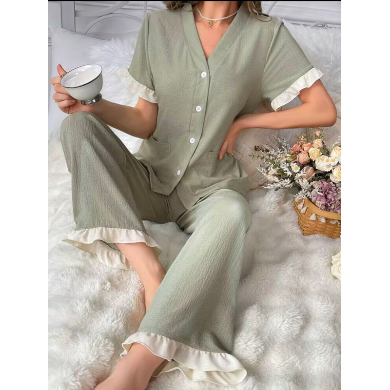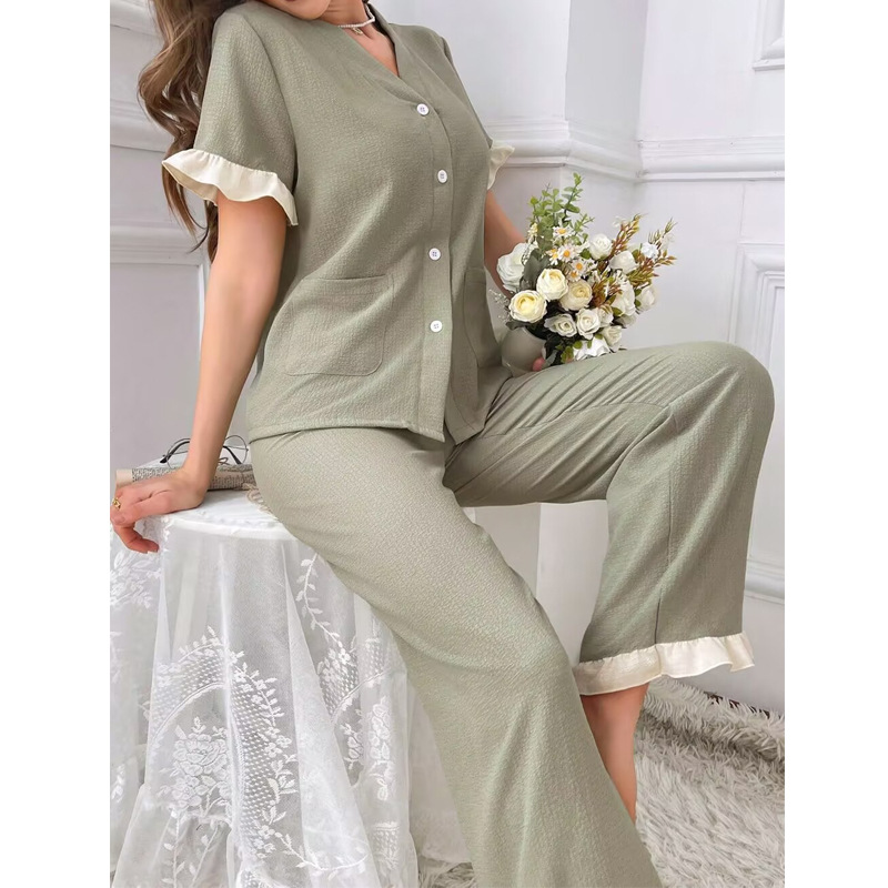 2025 봄과 여름 유럽과 미국 스타일의 칼라리스 버튼 셔츠 잠옷 투피스 세트를 세트 새로운 편안한 가정용 의류스토어 가기