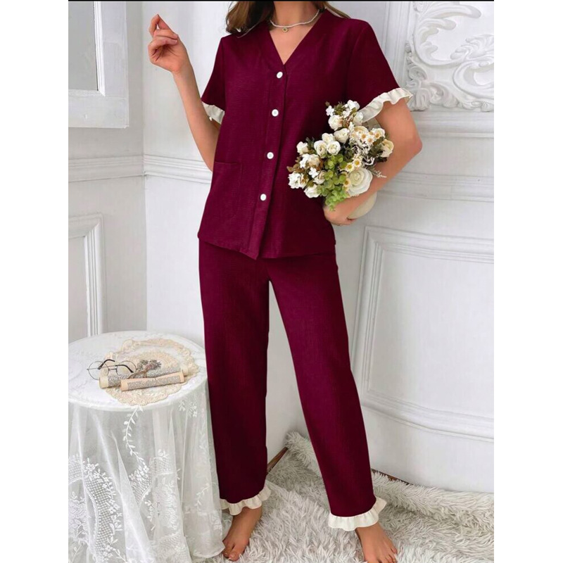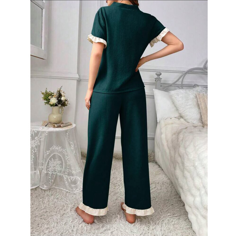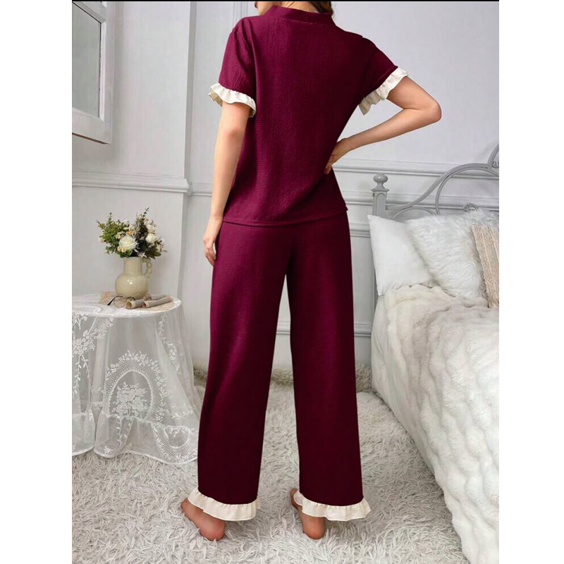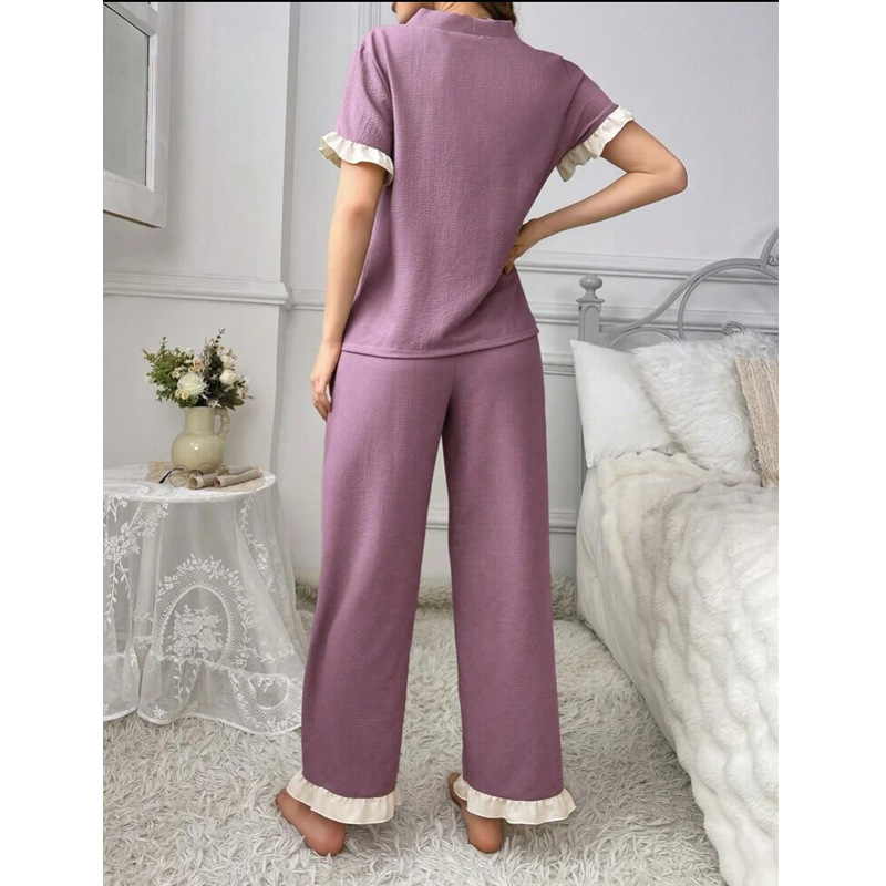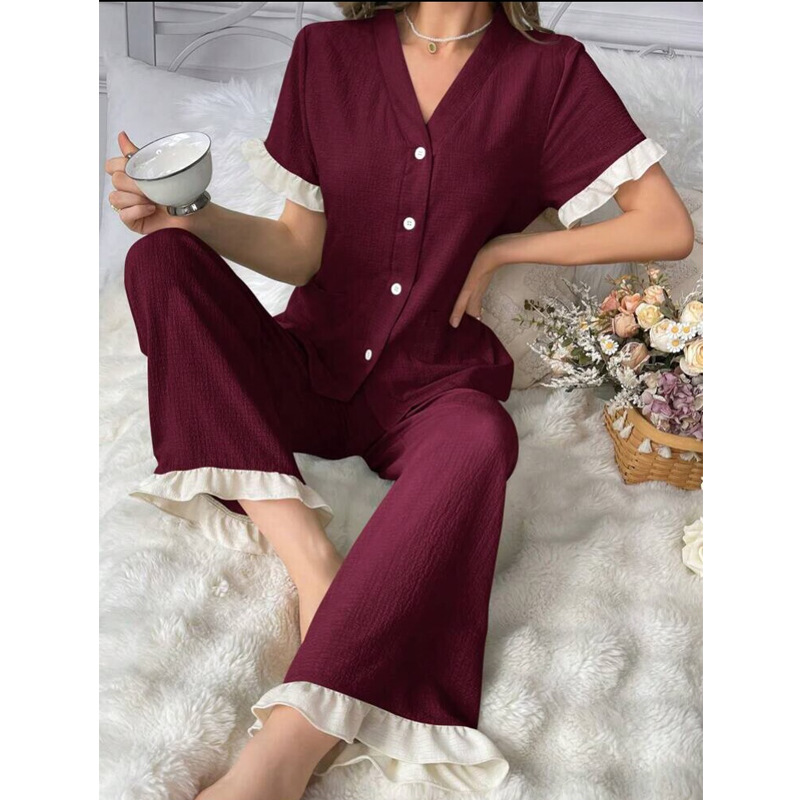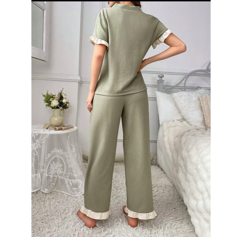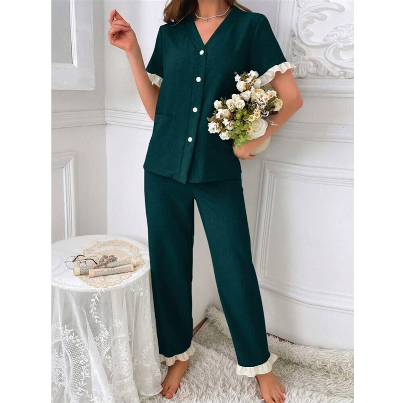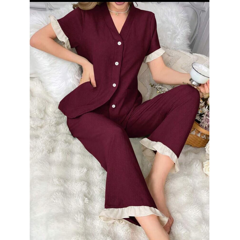2025 봄과 여름 유럽과 미국 스타일의 칼라리스 버튼 셔츠 잠옷 투피스 세트를 세트 새로운 편안한 가정용 의류스토어 가기